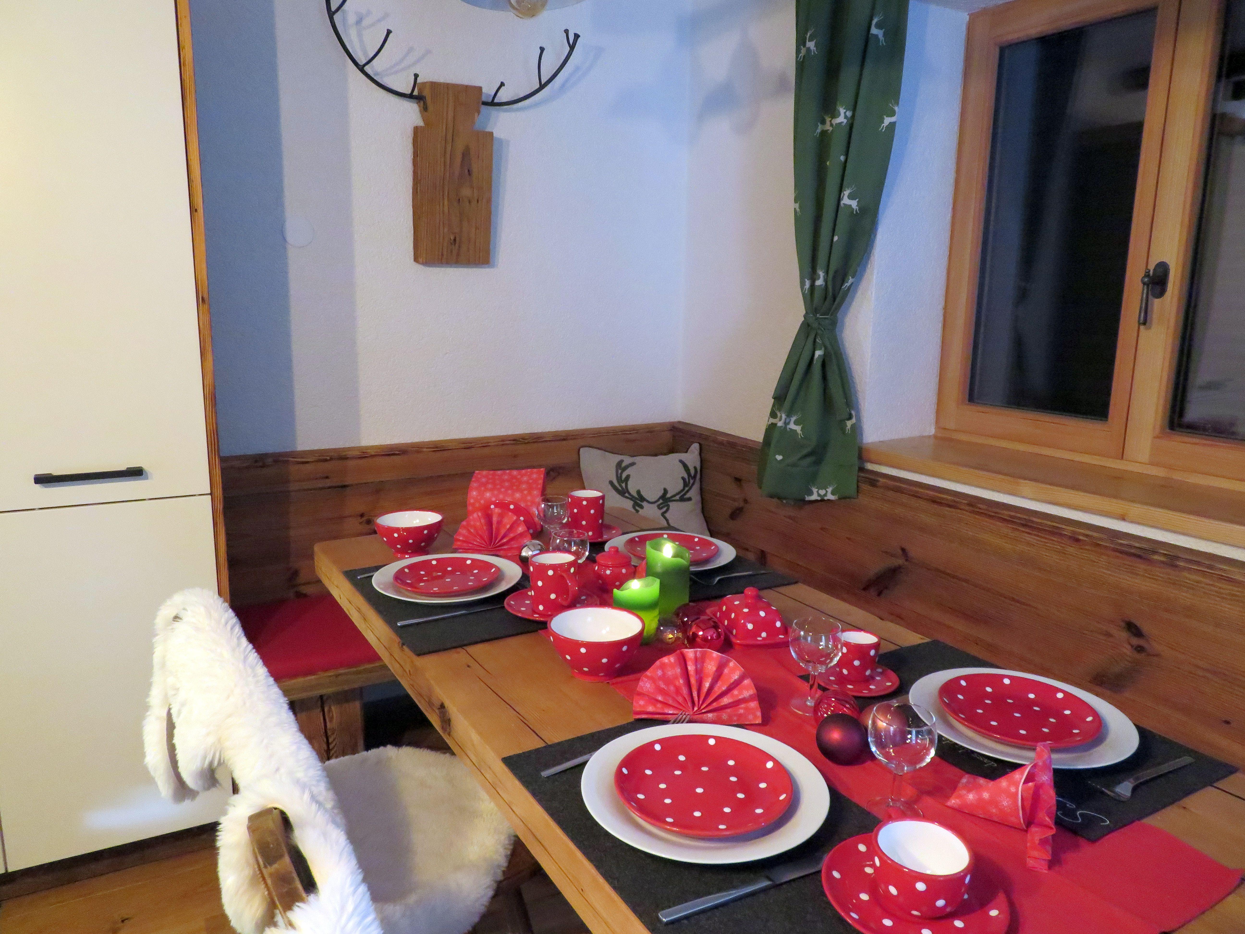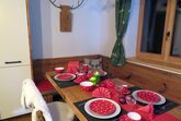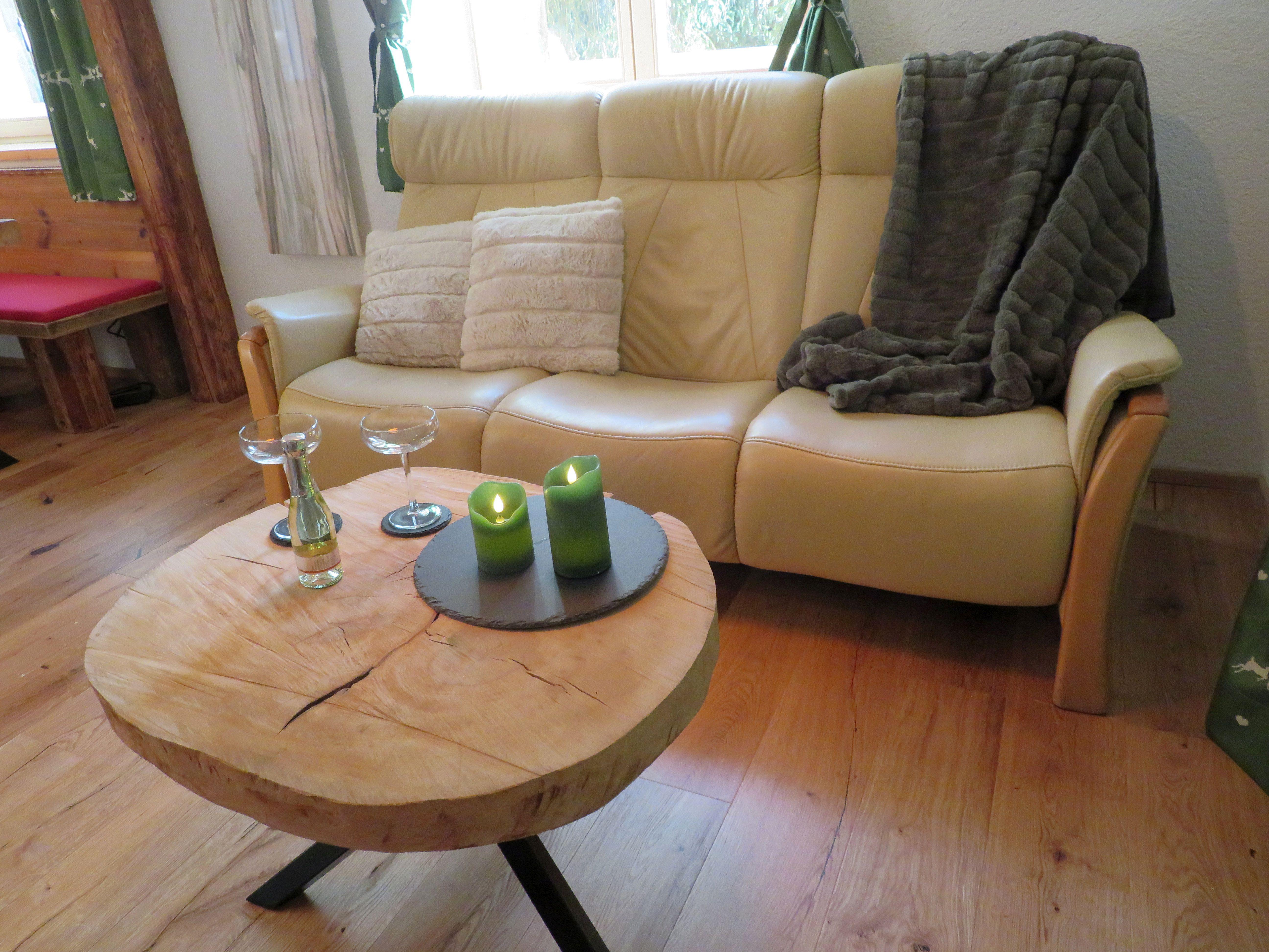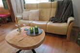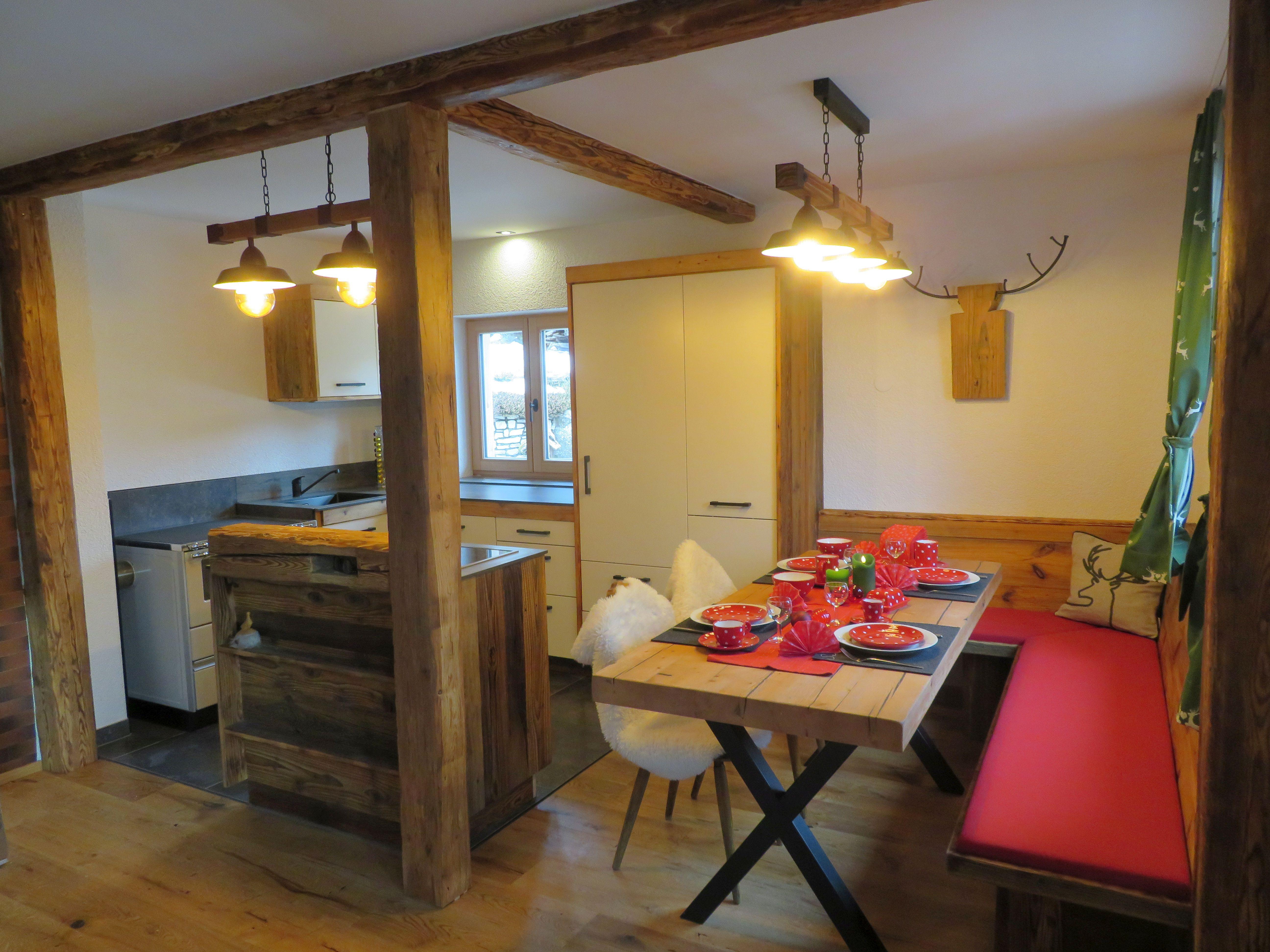 Ein Badezimmer mit Dusche und WC. Die liebevoll gestaltete Wohnküche mit Holzherd ladet zur Selbstversorgung ein. Beim gemütlichen Essen, werfe einen Blick auf den Esstisch. Das abgetragene Dachstuhlholz wurde gerettet und zum Tisch verarbeitet.