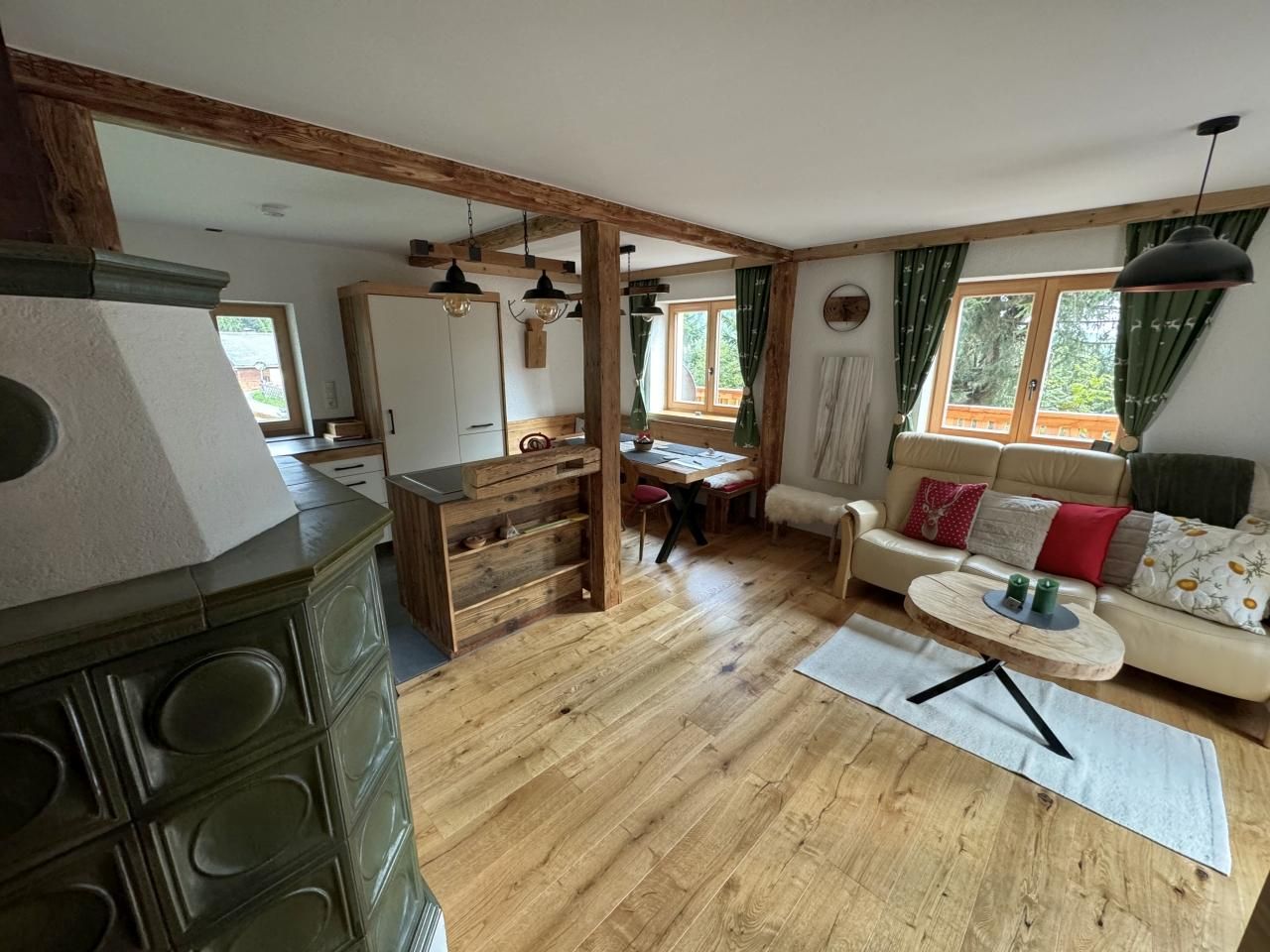 Das gemütliche Wohnzimmer mit Kachelofen bietet einen wunderschönen Blick in die umliegende Bergwelt.
