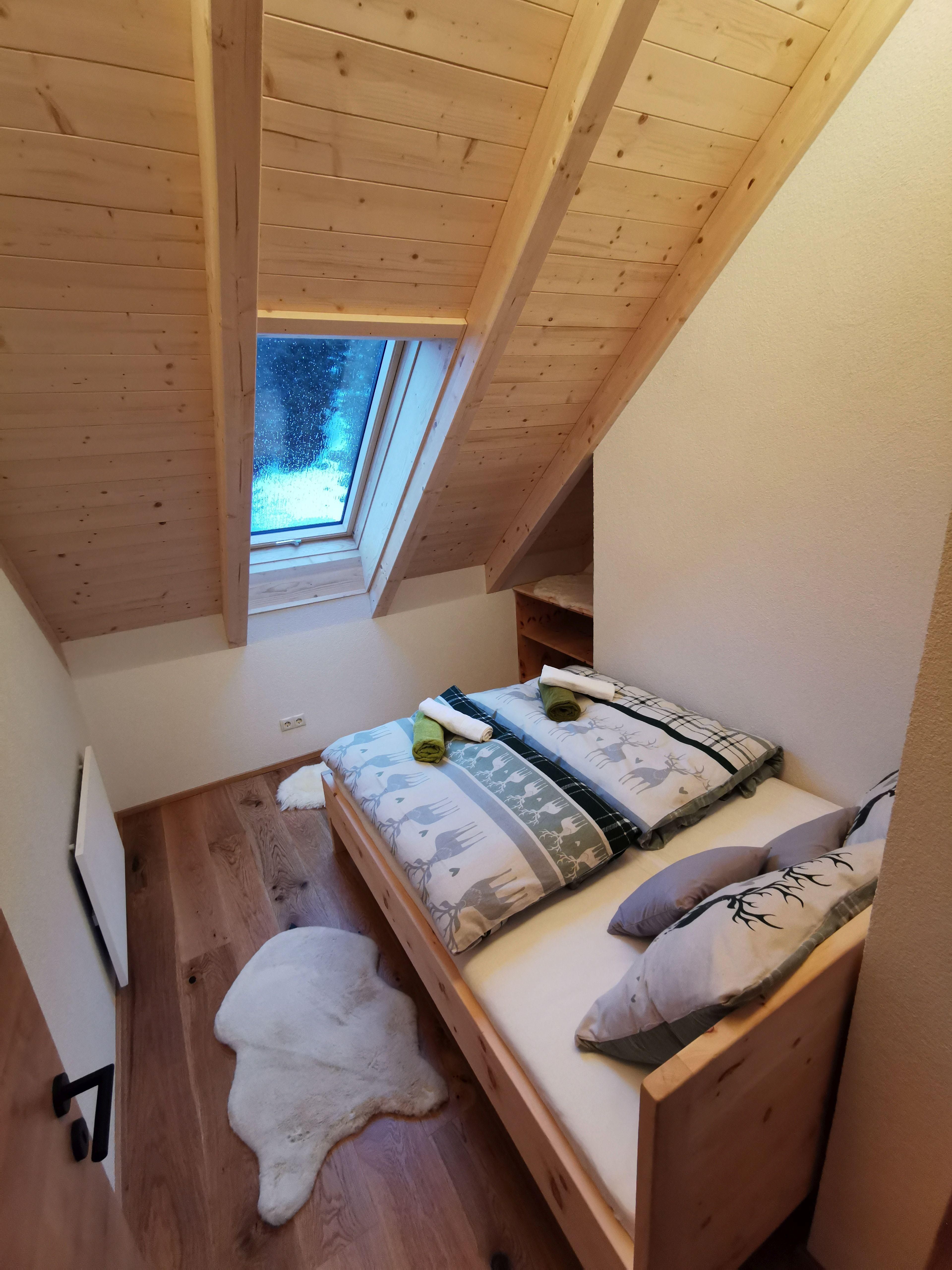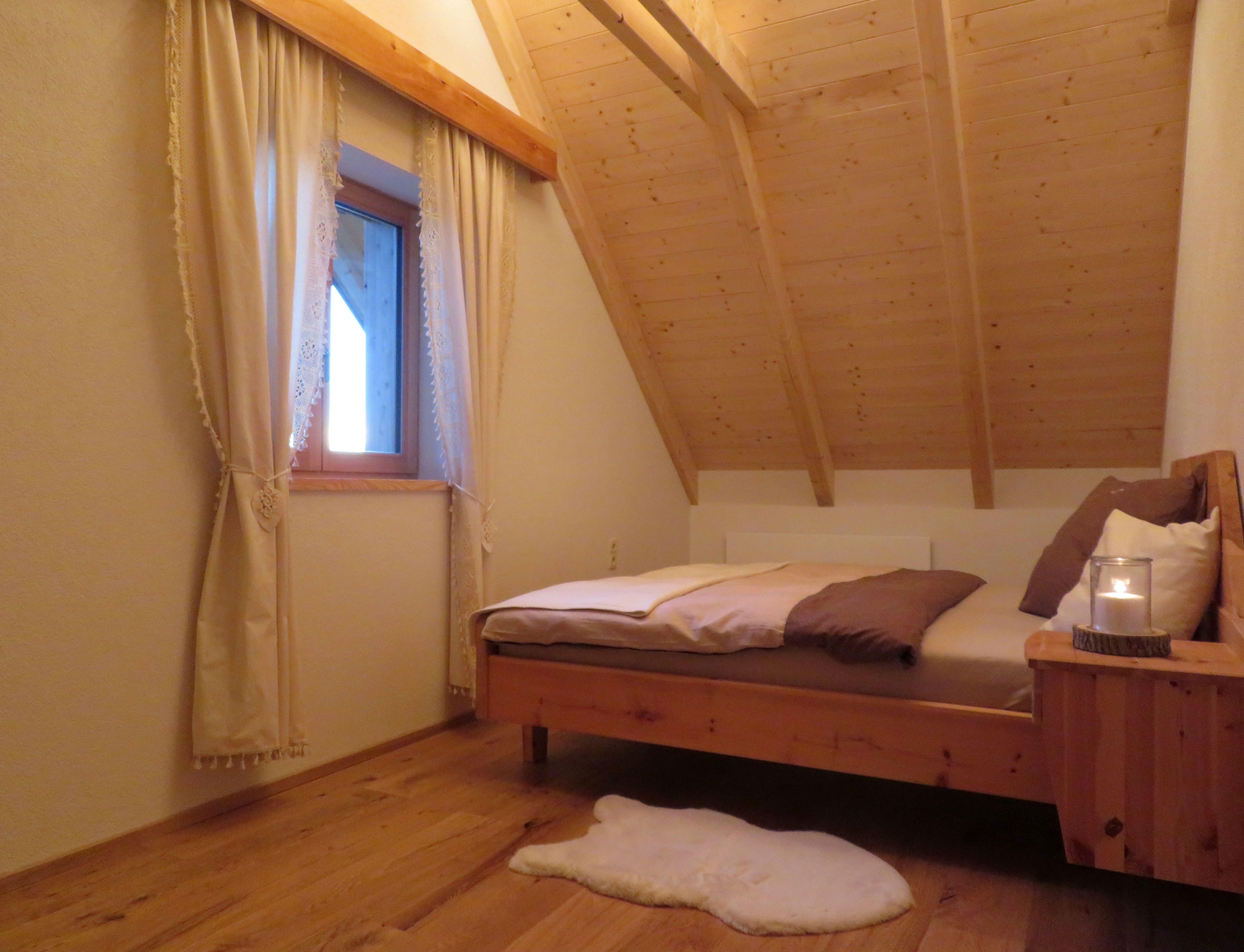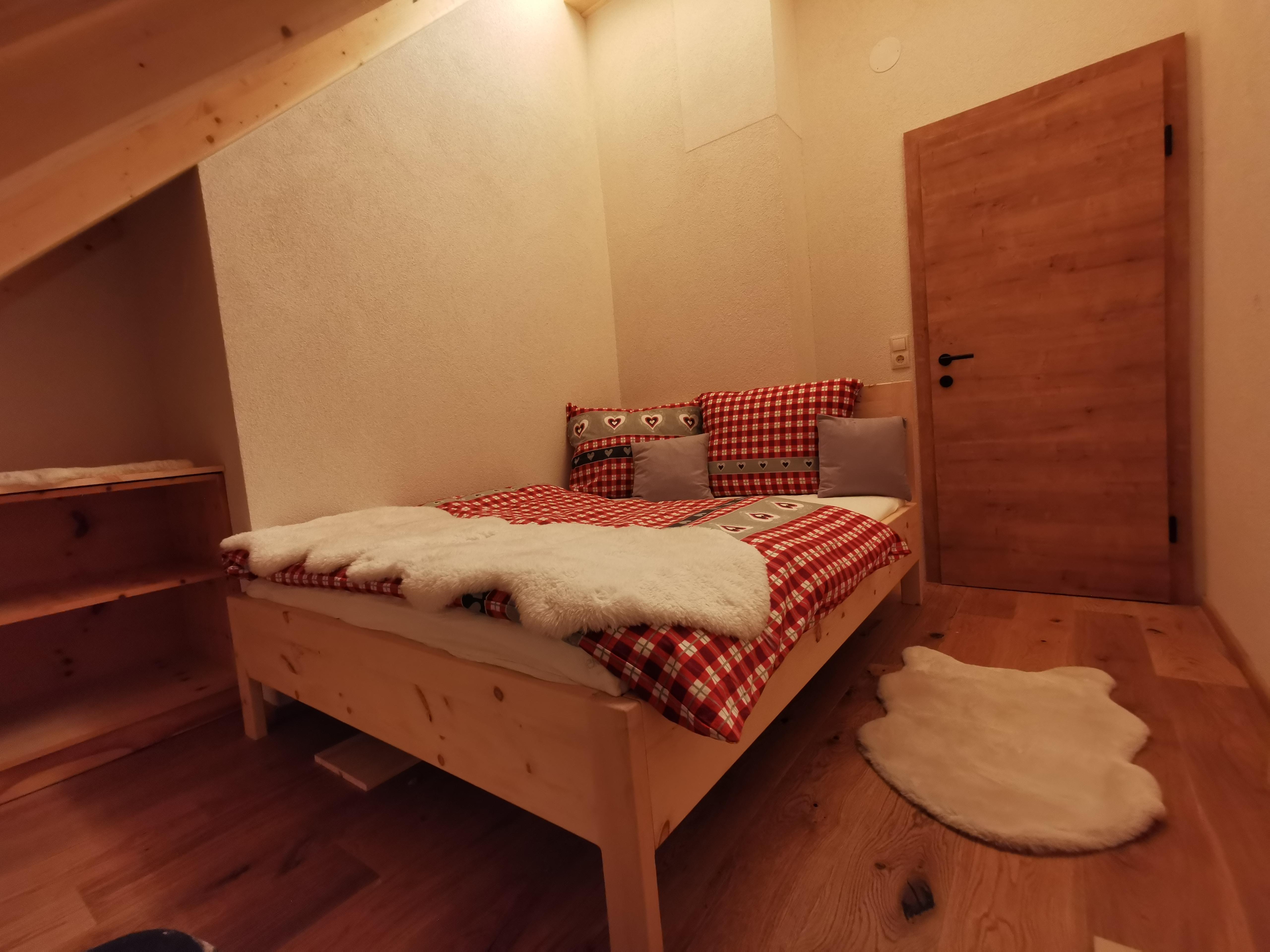 Das Almhaus verfügt über 2 Schlafzimmer im Obergeschoß. Die Schlafräume sind mit Massivholzbetten aus heimischen Zirbenholz ausgestattet. Die duftenden ätherischen Öle des Holzes wirken beruhigend und versprechen einen tiefen, erholsamen Schlaf.