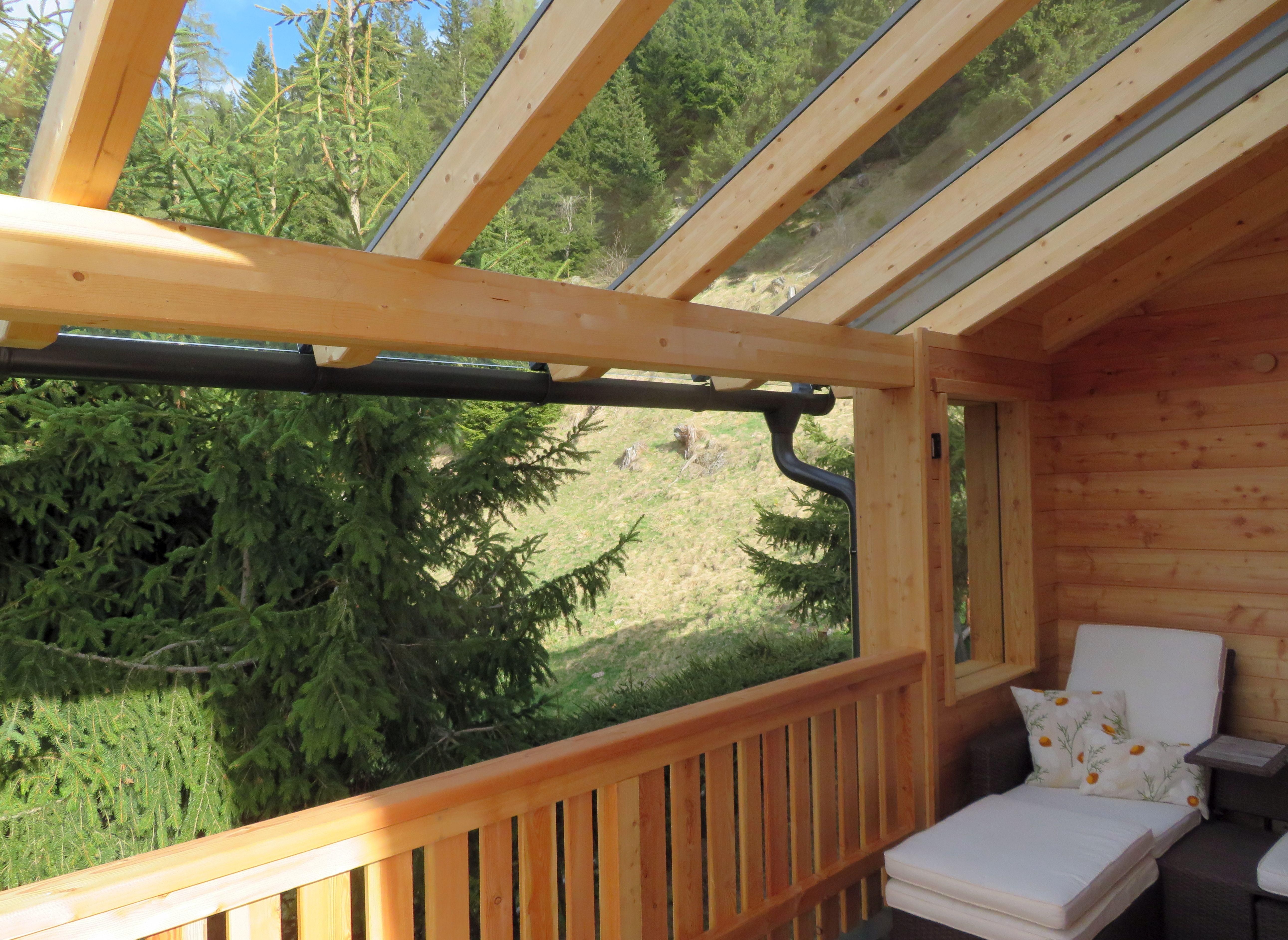Der Balkon mit der überdachten Winterlounge ist ein gemütliches Plätzchen um bei einer Tasse Tee das Winterparadies zu genießen.