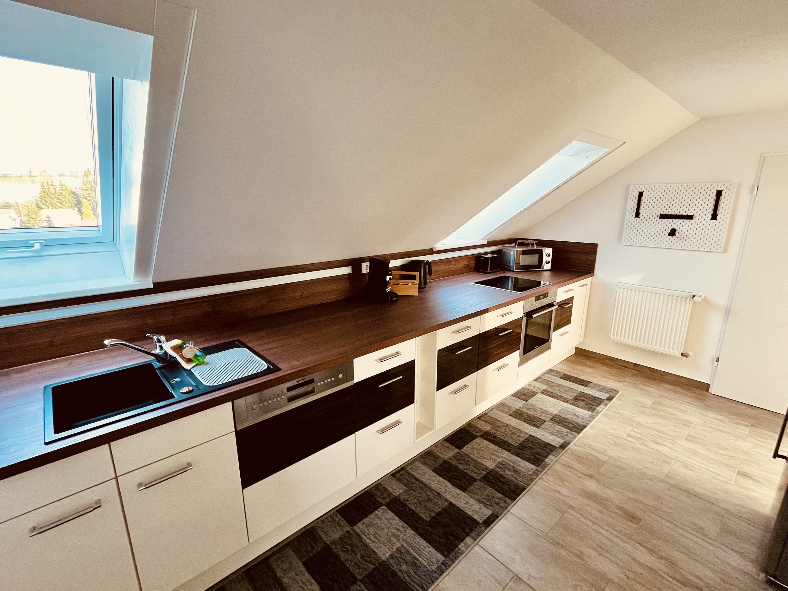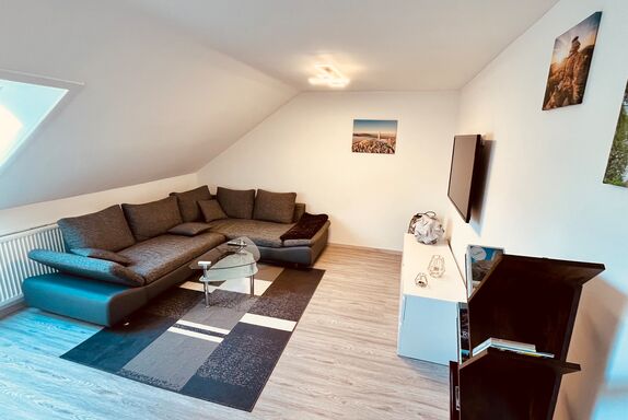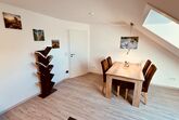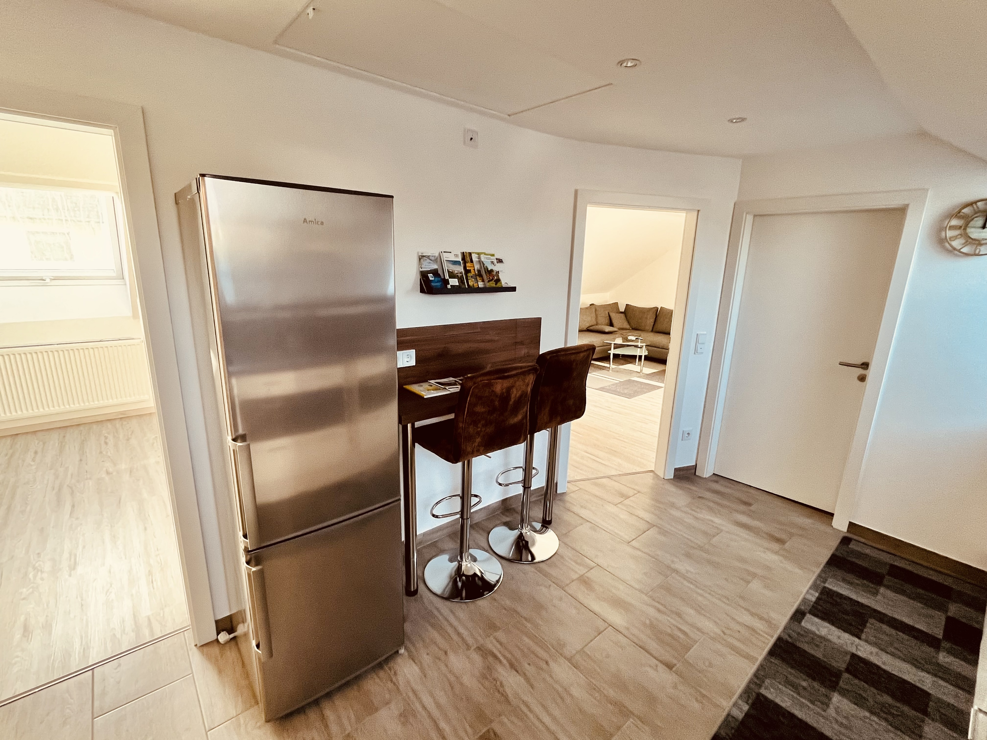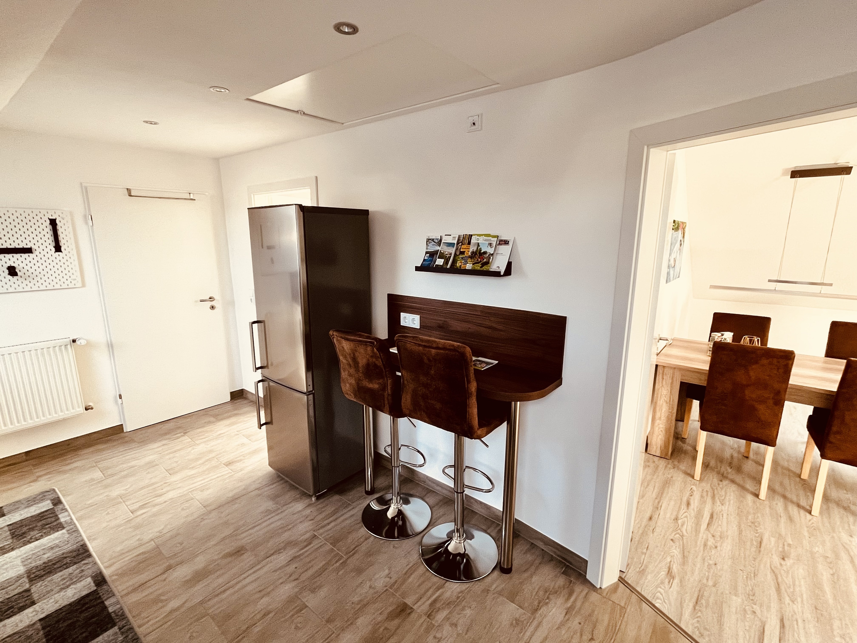 Unsere neu ausgebaute Ferienwohnung mit 75m² Wohnfläche bietet Platz für 1-4 Personen. Das gemütliche Wohn- und Esszimmer mit einem geräumigen Essbereich, großem Sofa und Flachbild-TV lädt zum Verweilen ein. Die komplett ausgestattete Küche mit Geschirrspüler, Kühlschrank inkl. Gefrierfach, Herd, Backofen, Mikrowelle, Wasserkocher, Eierkocher, Toaster und Kaffeepadmaschine lässt keine Wünsche offen. Außerdem ist auch hier ein kleiner Sitzbereich mit Barhockern vorhanden.