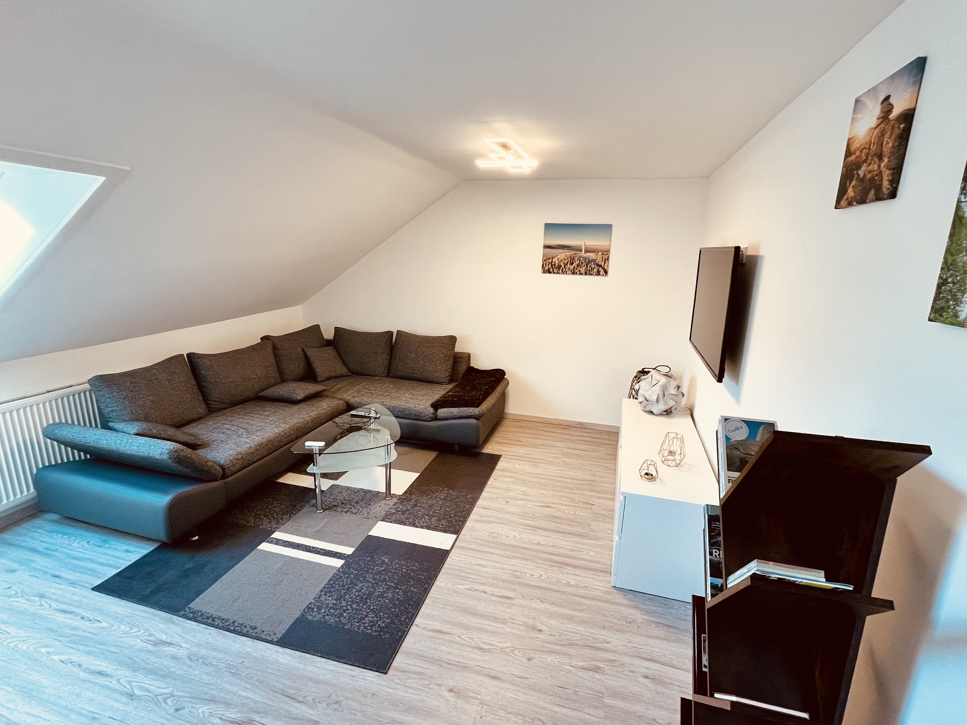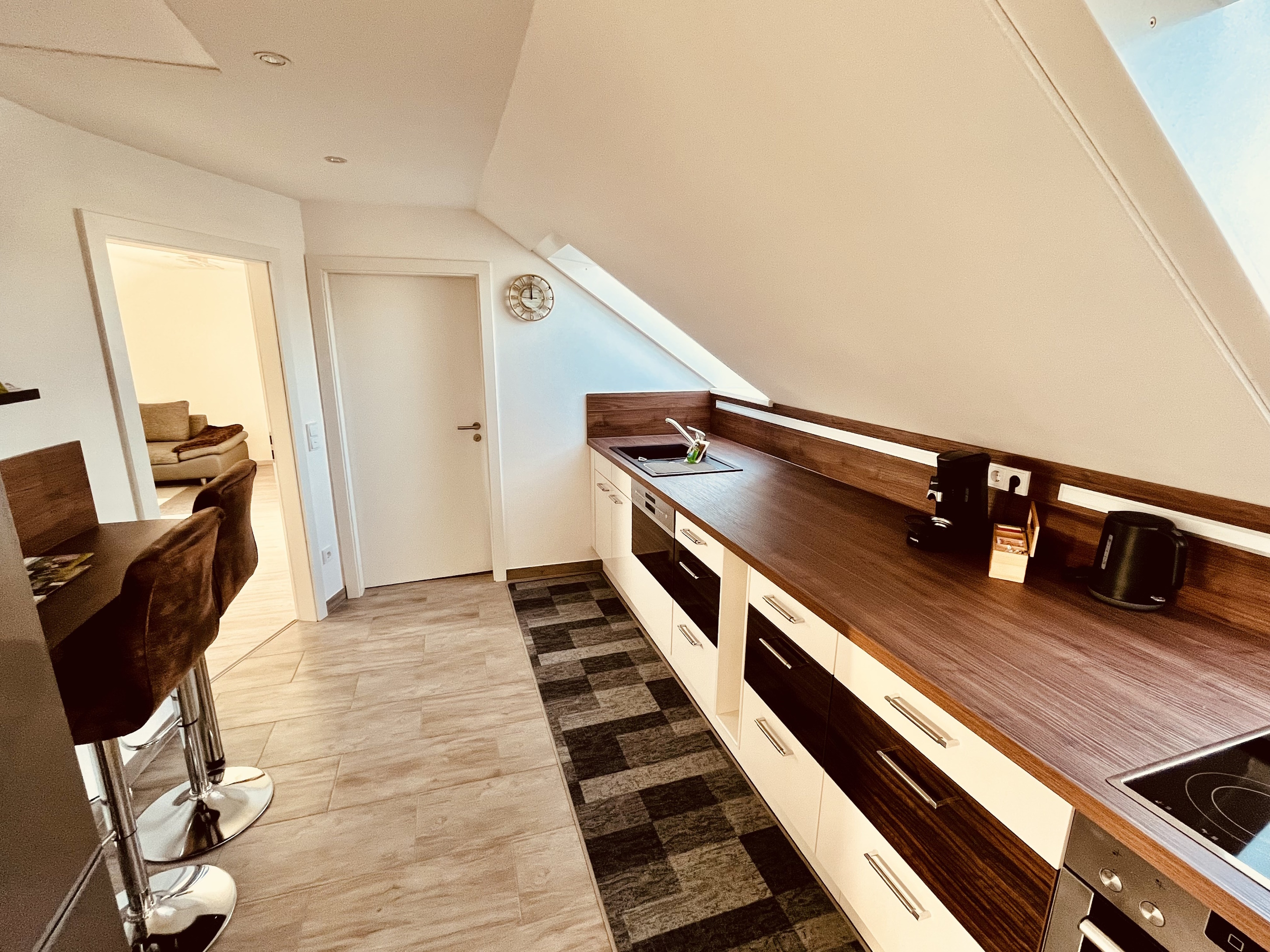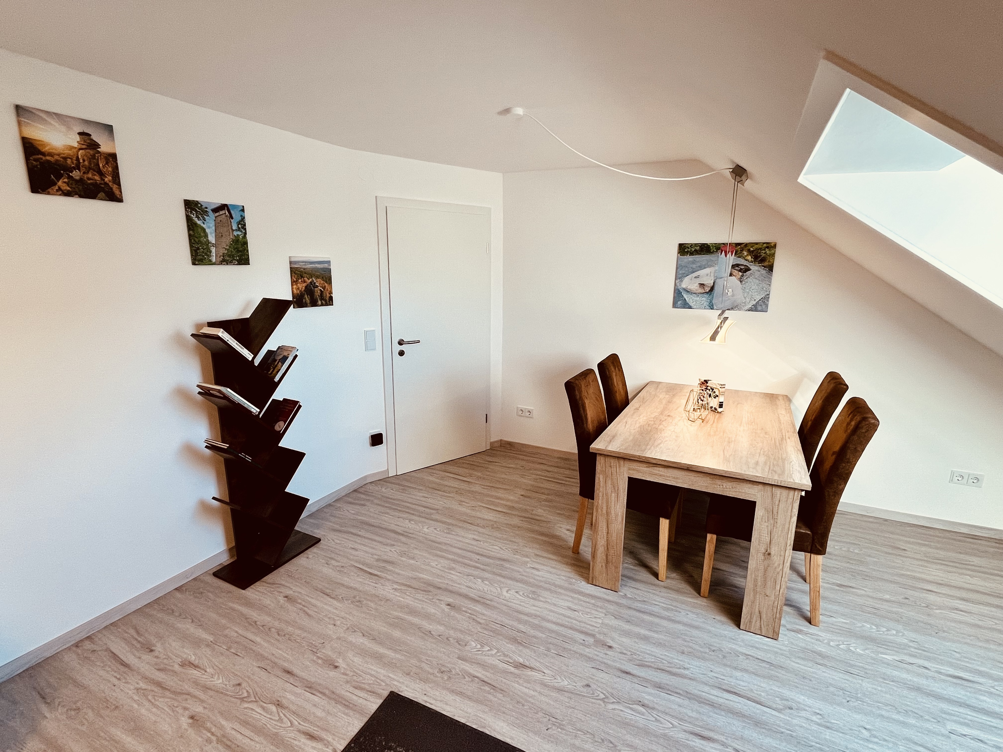 Unsere neu ausgebaute Ferienwohnung mit 75m² Wohnfläche bietet Platz für 1-4 Personen. Das gemütliche Wohn- und Esszimmer mit einem geräumigen Essbereich, großem Sofa und Flachbild-TV lädt zum Verweilen ein. Die komplett ausgestattete Küche mit Geschirrspüler, Kühlschrank inkl. Gefrierfach, Herd, Backofen, Mikrowelle, Wasserkocher, Eierkocher, Toaster und Kaffeepadmaschine lässt keine Wünsche offen. Außerdem ist auch hier ein kleiner Sitzbereich mit Barhockern vorhanden.