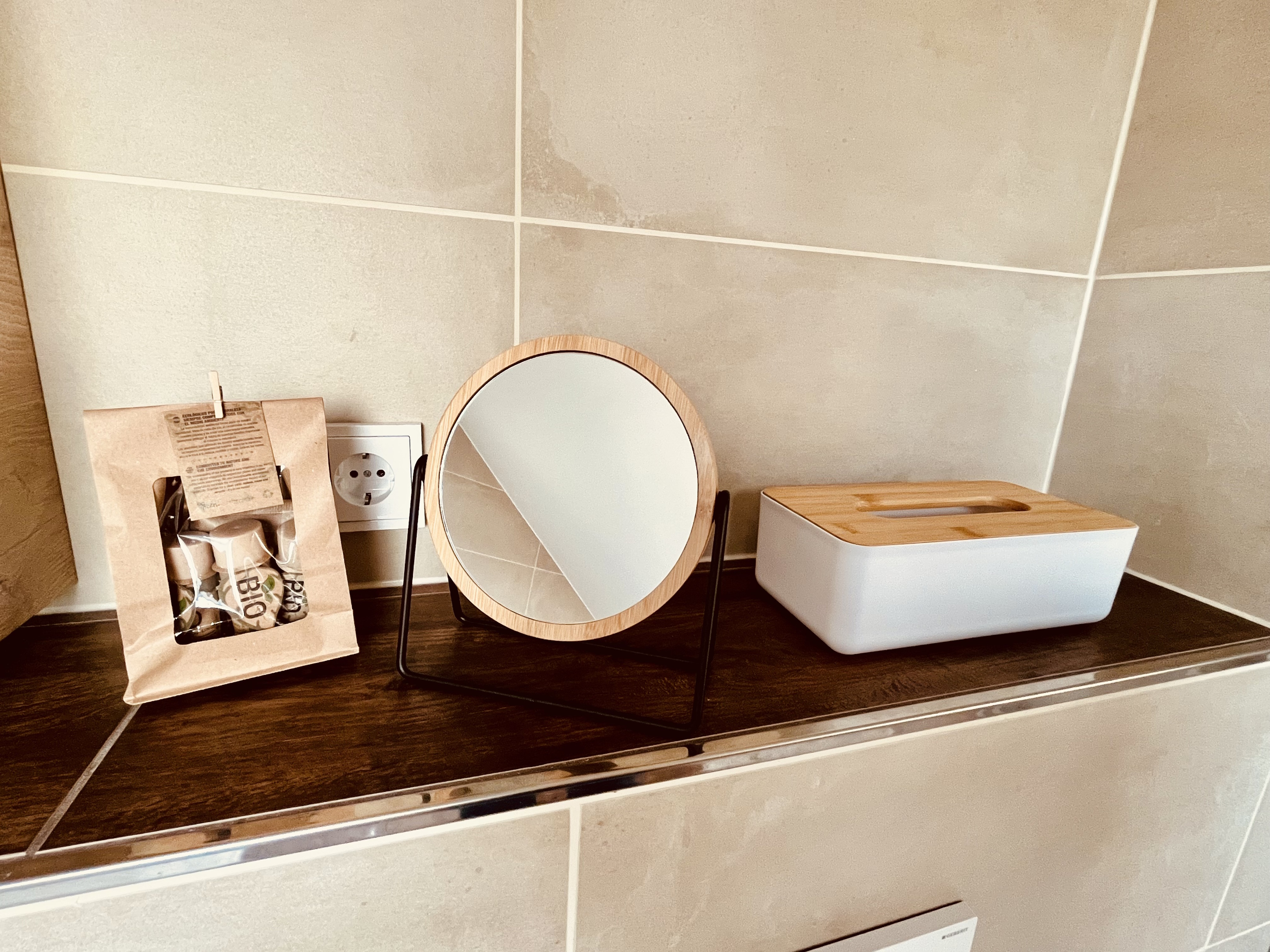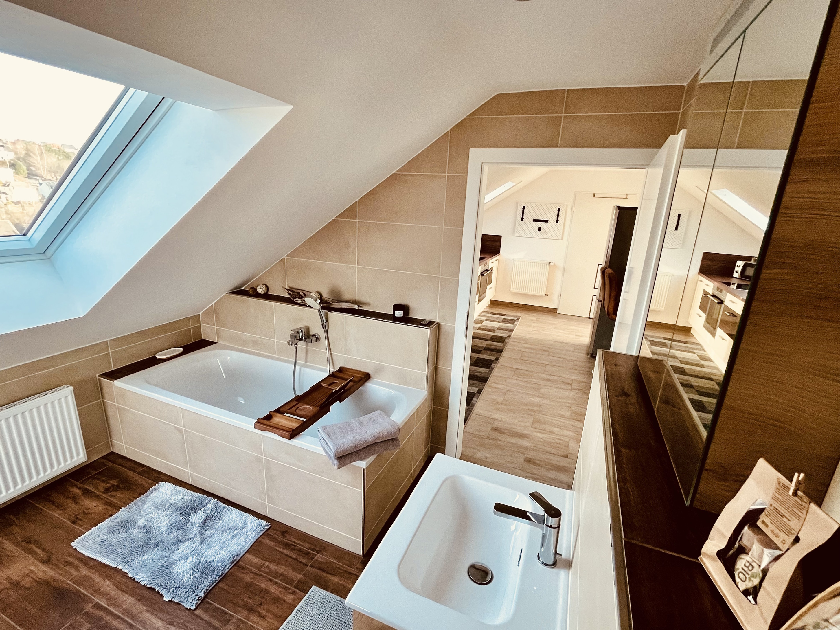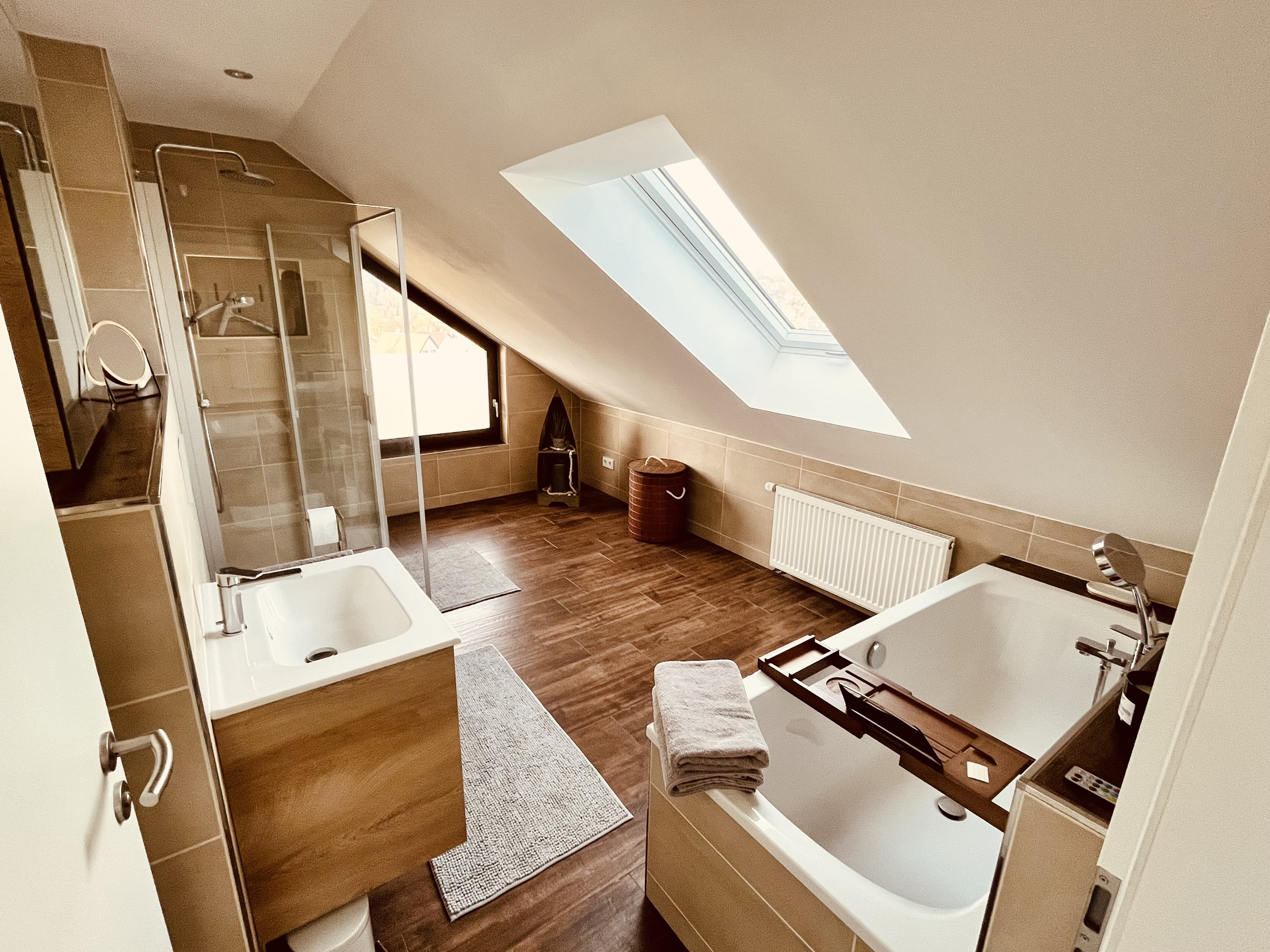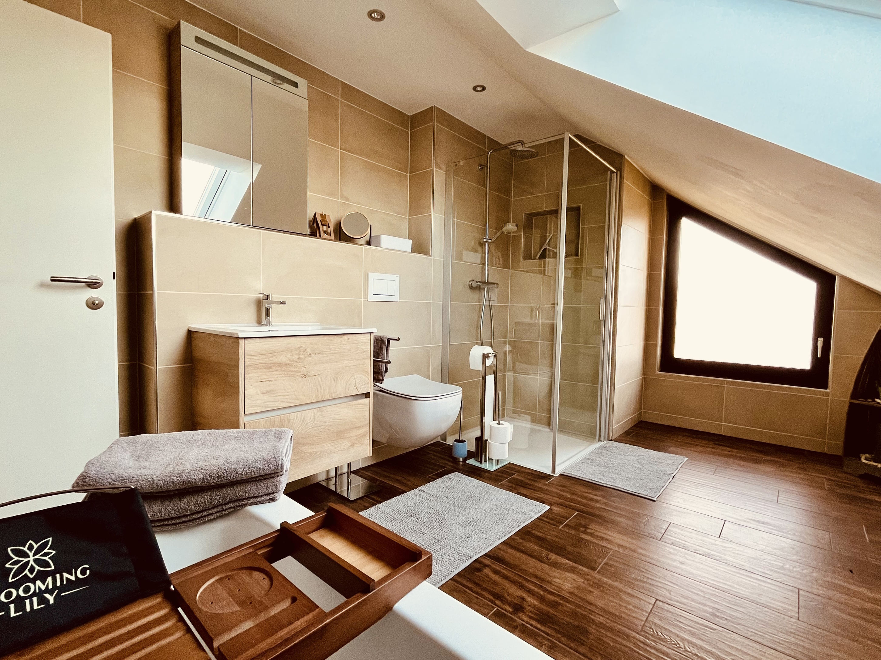 Das geräumige Badezimmer mit ebenerdiger Dusche, Badewanne, großem Spiegelschrank, Kosmetikspiegel und einem Föhn runden das Gesamtbild ab. Vor allem im Sommer können Sie entspannte Grillabende in unserem Garten verbringen.
