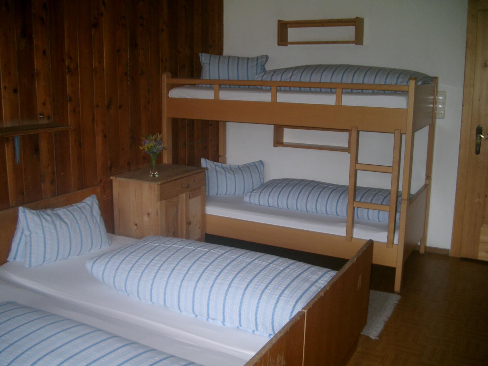 Mehrbettzimmer eingeteilt in 1 Etagenbett und 3 Einzelbetten. DU/WC befinden sich auf der Etage.