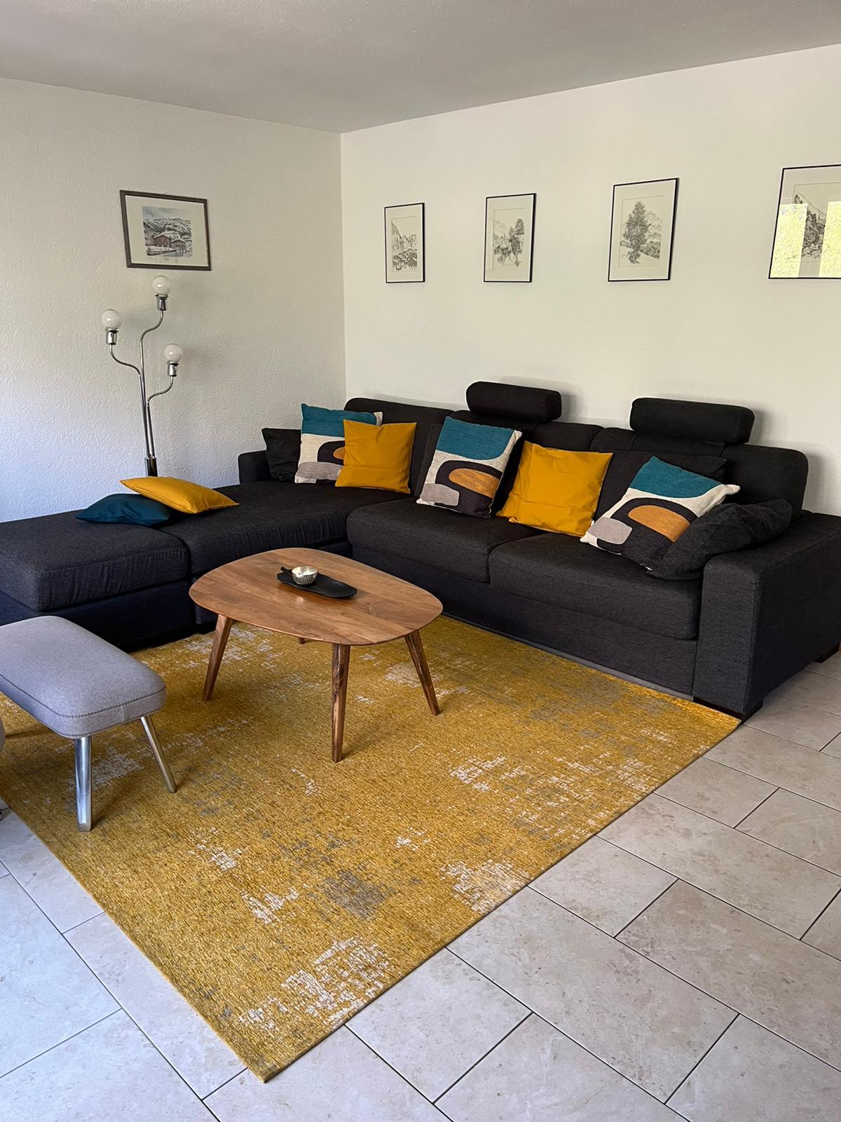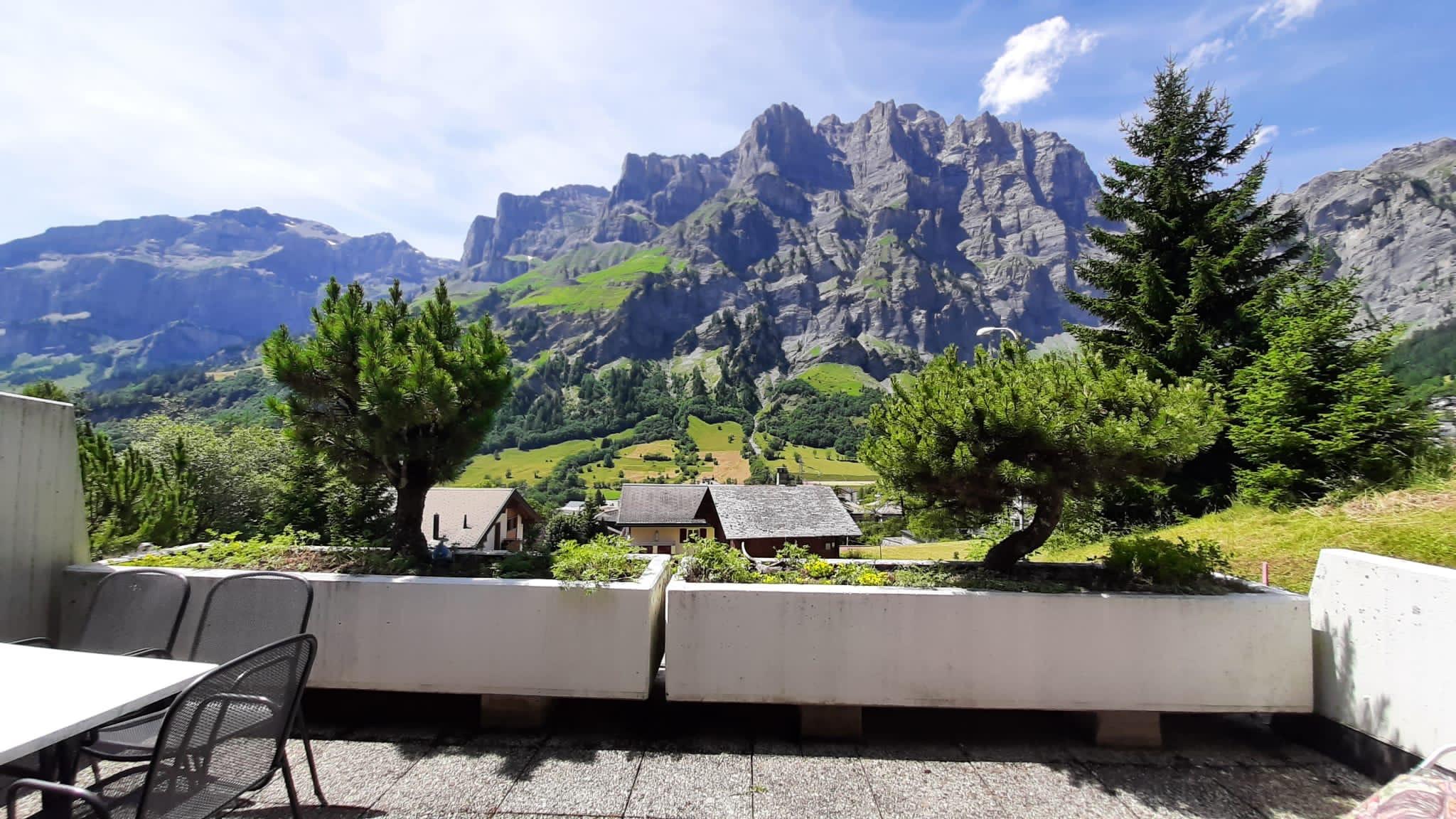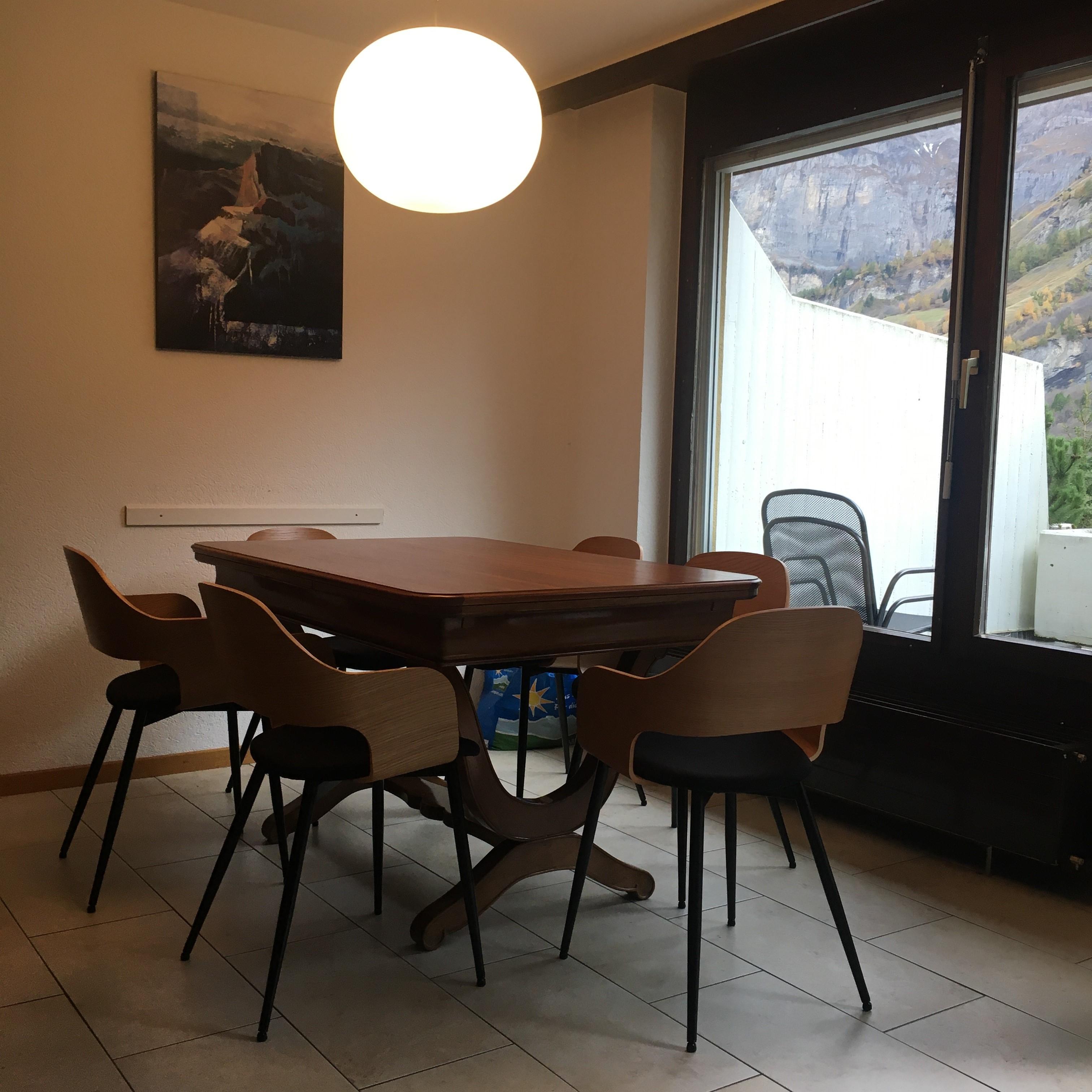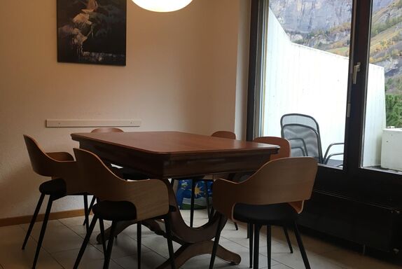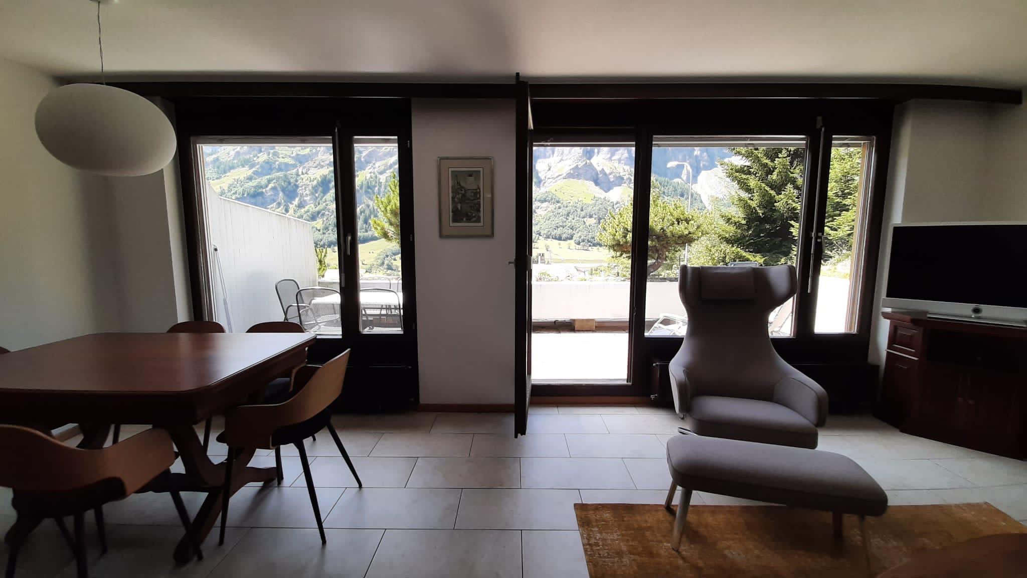 3-Zimmerwohnung (70m2), 1. Etage, renoviert im 2023: Grosses Wohn-/Esszimmer mit Doppel-Sofabett, gratis WiFi, offene Küche mit Geschirrspüler, Fondue-Set, Raclette-Set, Kapsel-Kaffemaschine (Nespresso) und Filter-Kaffemaschine, 1 Doppelschlafzimmer, 1 Schlafzimmer mit 1 Etagenbett plus Aussziehbett, Badezimmer und separates WC, TV, Radio, grosser Süd-Balkon mit Panoramaausblick. Aussenparkplatz inklusive. Nichtraucherwohnung! Haustiere nicht erlaubt! In nächster Nähe: Haltestelle Ortsbus Ring-Jet, Talstation Torrent-Luftseilbahn, Wanderparadis, Dorfzentrum, Thermal-Bäder, Geschäfte und Restaurants.