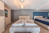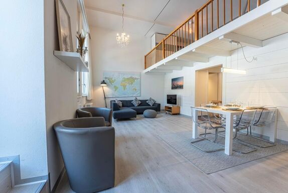 Im Inneren erwartet Sie ein großzügig geschnittener Wohnbereich, der durch seine offene Galerie von 28m² mit zwei komfortablen französischen Betten besticht. Die geschmackvolle Einrichtung und die ansprechende Raumaufteilung sorgen für eine angenehme Atmosphäre, in der bis zu vier Personen komfortabel wohnen können. Praktische Annehmlichkeiten wie eine mit einem 3-Platten-Herd, einer Kaffeemaschine, einer Espressokanne sowie einem Wasserkocher ausgestattete Küche und eine zur gemeinschaftlichen Nutzung im Gebäude bereitstehende Waschmaschine machen Ihren Aufenthalt sowohl erholsam als auch unkompliziert.
