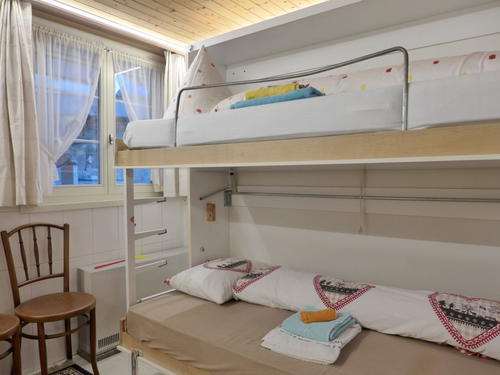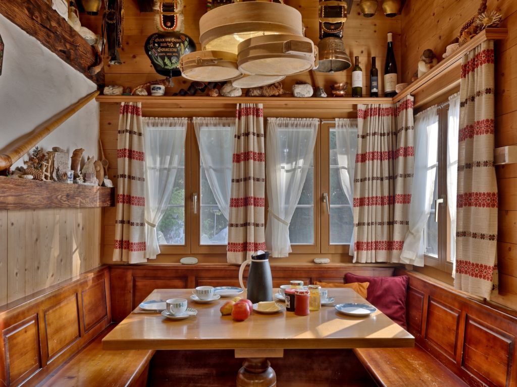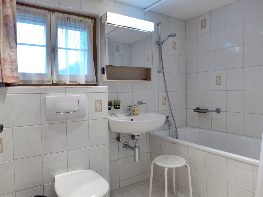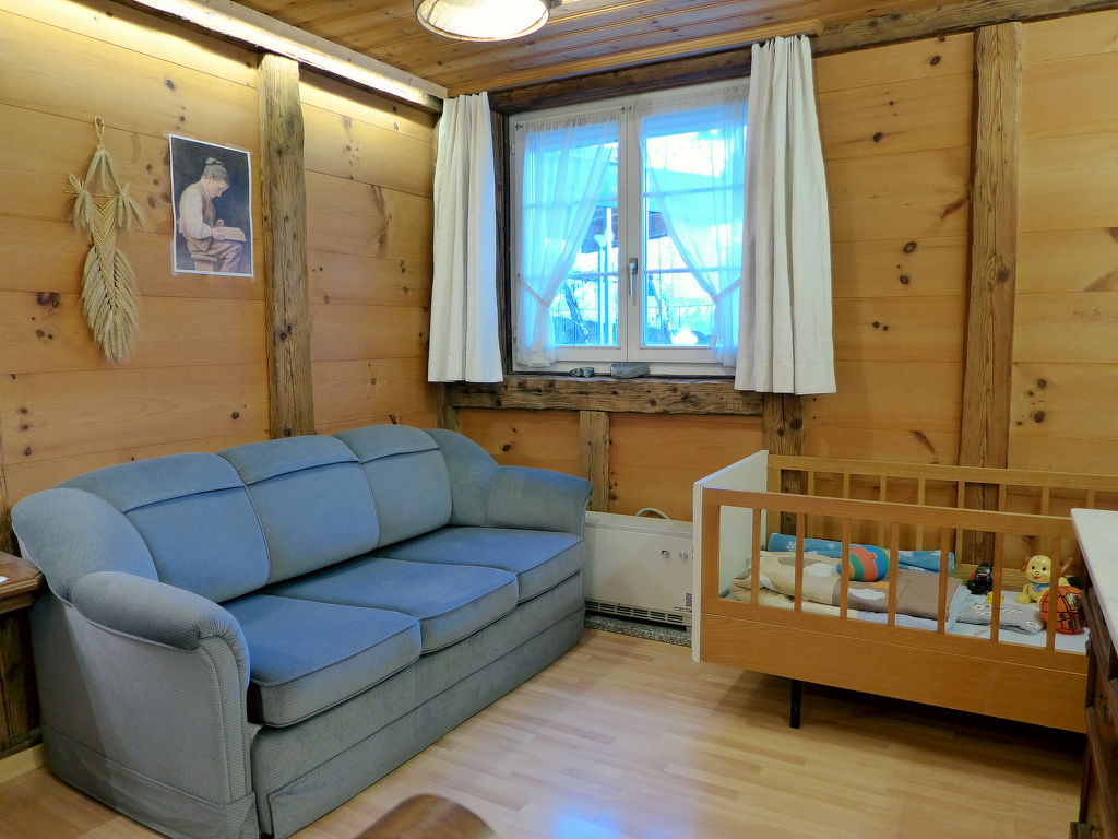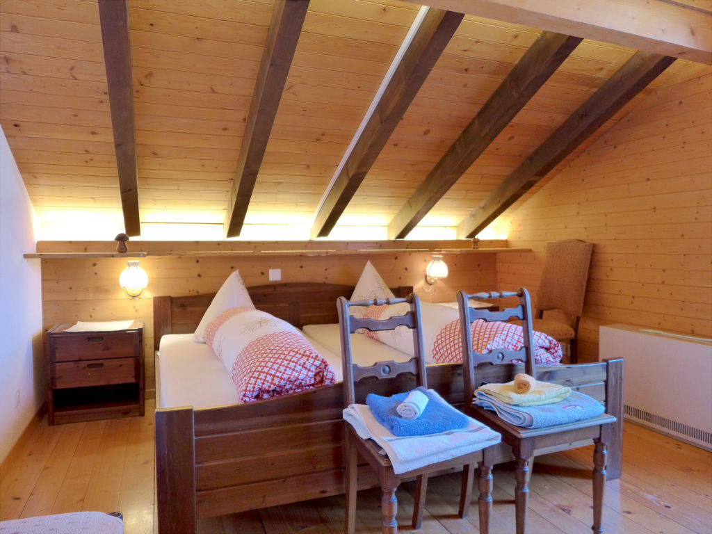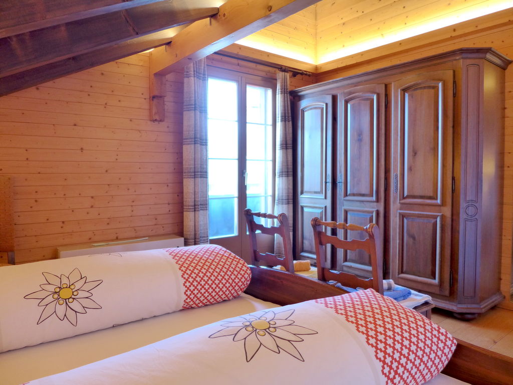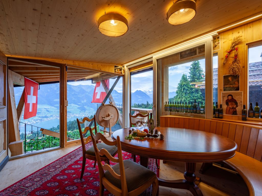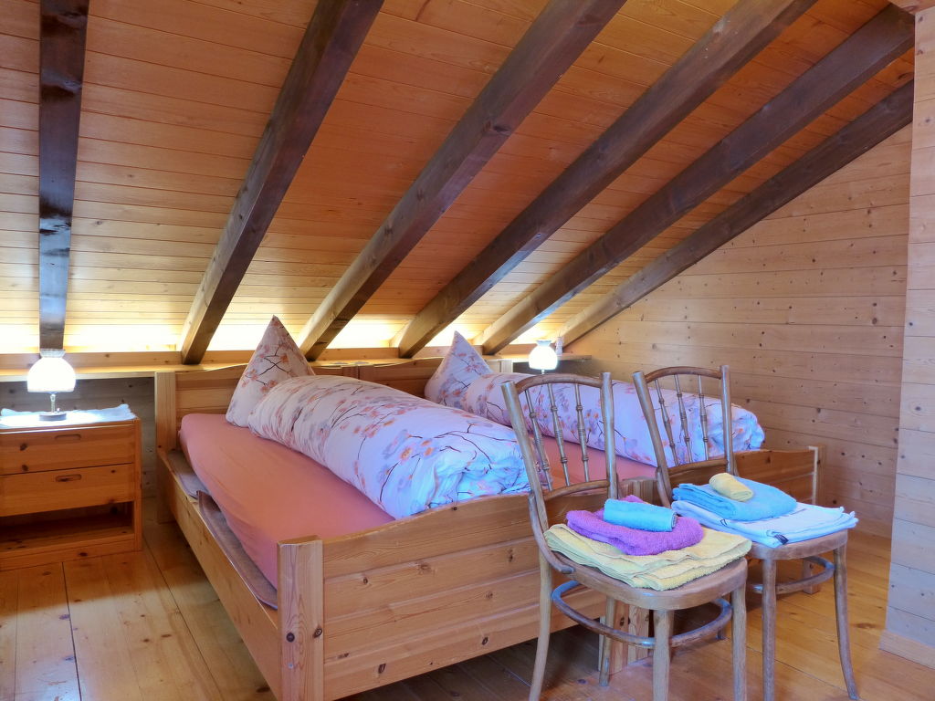 7-Zimmer-Chalet 140 m2 auf 3 Stockwerken. Rustikal und gemütlich eingerichtet: Wohn-/Esszimmer mit Esstisch und Kachelofen. Ausgang zum Balkon. Wohnzimmer mit Digital-TV. Küche (4 Kochplatten, Backofen, Geschirrspüler, Toaster, Wasserkocher, elektrische Kaffeemaschine, Kapseln für die Kaffeemaschine (Nespresso) extra) mit Esstisch. Bad/WC. Unteres Geschoss: 1 grosses Zimmer mit 1 Doppelbett (2 x 90 cm, Länge 200 cm), Waschbecken. 1 Kinderzimmer mit 2 x 2 Etagenbetten (90 cm, Länge 200 cm), Waschbecken. Bad/WC. Obergeschoss: (steile Treppe) 2 abgeschrägte Zimmer, jedes Zimmer mit 1 Doppelbett (2 x 90 cm, Länge 200 cm). Ausgang zum Balkon. 1 kleines Zimmer mit 1 franz. Bett (160 cm, Länge 200 cm). Dusche/WC. Holzheizung. 2 Balkone, grosse Terrasse, Gartensitzplatz. Terrassenmöbel, Gartengrill. Herrliche Panoramasicht auf den See, die Berge, das Tal und die Landschaft. Zur Verfügung: Waschmaschine, Kinderhochstuhl, Babybett, Holz (gratis). Internet (Wireless LAN, gratis). Parkplatz (6 Autos), Garage beim Haus. Bitte beachten: geeignet für Familien. Nichtraucher-Haus.