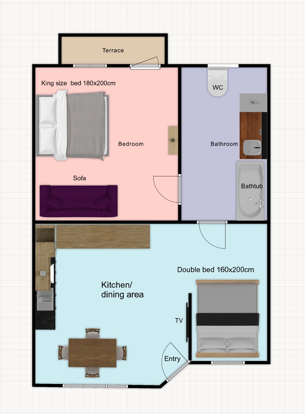Die Wohnung Nr. 4 befindet sich im 2. Stock, ca. 120 m ², und besteht aus drei separaten Schlafzimmern, drei Duschbädern, einer Küche/einem Essbereich und einem großen Balkon. Alle Zimmer sind zum Hinterhof ausgerichtet. In jedem Schlafzimmer befindet sich ein Kingsize-Boxspringbett (180 x 200 cm).