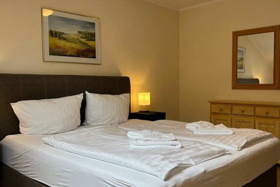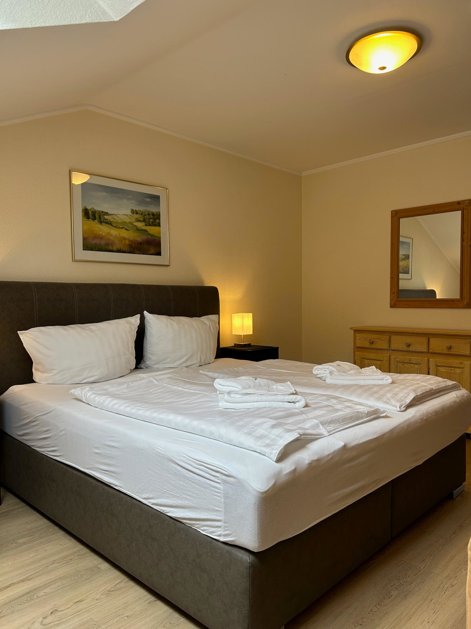 Der größte Vorteil dieser Wohnung ist sicherlich das Schlafzimmer mit einem komfortablen Boxspringbett. Hier können Sie sich nach einem erlebnisreichen Tag so richtig erholen und neue Energie tanken. Aber auch im Wohnzimmer erwartet Sie eine weitere Schlafgelegenheit in Form einer bequemen Schlafcouch. Somit bietet die Ferienwohnung B8 genug Platz für bis zu vier Personen, ideal also für Familien oder kleine Gruppen.