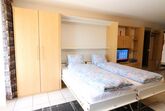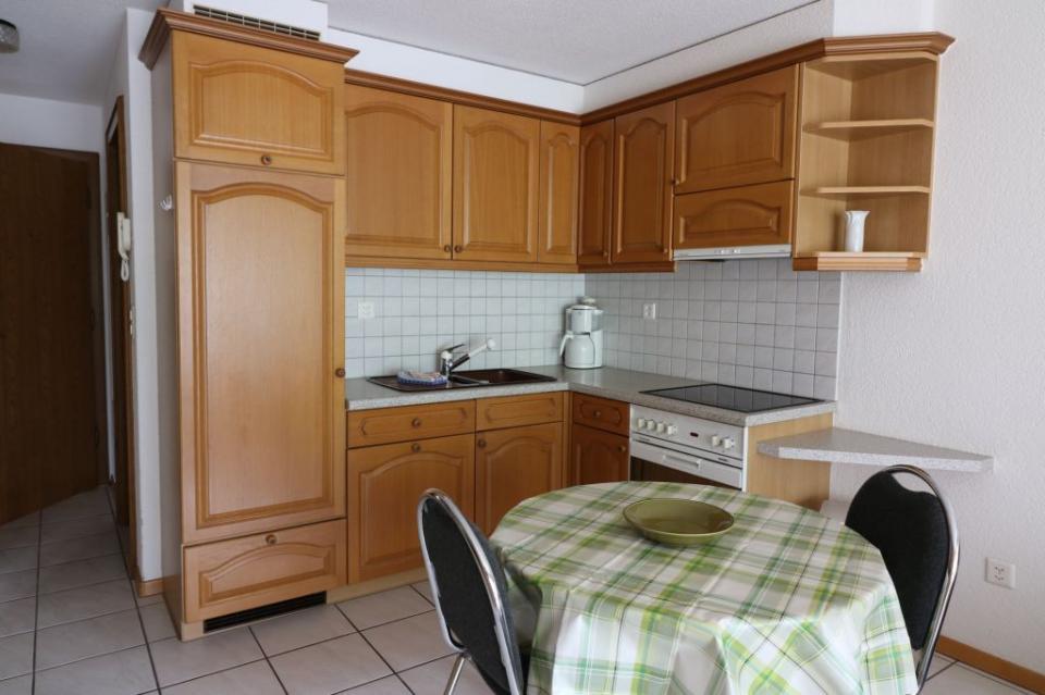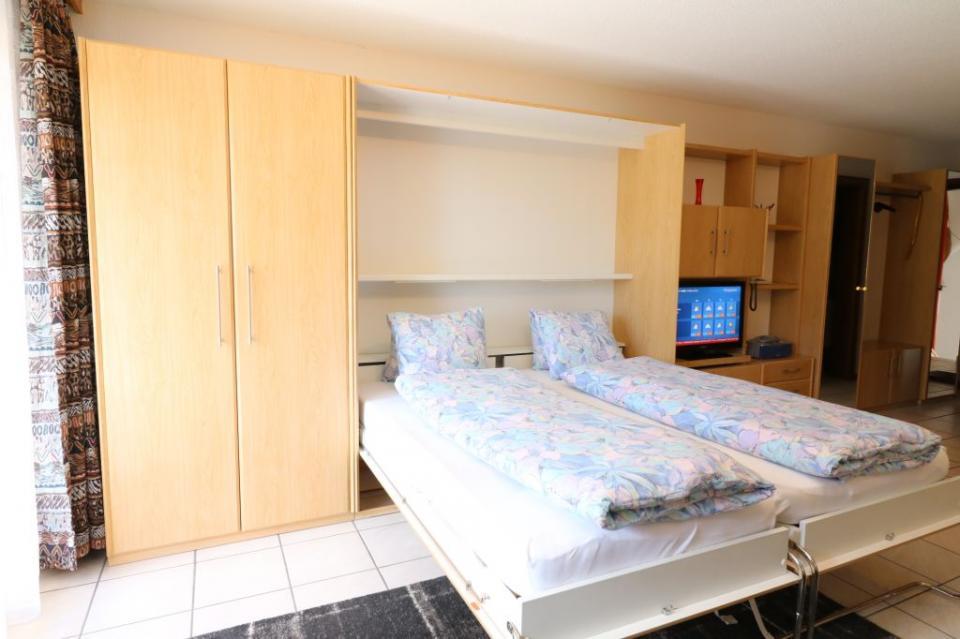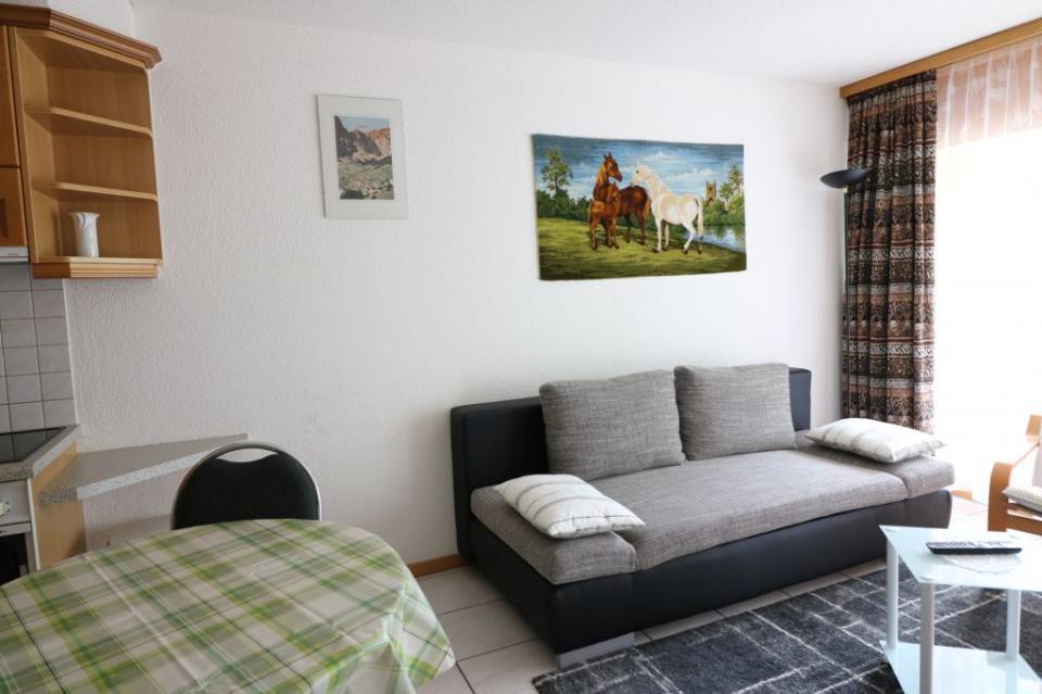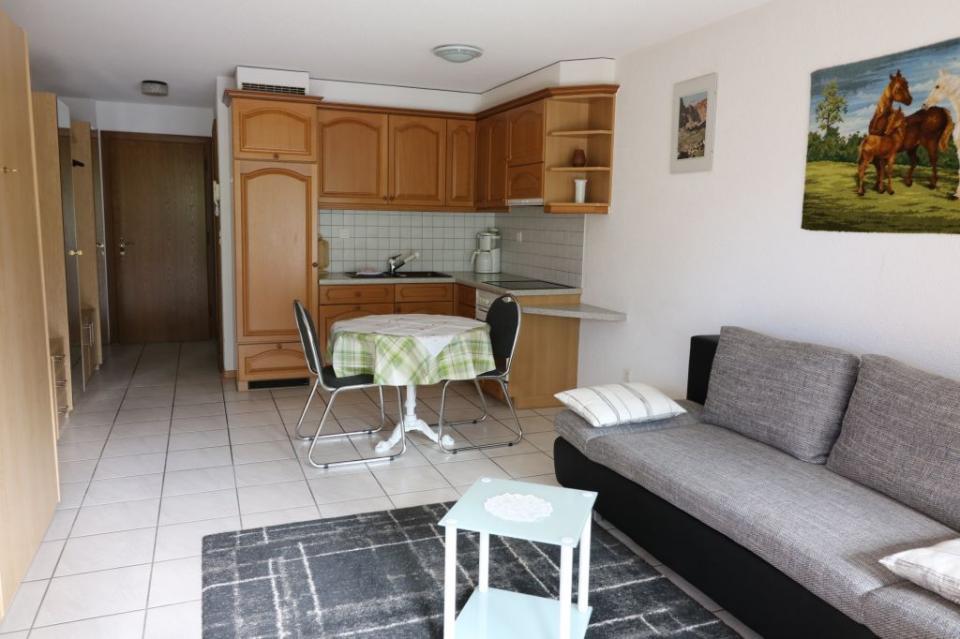 1-Zimmerwohnung (30 m2) im 3.Stock mit Balkon zur Südwestseite, Wohn-/Esszimmer mit 2 Wandschrankbetten, Sitzgelegenheit, moderne offene vollausgestattete Küche, Dusche/WC, Maximalbelegung 2 Personen, Kabel-TV , FREE WiFi, Lift, Nichtraucherwohnung, Garage zu mieten. Sehr zentrale und ruhige Lage.