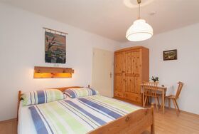 Diese Ferienwohnung im Nebengebäude im 1.Stock ist mit einer Ausziehcouch ideal für eine 3köpfige Famlie und hat mit ihren kleinen Balkon perfekte Übersicht über den Gastgarten und Teile des Hofes.