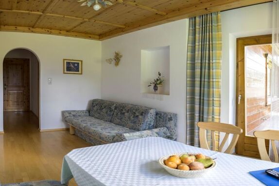 Appartement Abendsonne: Vollholzmöbel aus Zirbenholz, Größe: ca. 67 m², 2 Doppelzimmer, Diele mit Kochnische, Wohnzimmer mit Essecke, SAT-TV mit Teletext und Radio, Safe, Sofa (ausziehbar für 2 Kinder), 2 Badezimmer mit Dusche/WC und Föhn, Parkettboden, Südalkon, auf der 1. Etage, Benützung der Panoramasauna inklusive, Aufenthaltsraum und Gästeküche zur Mitbenützung in Joggls Stube,