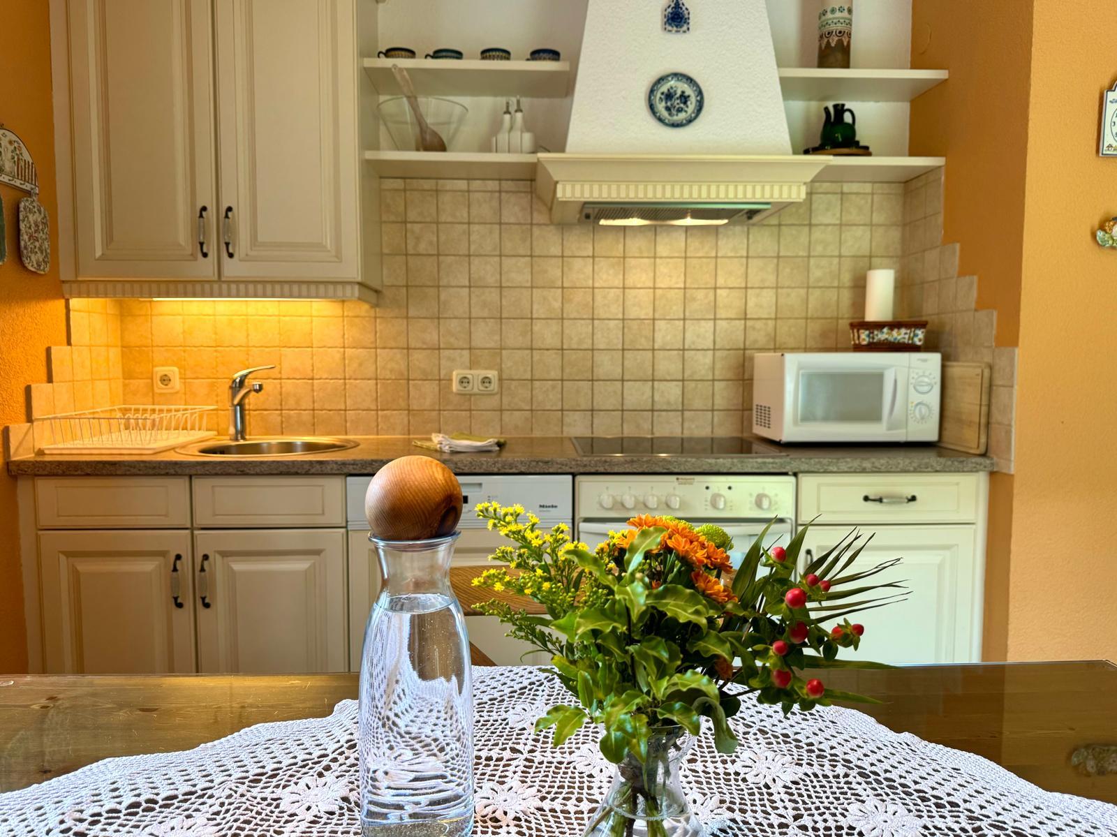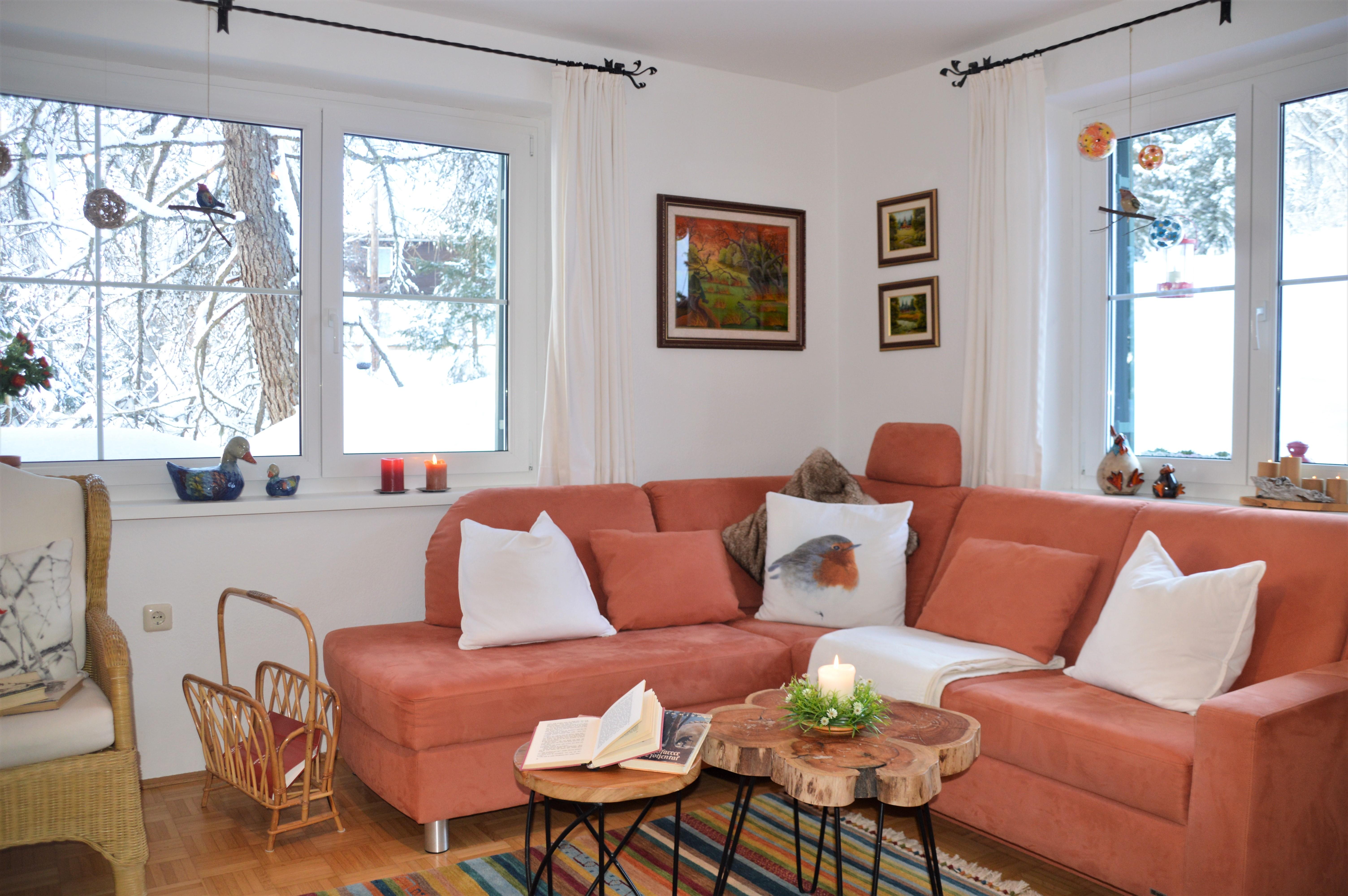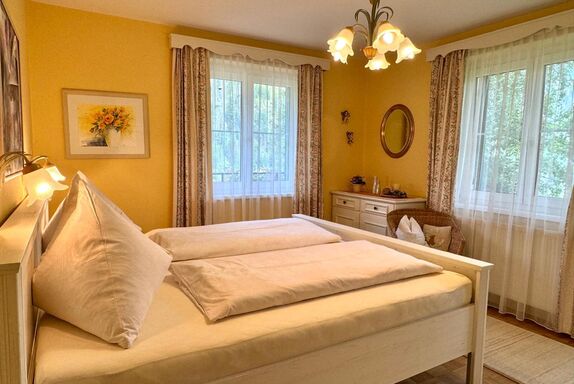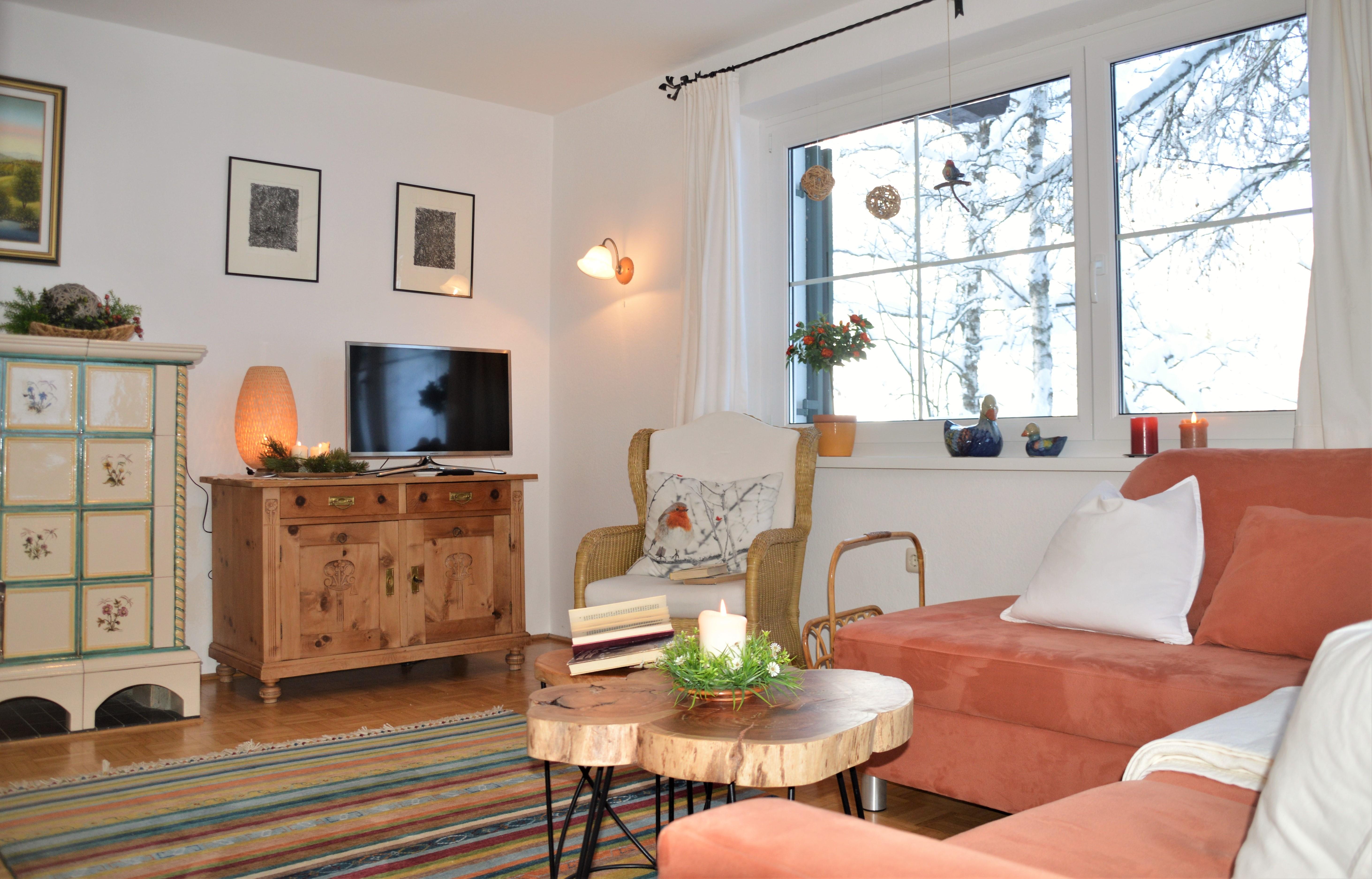 Unsere 70m² große Erdgeschosswohnung Wiesenduft verfügt über eine lichtdurchflutete Wohnküche, einem geräumigen Wohnschalfzimmer samt handbemalenem Kachelofen, einem im Landhausstil eingerichteten Schlafzimmer und einem separatem Bad und WC.