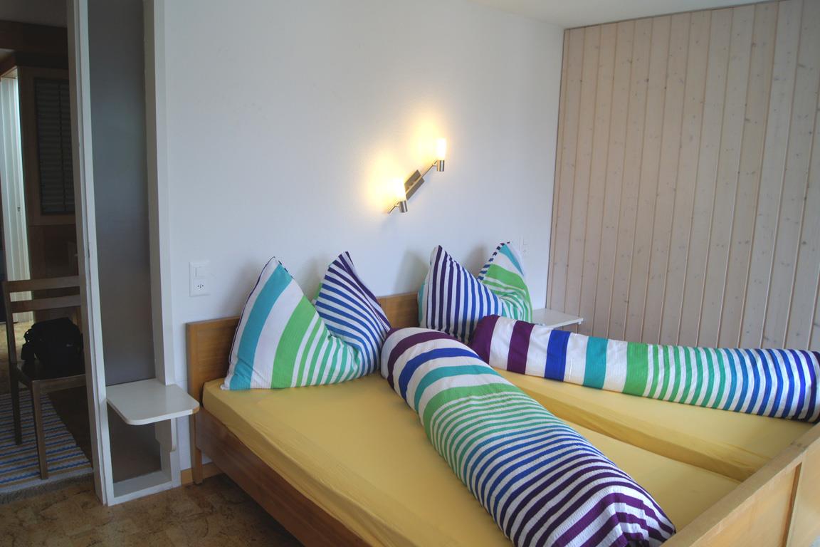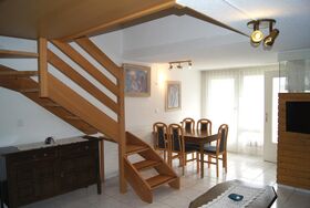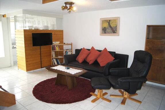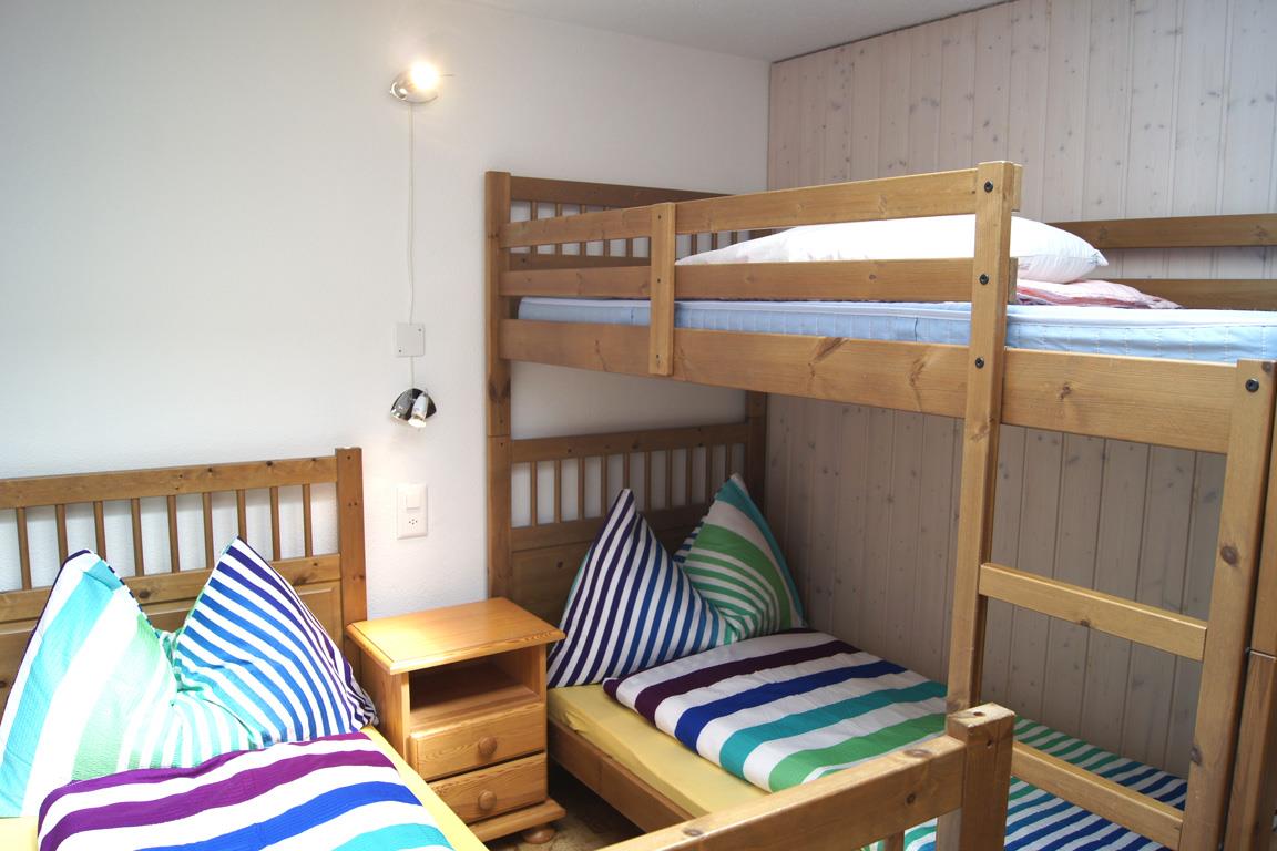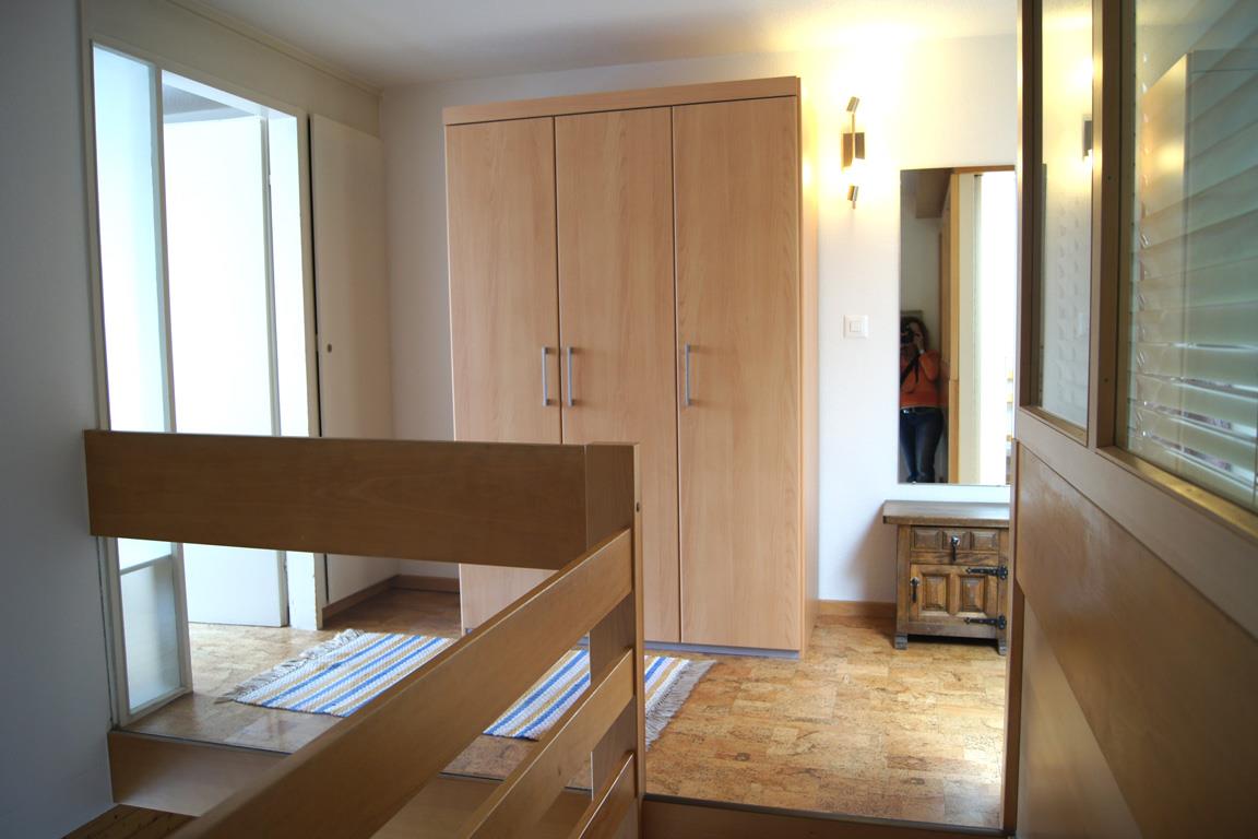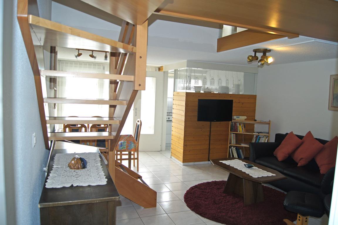 3-Zimmer-Maisonette-Wohnung: Wohn-/Esszimmer mit Schlafsofa, Radio, TV, gratis W-Lan, separate Küche mit Geschirrspüler und Mikrowelle, Süd-Balkon, separates WC. Im Obergeschoss: 1 Zweibettzimmer, 1 Schlafzimmer mit 1 Etagenbett für 2 Kinder und 1 Einzelbett, Dusche/WC, Süd-Balkon. Nichtraucherwohnung. Garage mietbar (je nach Verfügbarkeit).