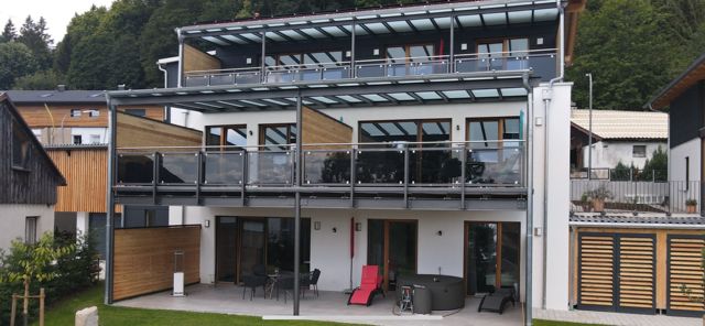 Unmittelbar am Haus befinden sich überdachte Car-Ports mit Ladestation für Ihr E-Auto, ebenso ein abschließbarer Fahrradraum.