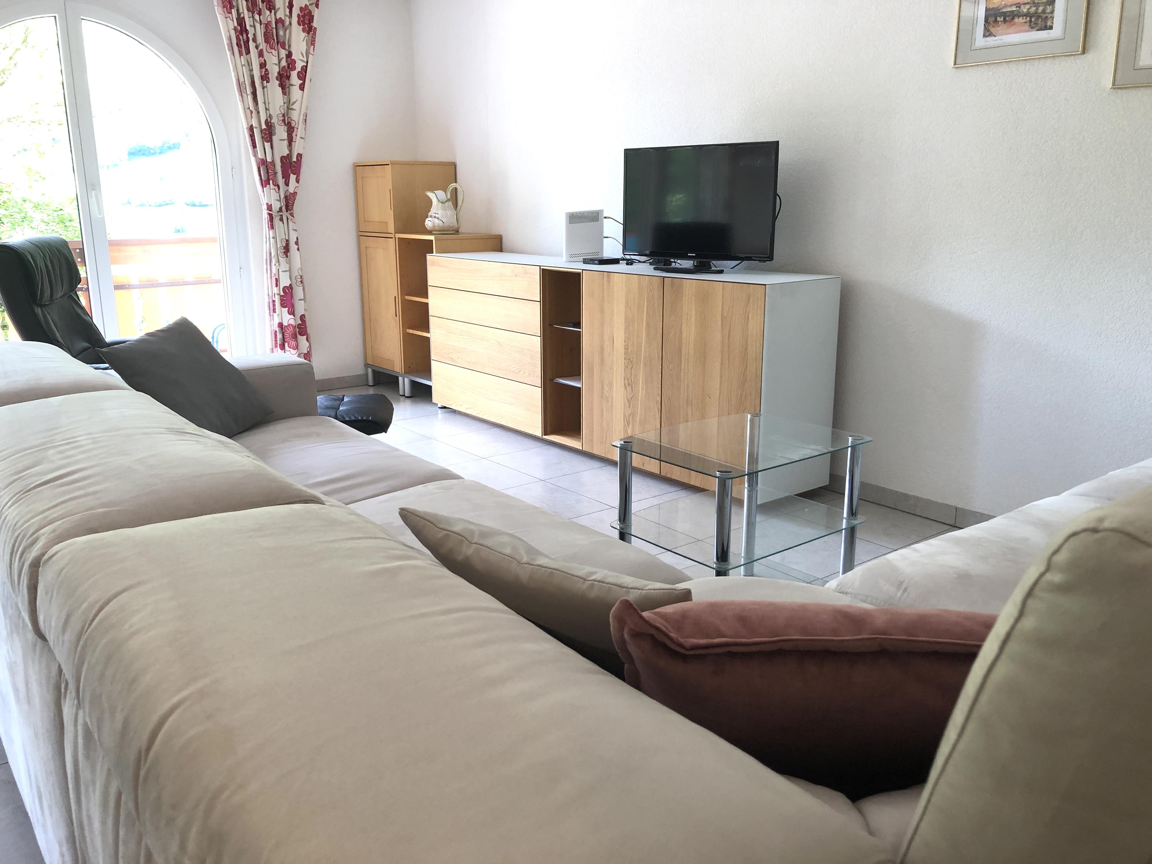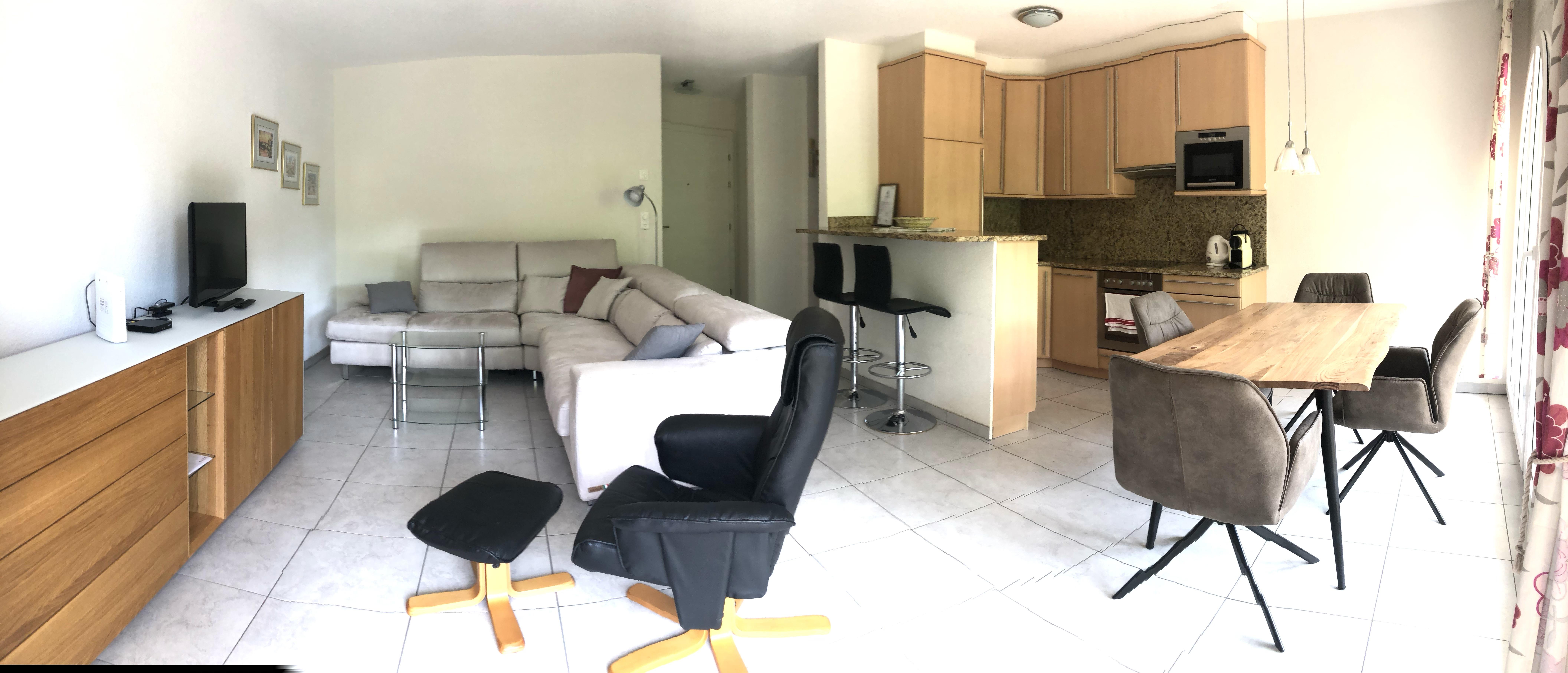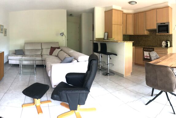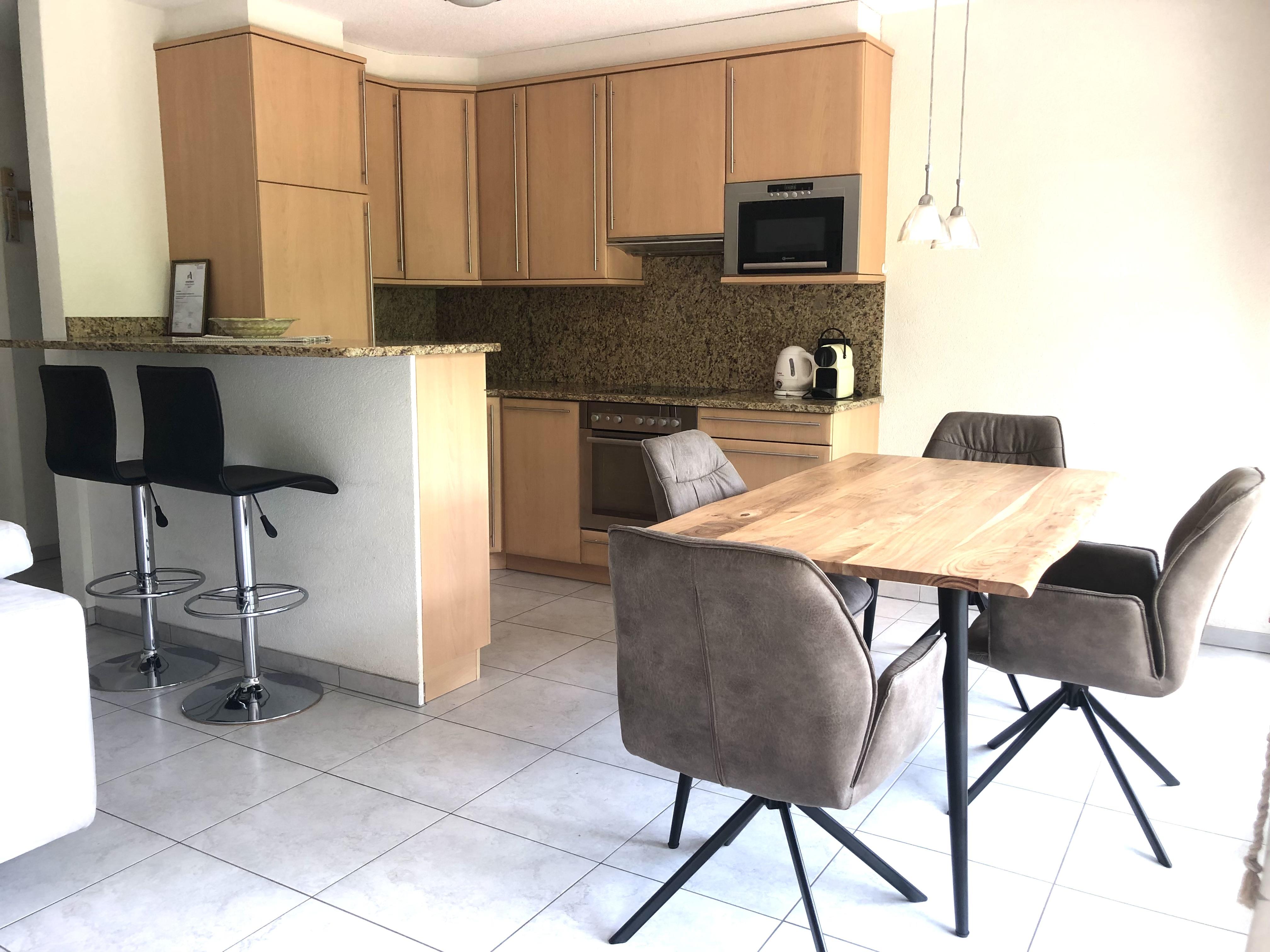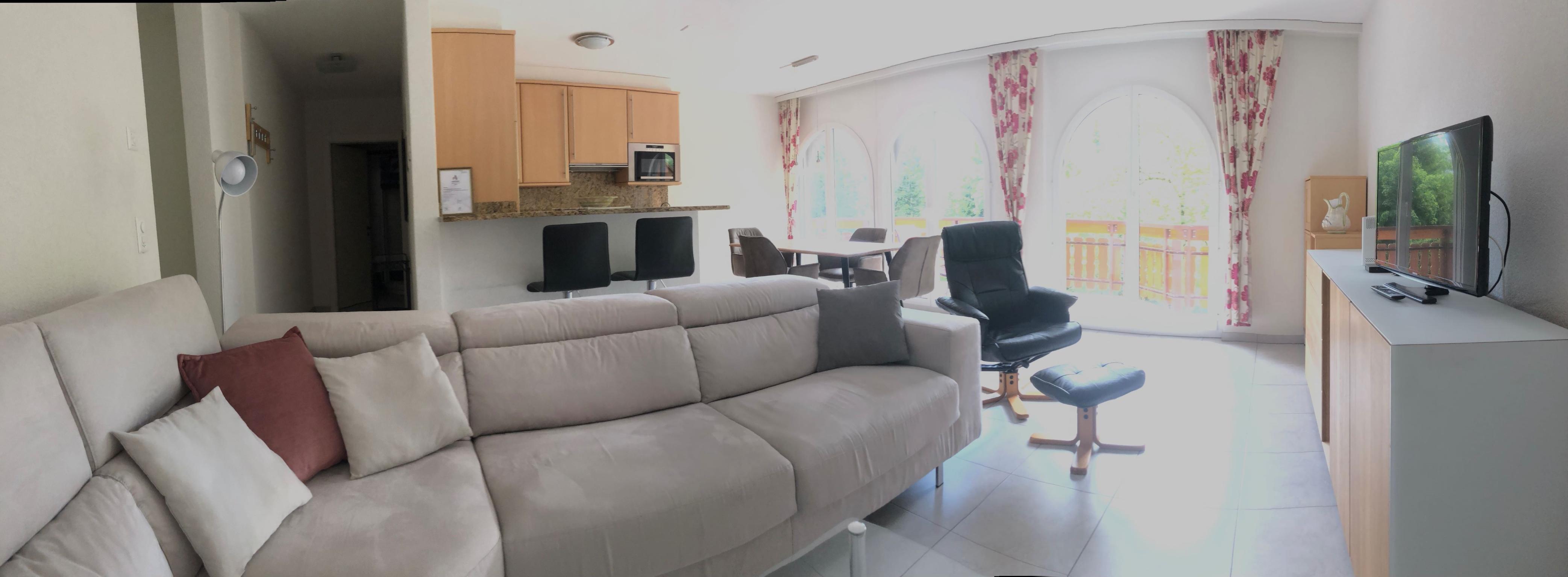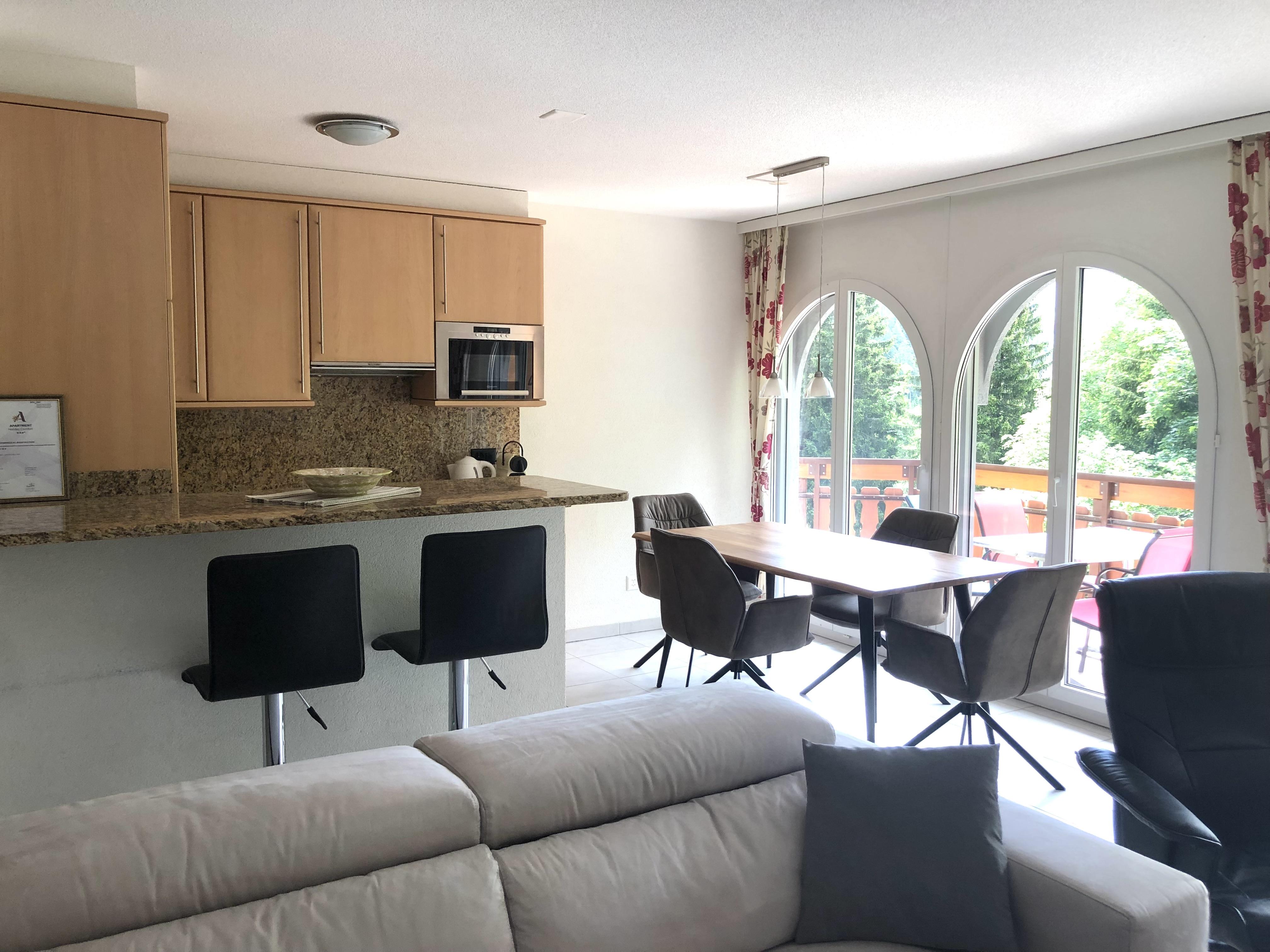 Luxuriöse, helle 2-Zimmerwohnung, im Erdgeschoss, exklusiv eingerichtete moderne Wohnküche, Wohnzimmer mit Doppel-Sofabett und Bar, 1 Doppelschlafzimmer mit eigener Dusche/WC, TV, Radio/CD, gratis WiFi, Süd-Balkon mit Panoramablick. Ruhige Lage, Aufzug, Ski- & Veloraum, Kinderspielplatz. In der Nähe: Torrentbahnen, Thermalbäder, Ortsbus-Haltestelle, Dorfzentrum. Garage zu mieten im Haus. Nichtraucher-Wohnung.