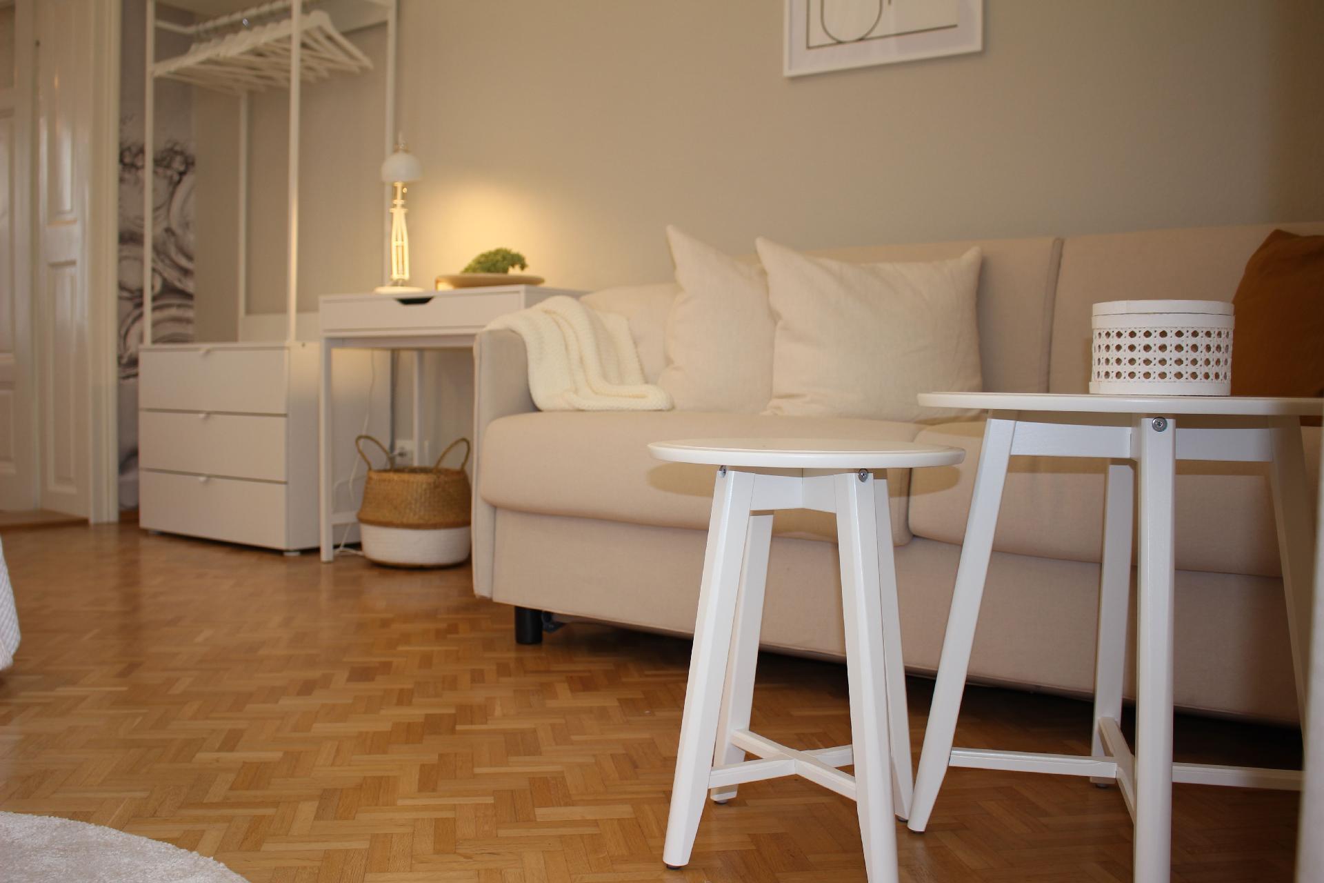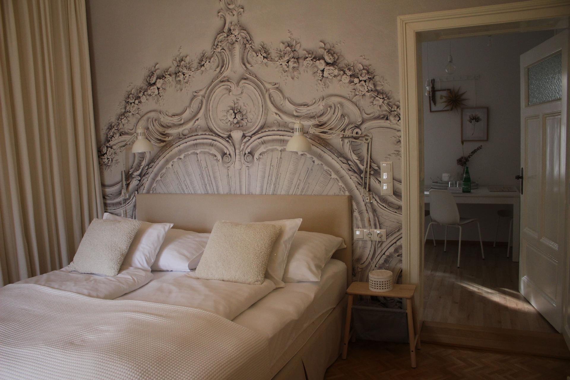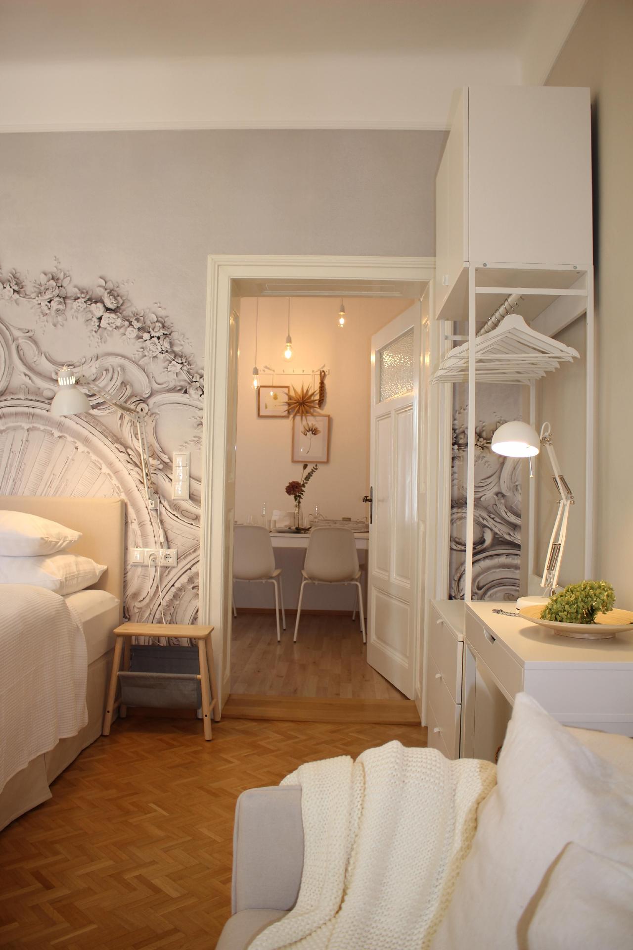 Unsere „weiße Wohnung“ besticht durch einen großzügigen Vorraum, von dem man direkt ins Bad gelangt. Das Schlafzimmer bietet absoluten Komfort – fast schon wie im Luxushotel. Die ruhige Lage Richtung Innenhof verspricht somit einen erhol- und geruhsamen Schlaf. Die im Erdgeschoss unseres Apartmenthauses gelegene Ferienwohnung ist vergittert und garantiert somit Sicherheit rund um die Uhr. Im Schlafzimmer findet man, neben dem luxuriösen und gemütlichen Doppelbett (180 x 200 cm), zusätzlich noch ein bequemes, ausziehbares Schlafsofa (160 x 200 cm). Ideal für den Aufenthalt mit Familie und Kindern.Die vollausgestattete Küche, inklusive Mikrowelle, Geschirrspüler, Kaffeemaschine sowie einem Esstisch und vielen Accessoires sorgen für puren Gaumengenuss, Wohlfühlfaktor und ausreichend Platz für bis zu 4 Personen. Holen Sie sich zum herzhaften Frühstück die frischen Semmeln und Gebäck in der hauseigenen Bäckerei, die nur eine Gehminute entfernt von der Ferienwohnung liegt.