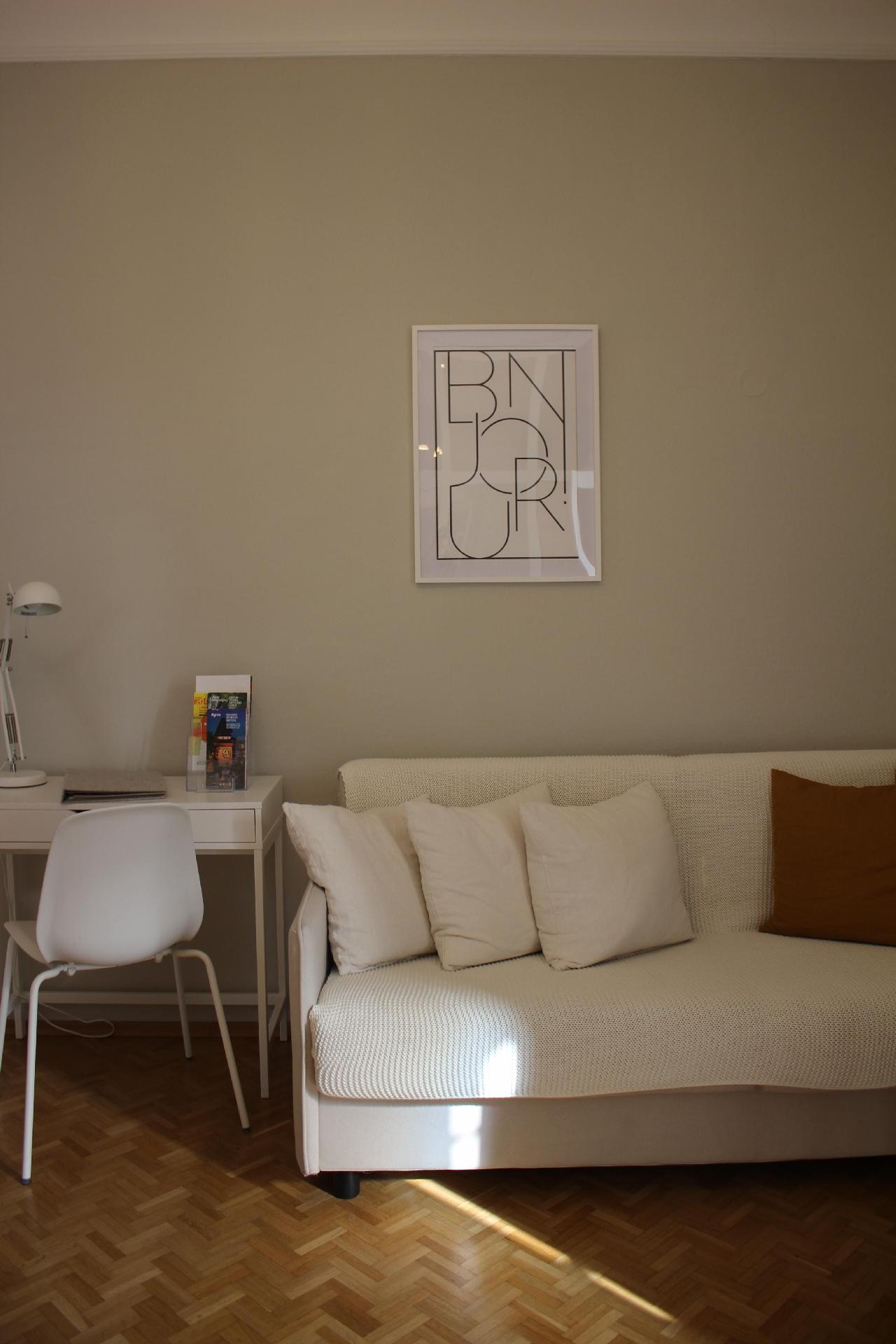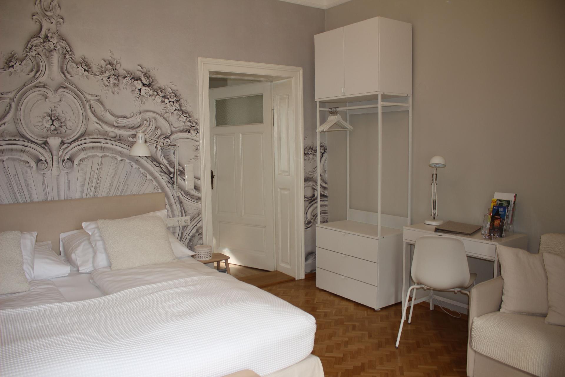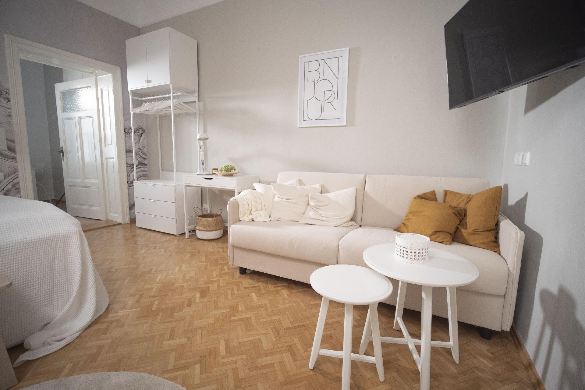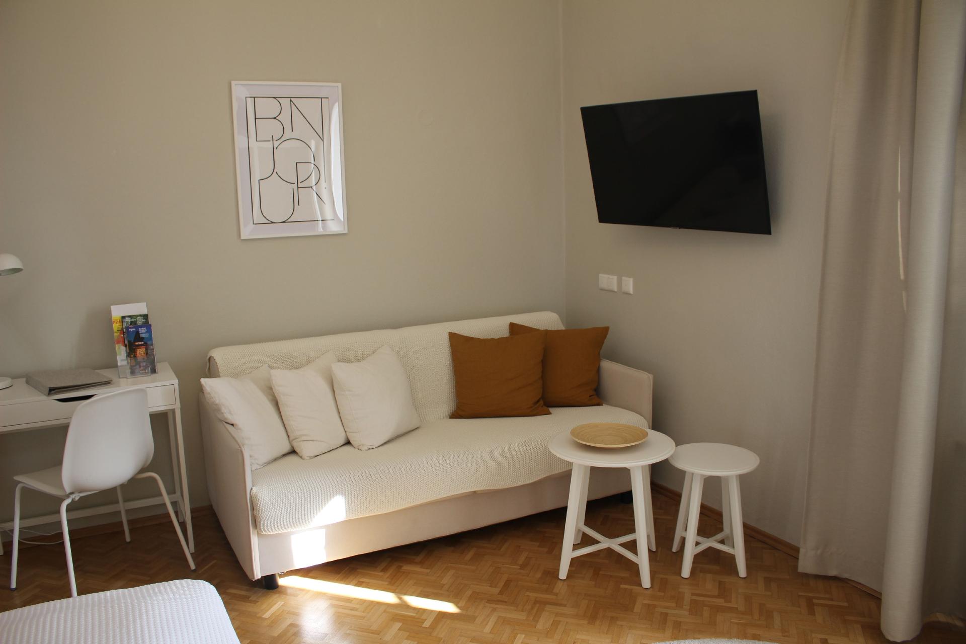 Unsere „weiße Wohnung“ besticht durch einen großzügigen Vorraum, von dem man direkt ins Bad gelangt. Das Schlafzimmer bietet absoluten Komfort – fast schon wie im Luxushotel. Die ruhige Lage Richtung Innenhof verspricht somit einen erhol- und geruhsamen Schlaf. Die im Erdgeschoss unseres Apartmenthauses gelegene Ferienwohnung ist vergittert und garantiert somit Sicherheit rund um die Uhr. Im Schlafzimmer findet man, neben dem luxuriösen und gemütlichen Doppelbett (180 x 200 cm), zusätzlich noch ein bequemes, ausziehbares Schlafsofa (160 x 200 cm). Ideal für den Aufenthalt mit Familie und Kindern.Die vollausgestattete Küche, inklusive Mikrowelle, Geschirrspüler, Kaffeemaschine sowie einem Esstisch und vielen Accessoires sorgen für puren Gaumengenuss, Wohlfühlfaktor und ausreichend Platz für bis zu 4 Personen. Holen Sie sich zum herzhaften Frühstück die frischen Semmeln und Gebäck in der hauseigenen Bäckerei, die nur eine Gehminute entfernt von der Ferienwohnung liegt.