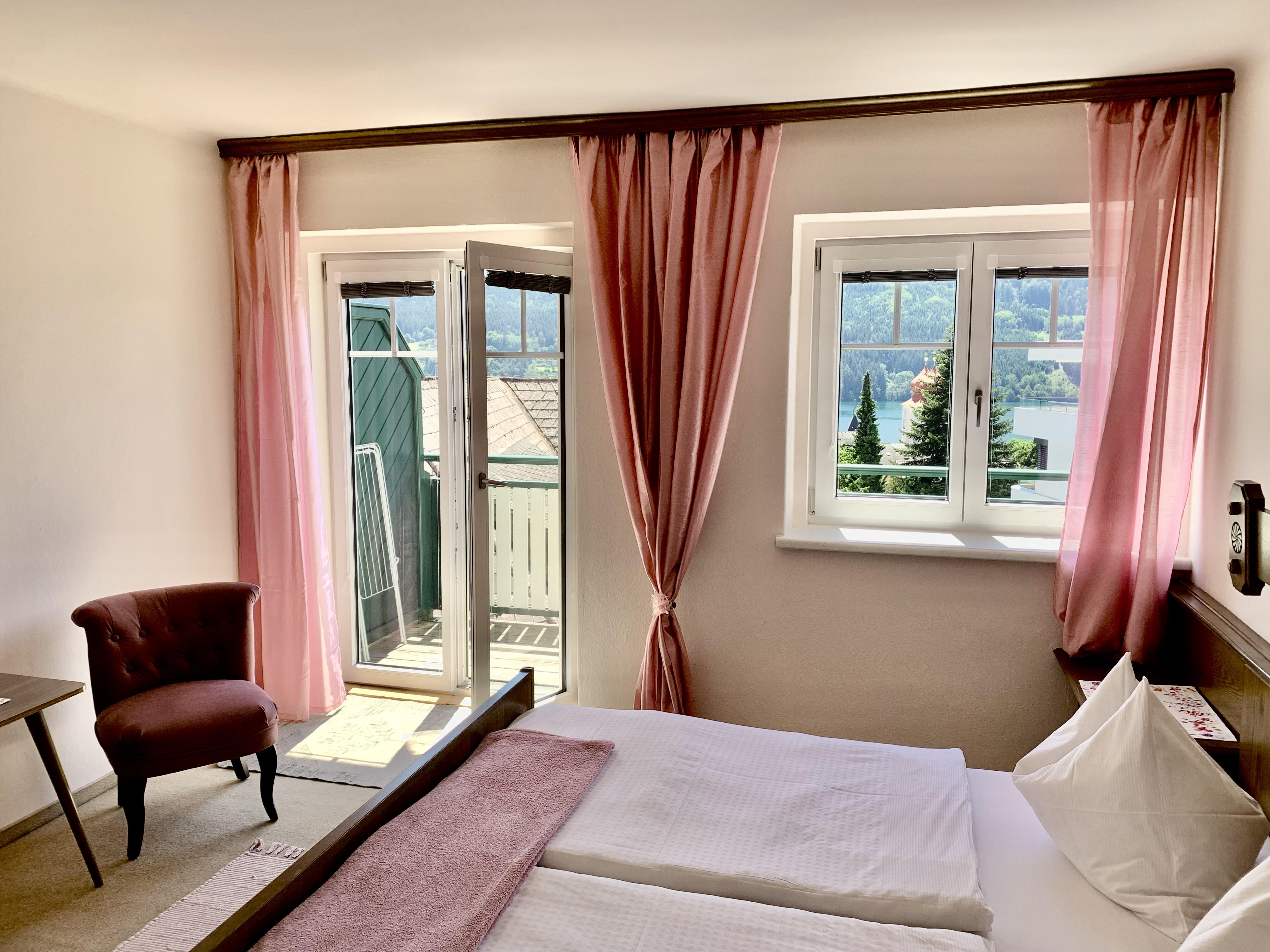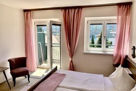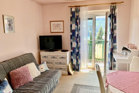 1 Ferienwohnung, südseitig mit Balkon, mit Blick auf die umliegenden Berge und dem See,