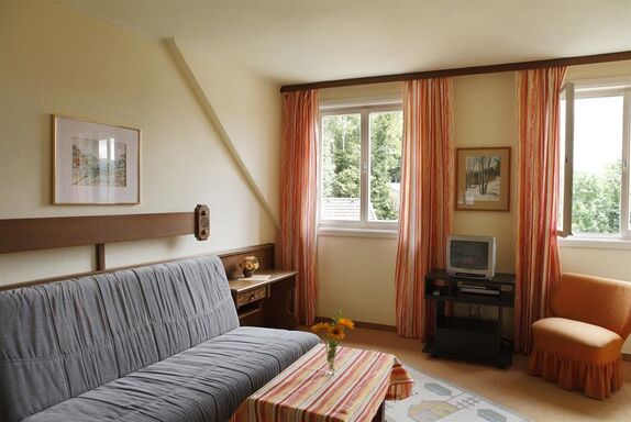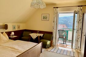 1 Ferienwohnung mit Balkon, mit Blick auf die umliegenden Berge und dem See, bestehend aus 1 Wohn(schlaf)zimmer mit Dusche/WC, ostseitig, 1 Schlafzimmer mit Dusche/WC, südseitig, 1 kleinen Küche, SAT-TV, W-LAN, Geschirr, Kaffeemaschine, Bettwäsche und Handtücher sind vorhanden