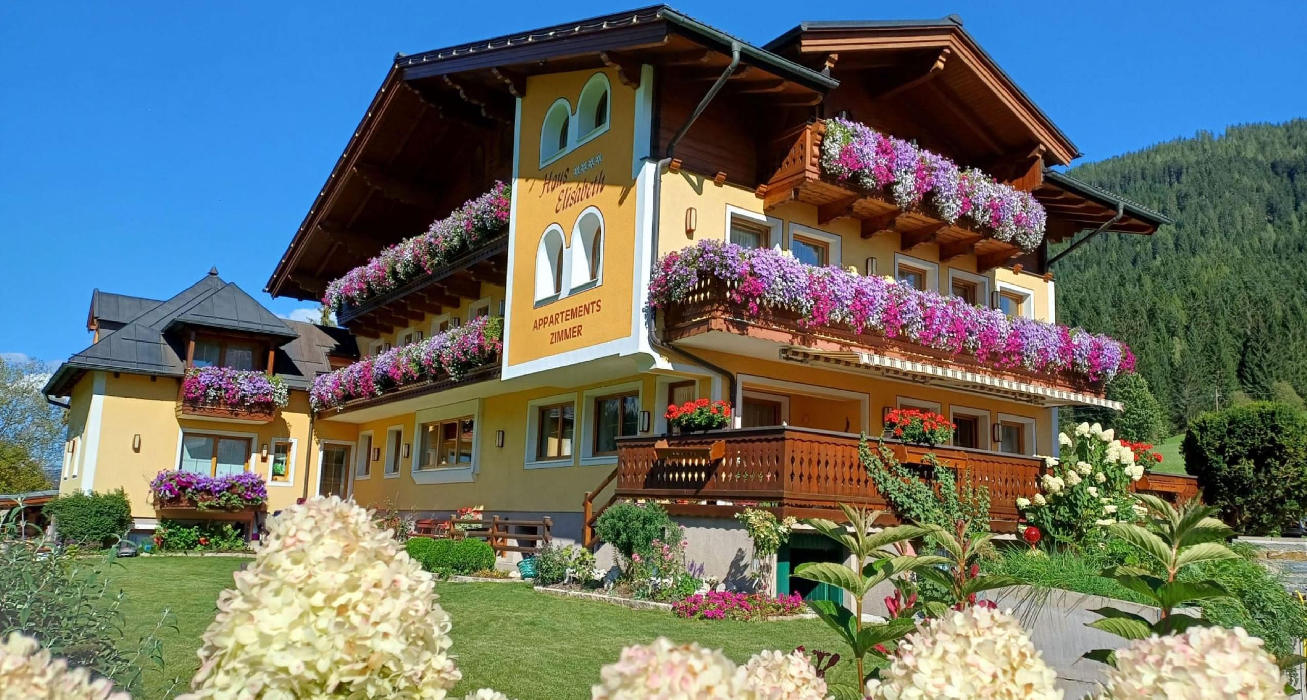 Urlaub soll die schönste Zeit im Jahr werden - wenn Sie Ihren Urlaub inmitten intakter Natur mit Zeit für sich und Ihre Lieben planen und einfach einmal aus dem Alltag raus wollen, dann fühlen Sie sich bei uns sicher wohl! Unser Haus Elisabeth liegt in zentrale, sonniger und ruhiger Lage mit herrlichem Ausblick. Wir sind vom Landesverband mit dem Prädikat 4 Edelweiß ausgezeichnet worden, das heißt für Sie, dass wir Ihnen schöne Zimmer mit Frühstück und 4 komfortable Ferienwohnungen anbieten können, die garantiert vielfältige Kriterien erfüllen, um Ihren Urlaubsaufenthalt so angenehm wie möglich zu gestalten! Ein Frühstücksraum, Nichtraucherraum, Balkon, Sat-TV, Parkplatz sowie freier Internetzugang in allen Ferienwohnungen und im Aufenthaltsraum stehen Ihnen weiters zur Verfügung. Kinder finden auf der großen Liegewiese vor dem Haus und dem nahen Kinderspielplatz genügend Platz zum Toben und Spielen! Zahlreiche lohnende Ausflugsziele, wie Dachstein, Burg Hohenwerfen, Mozartstadt Salzburg uvm können vom Haus Elisabeth aus leicht und bequem erreicht werden, im Winter locken die Loipen direkt vorm Haus oder die Skiverbände Skiregion Dachstein-West und die Salzburger Sportwelt Amadé mit herrlichen Pisten.