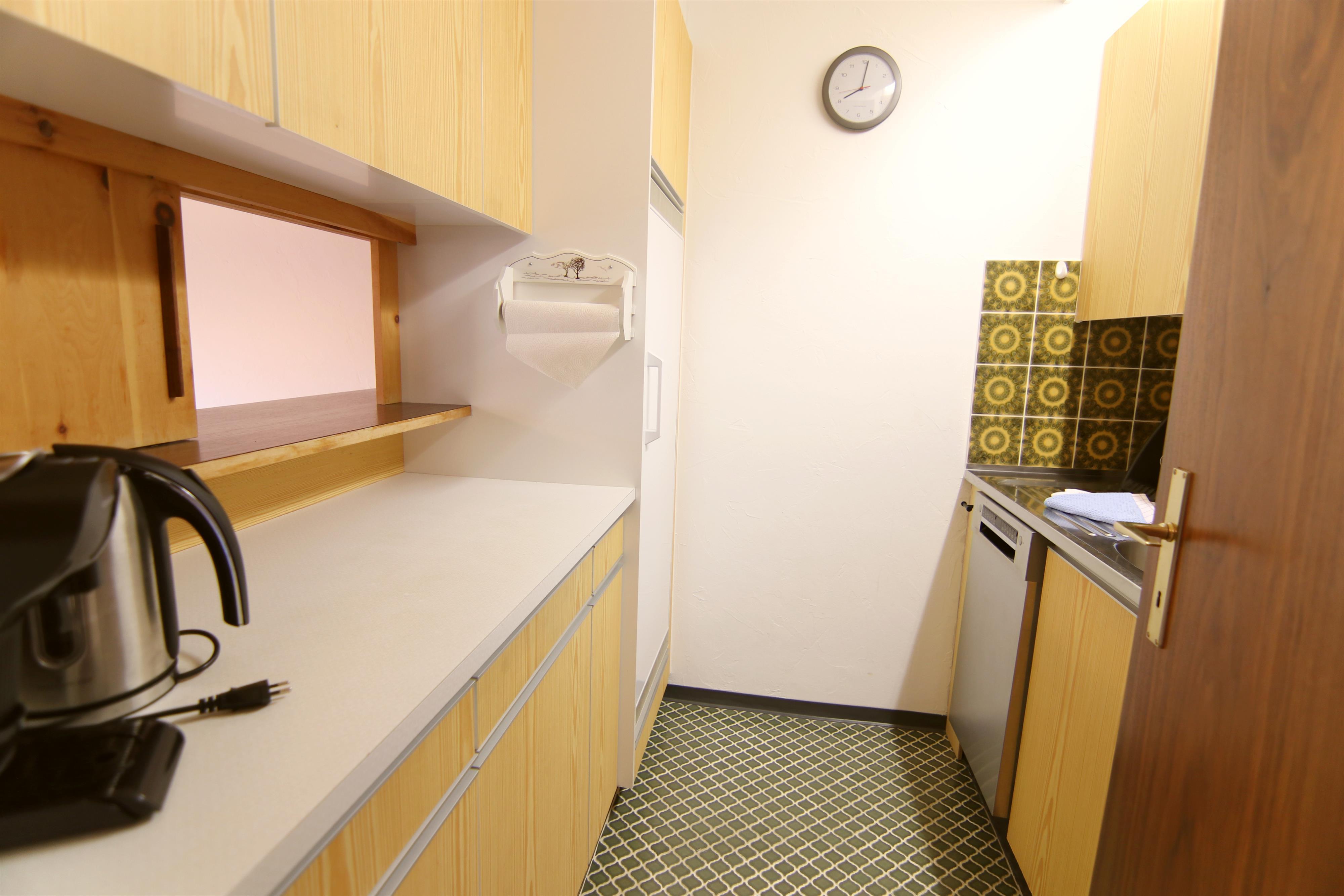 Separate, ausgestatte Küche (Basis-Küchenutensilien, Backofen, Geschirrspüler, Fondue und Raclette Set, Kühlschrank mit kleinem Gefrierfach, Nespresso-Kaffeemaschine ohne Kapseln, Wasserkocher)