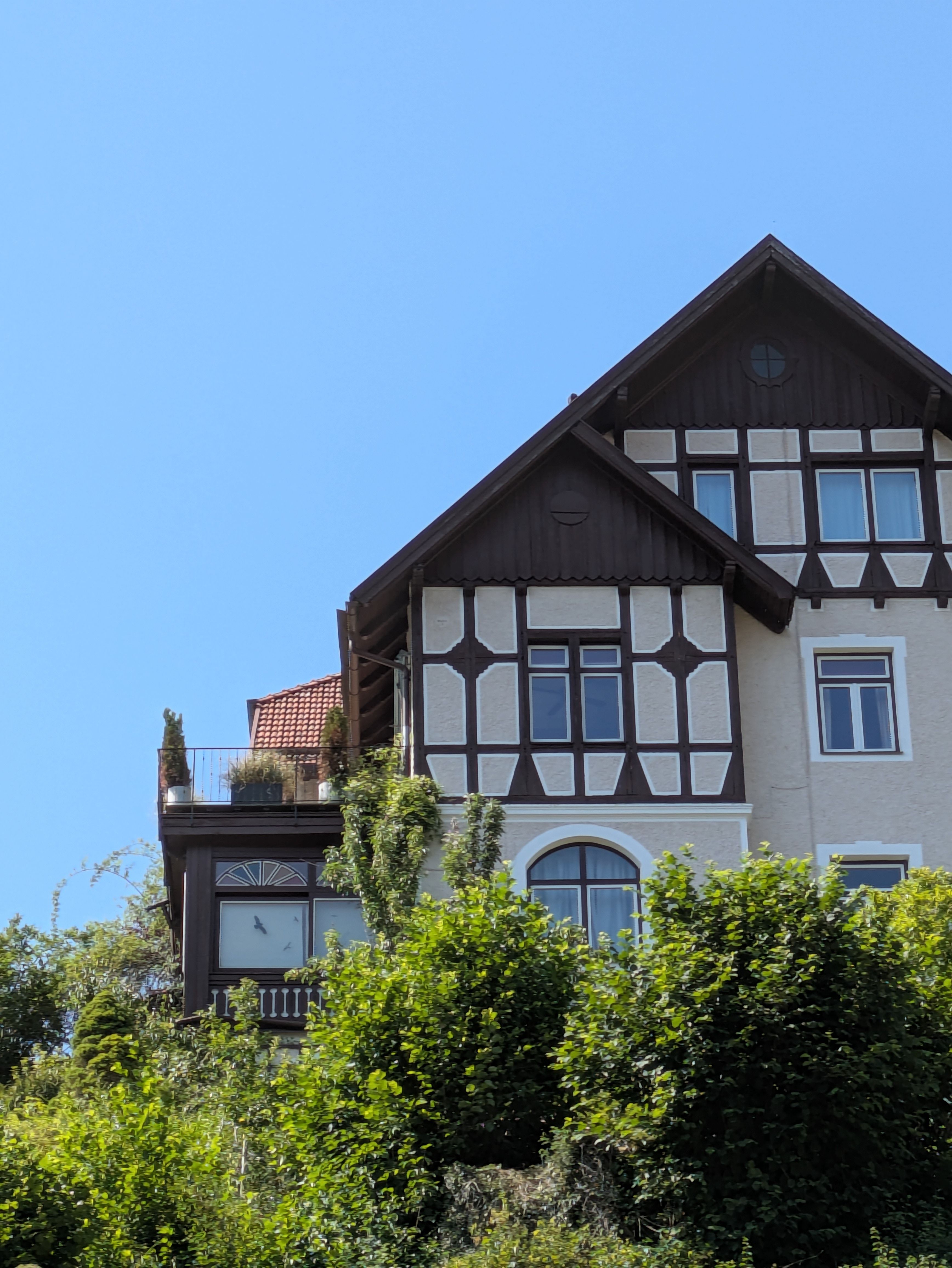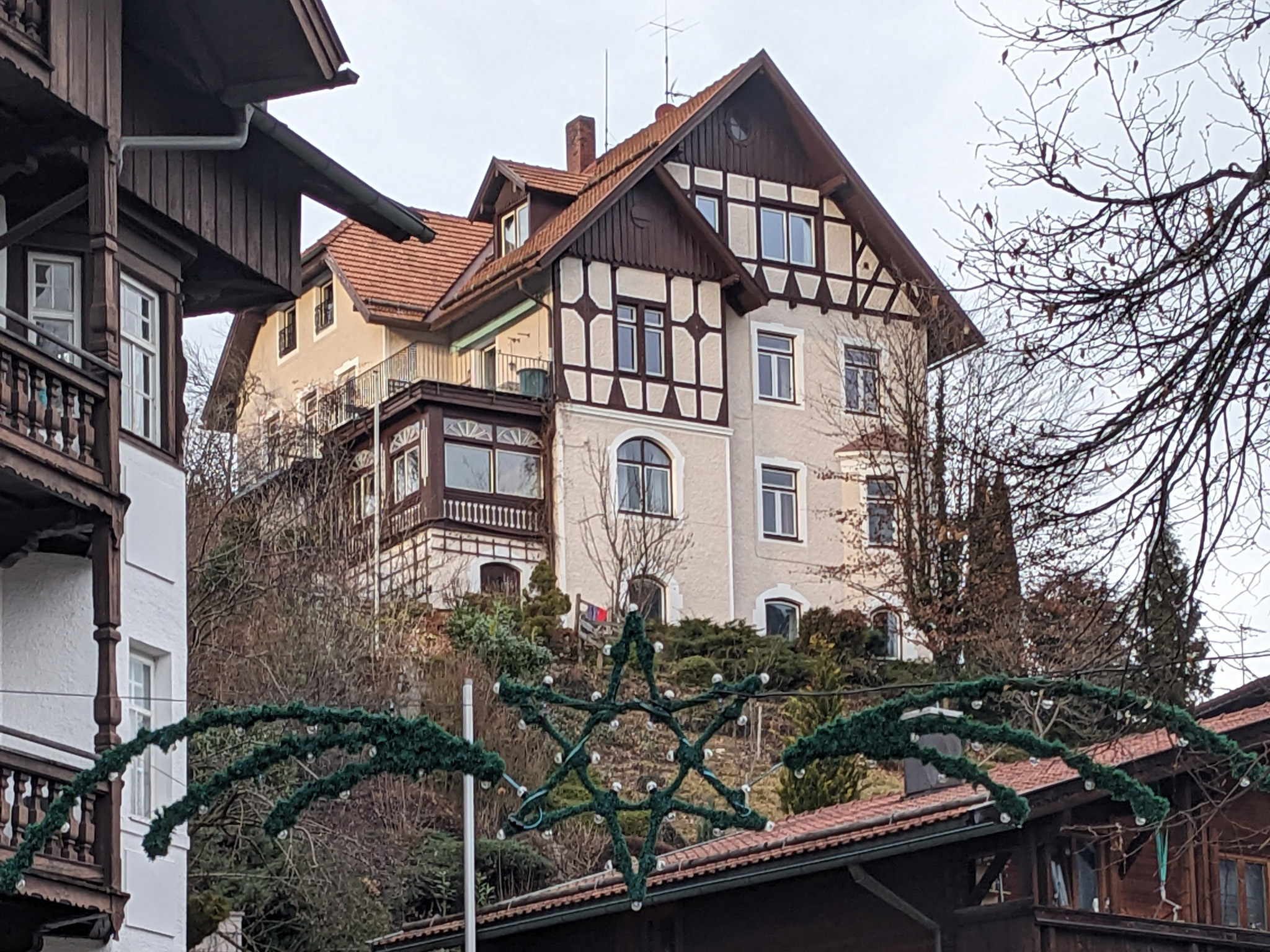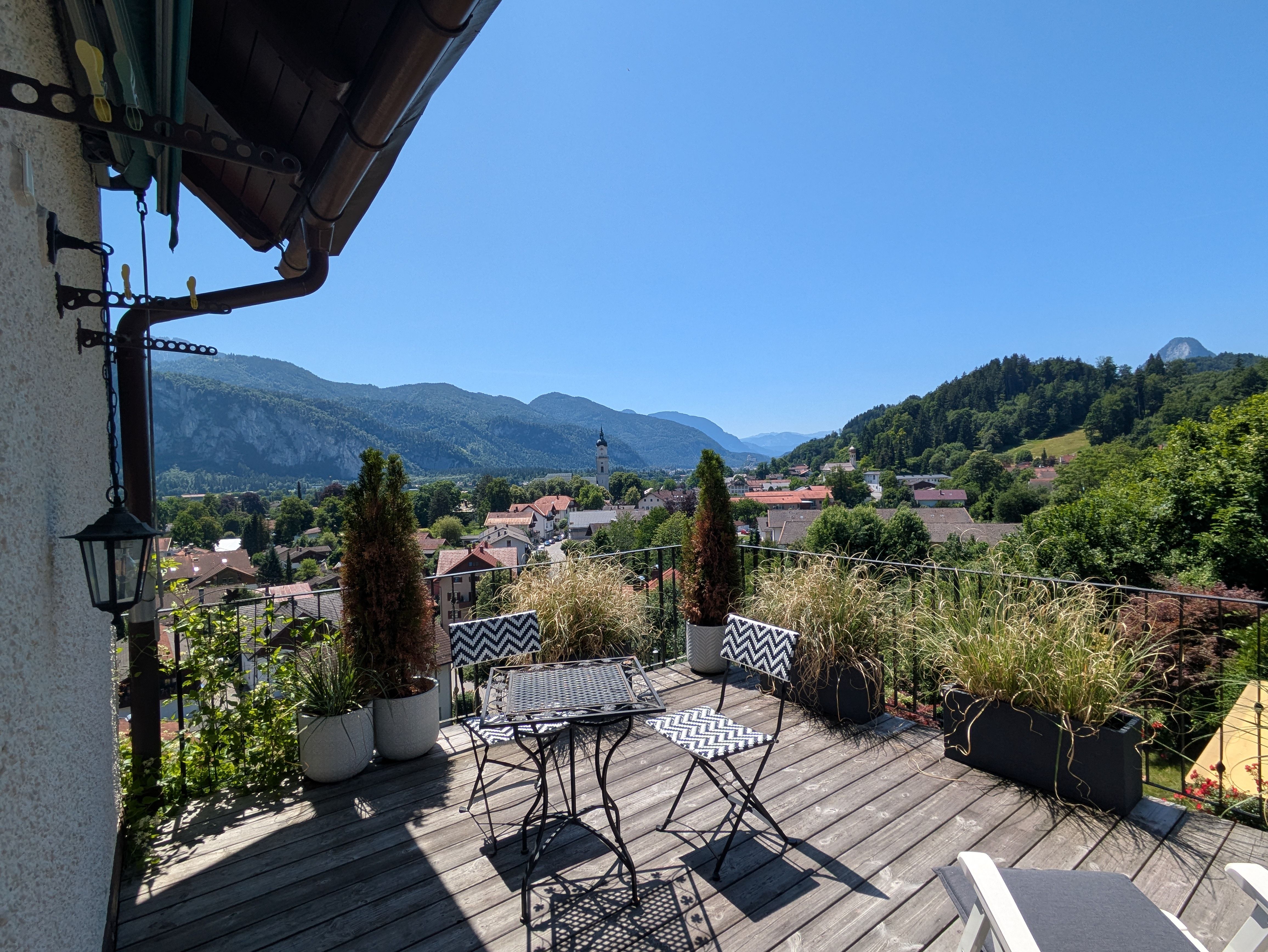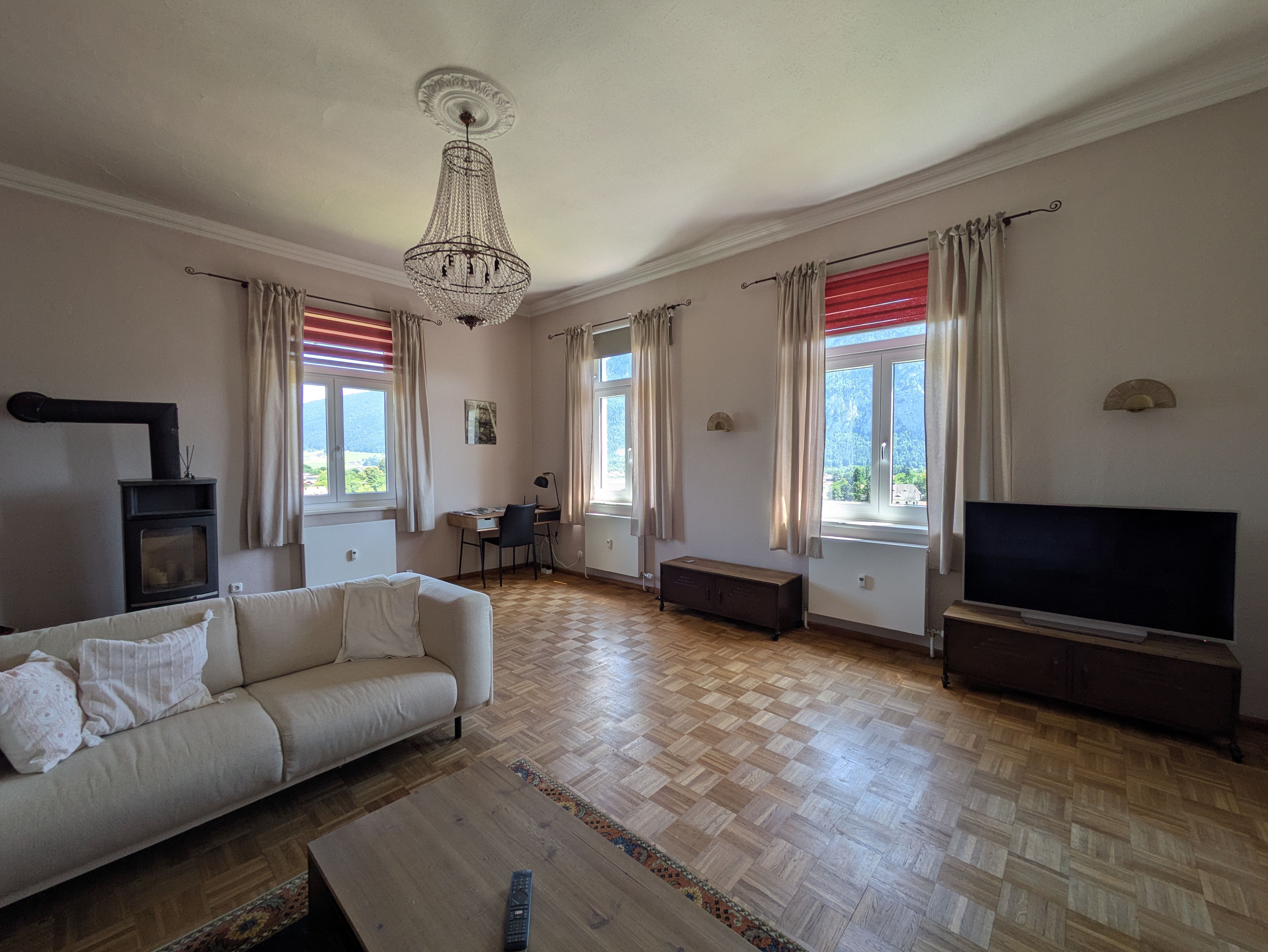 Repräsentatives Anwesen aus dem Baujahr 1903 in exponierter Lage über den Dächern von Kiefersfelden mir freiem Blick auf das Inntal und die Festung Kufstein, direkt am Fuß des Buchberg's gelegen. Die Wohnung liegt im 1. Stock und ist aus ursprünglich 2 Wohnungen zusammengefügt. Sie hat daher 2 Schlafzimmer in jeweils abgetrennten Bereichen mit zugehörigem hochwertigem Badezimmer - eines mit Waschmaschine, Dusche und WC und das andere mit holzverkleideter Badewanne und WC. Die Raumhöhe beträgt bis zu 3,30 m mit stuckverzierter Decke. Ein großes Wohnzimmer mit freiem WLAN-Zugang. Eine exklusiv vollausgestattete Wohnküche mit Terrassenzugang und einem Esstisch für 6 Personen. Ein besonderes Highlight ist die 20 qm große Terrasse mit freiem Blick ins Inntal und die umliegenden Berge. Die Wohnung ist am besten geeignet für 4 Personen, welche auf eine exklusive Wohnumgebung und gehobene Wohnqualität mit hochwertiger Ausstattung Wert legen. Aufgrund der Hanglage der Immobilie ist sie für gehbehinderte Menschen eher nicht geeignet. Die Anfahrt erfolgt über eine schmale teils steile Anwohnerstrasse.