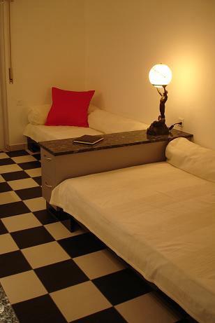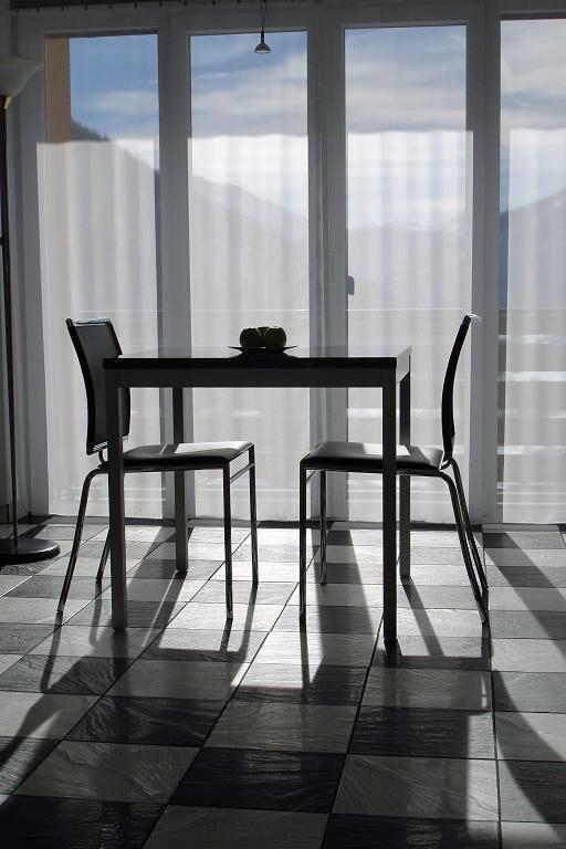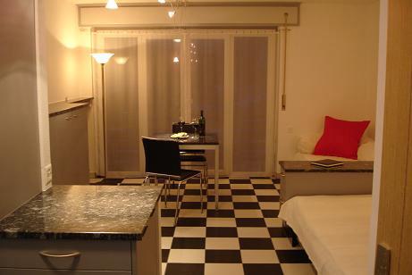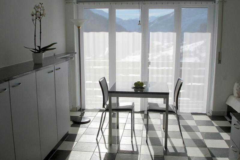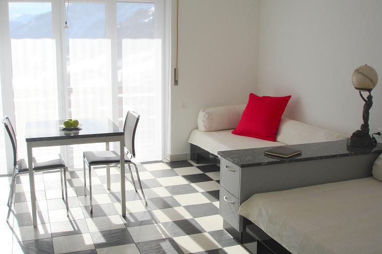 1-Zimmerwohnung: top renoviert, oberste (3.) Etage, Wohn-/Schlafzimmer mit 1 Französisch- und 1 Einzelbett (beide Betten zur Liegewiese umfunktionierbar), offene Küche mit Geschirrspüler, Dusche/WC, grosser Südbalkon mit Panoramaaussicht, Radio, TV, DVD, gratis W-Lan. Aussenparkplatz gratis. Nichtraucher Wohnung.