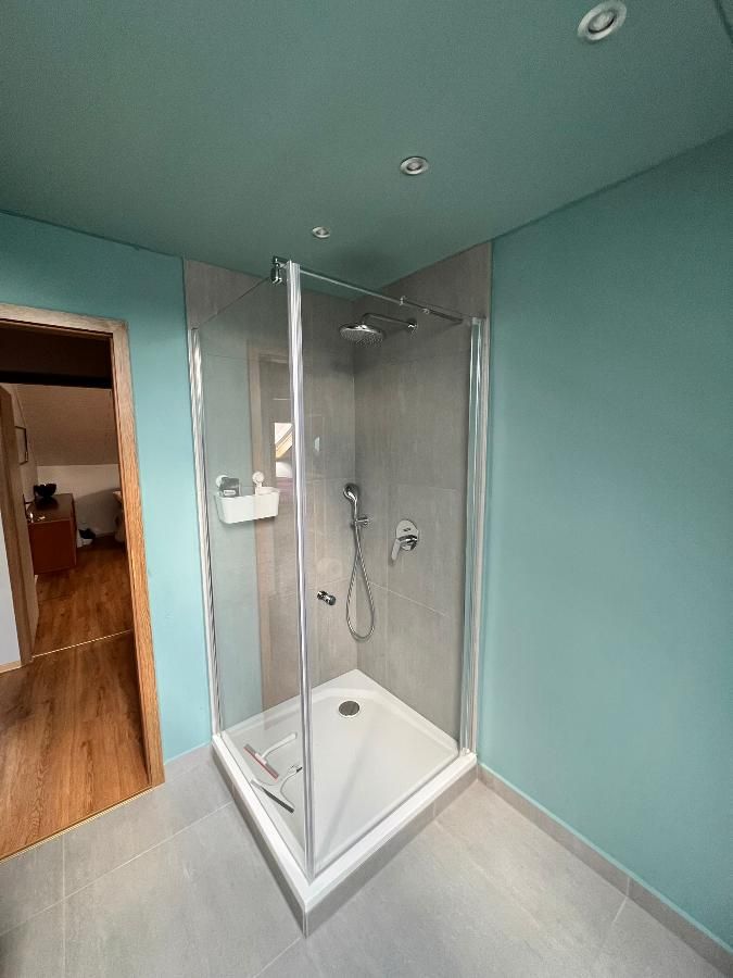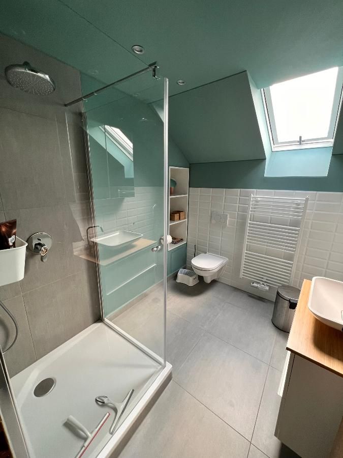 • Modernes Badezimmer mit Dusche und WC und Waschmaschine