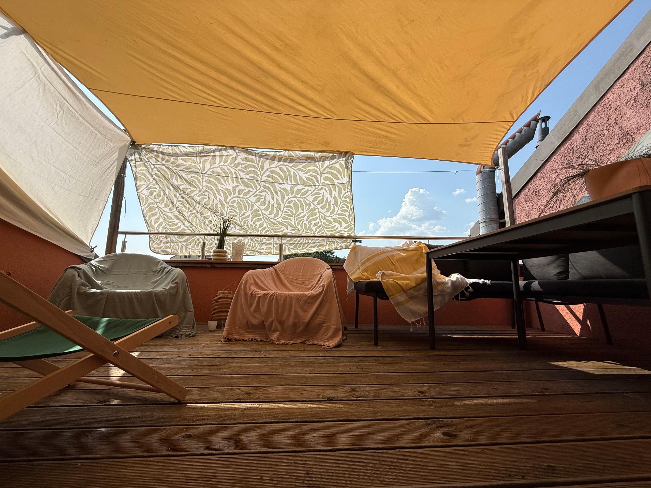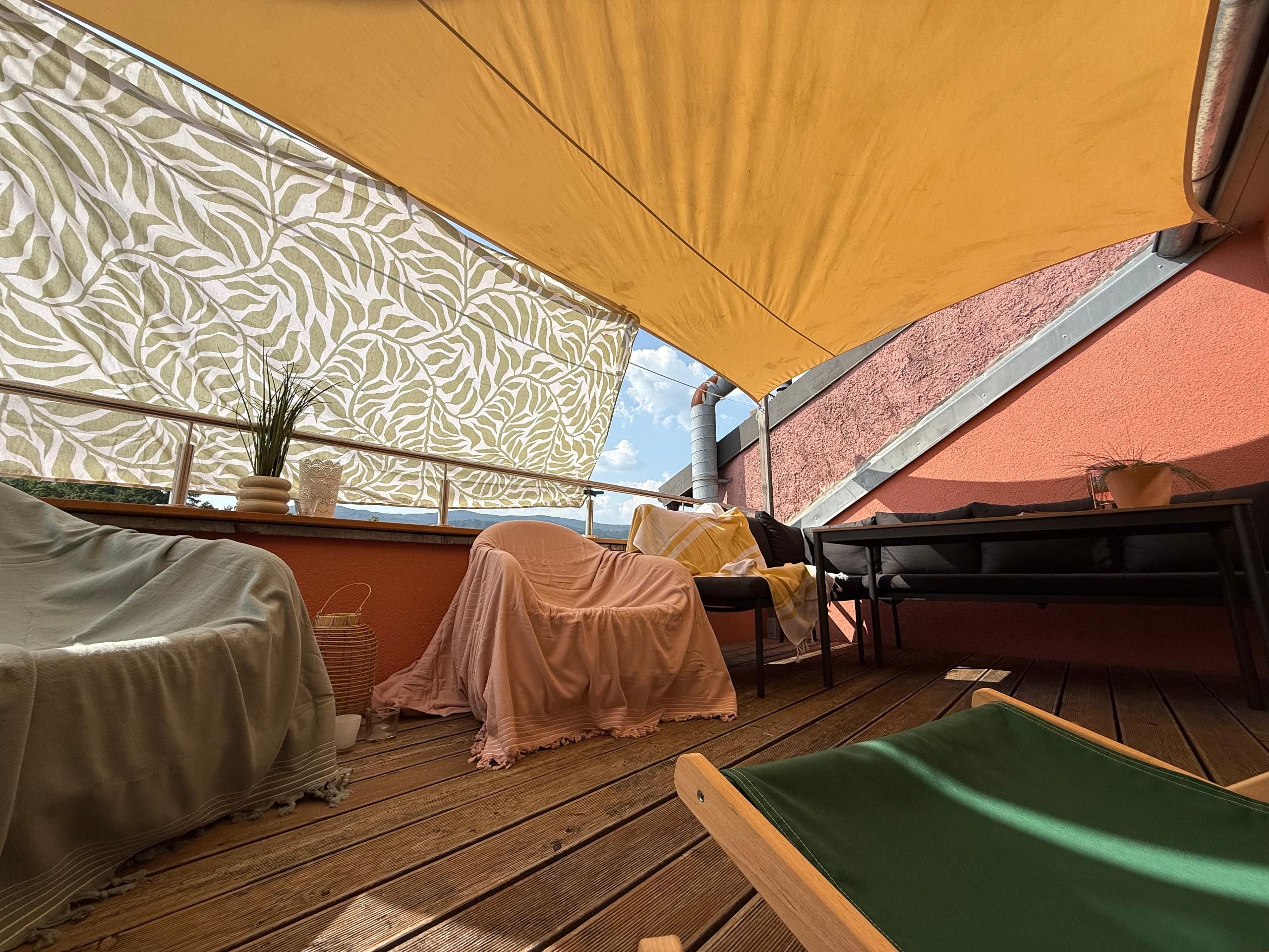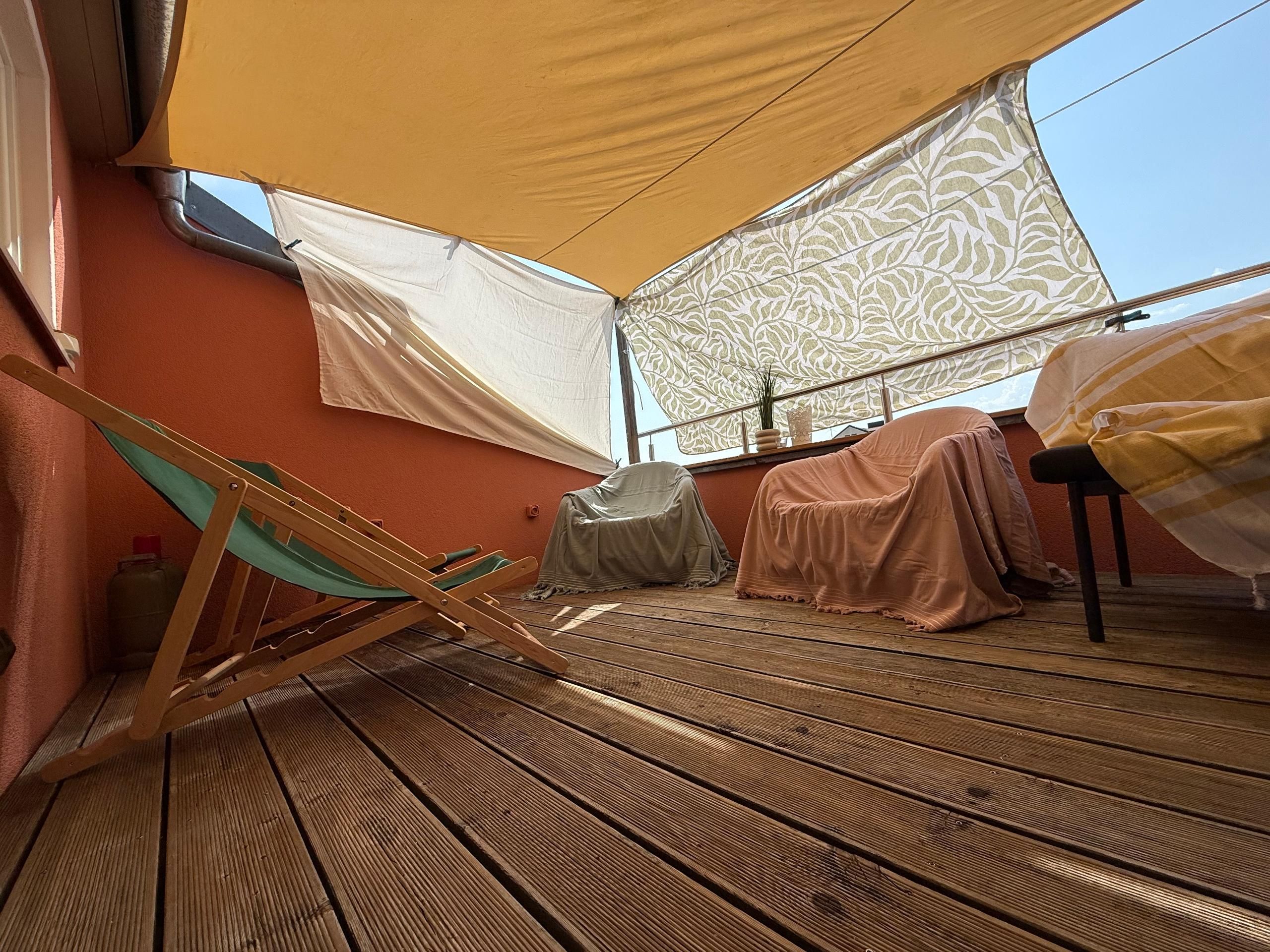 • Dachterasse mit Sonnensegel, Gasgrill, Liegestühlen usw.