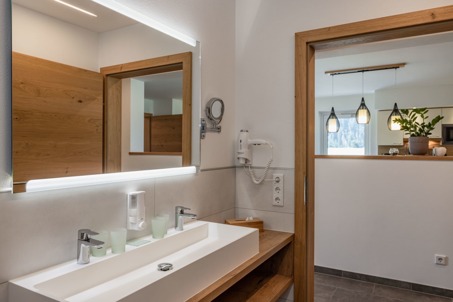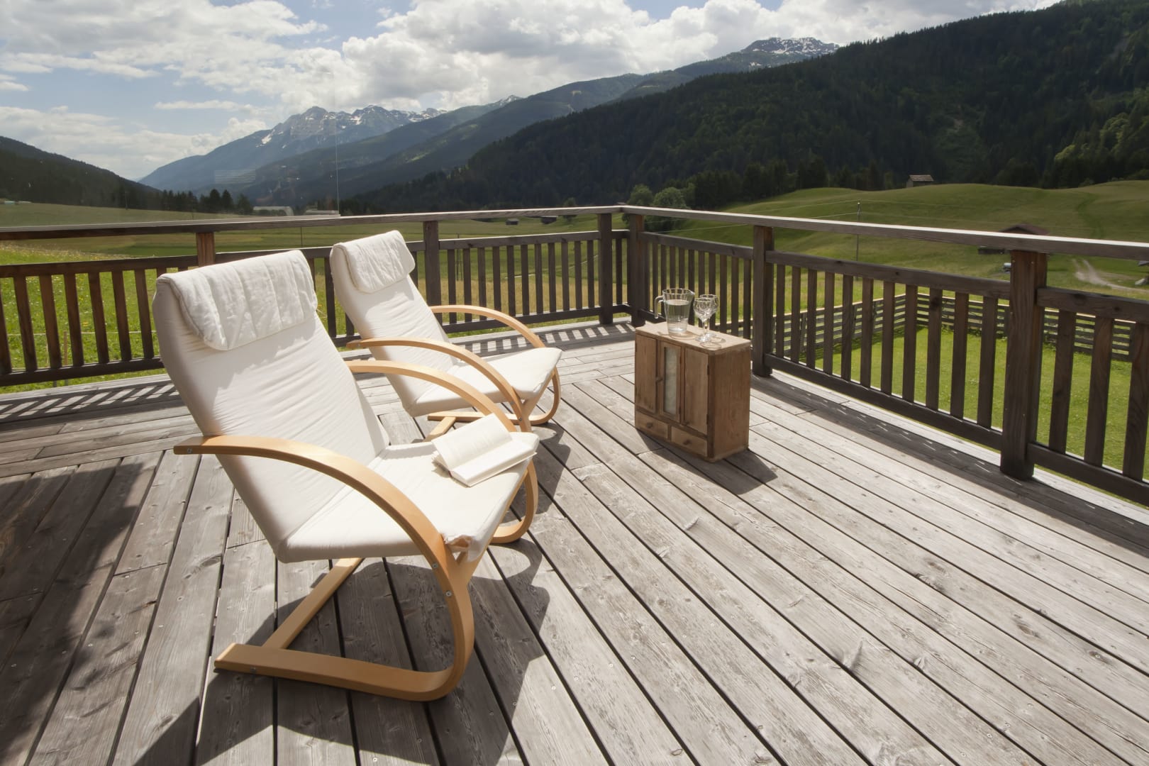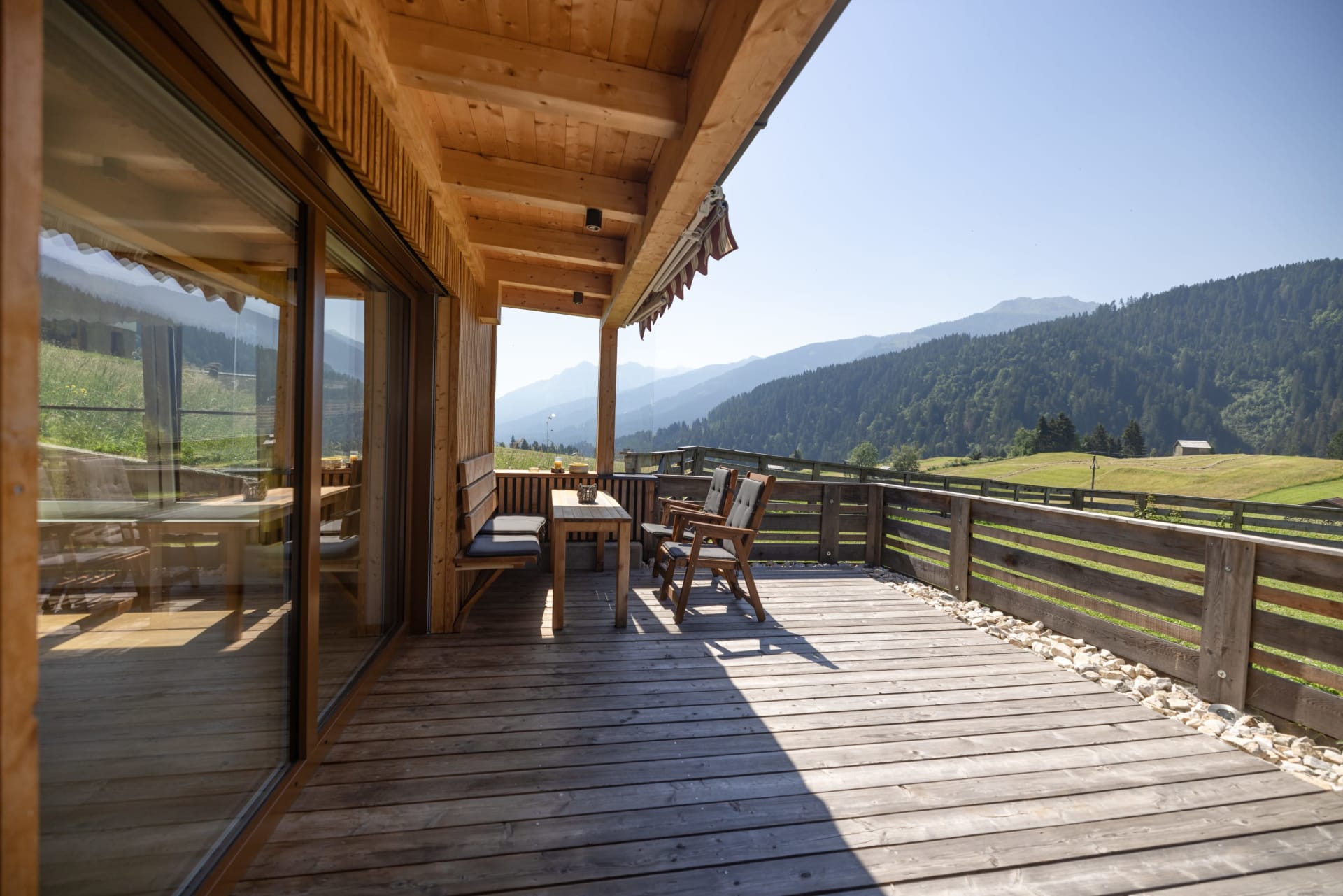 Unsere Ferienwohnung Bergkristall wurde 2021 neu errichtet: Ausstattung und Ausblick dieser Einheit sind alpenländisch und luxuriös. Heimisches Eichen und Zirbenholz wurde geölt, sodass der Duft des Holzes den Raum erfüllt. Leinen, Baumwolle und Naturstein erzeugen ein Wohlfühlambiente mit Ausblick auf die karnische, tief verschneite Bergwelt. Eine ebenerdige Terrasse erweitert den Wohnraum.