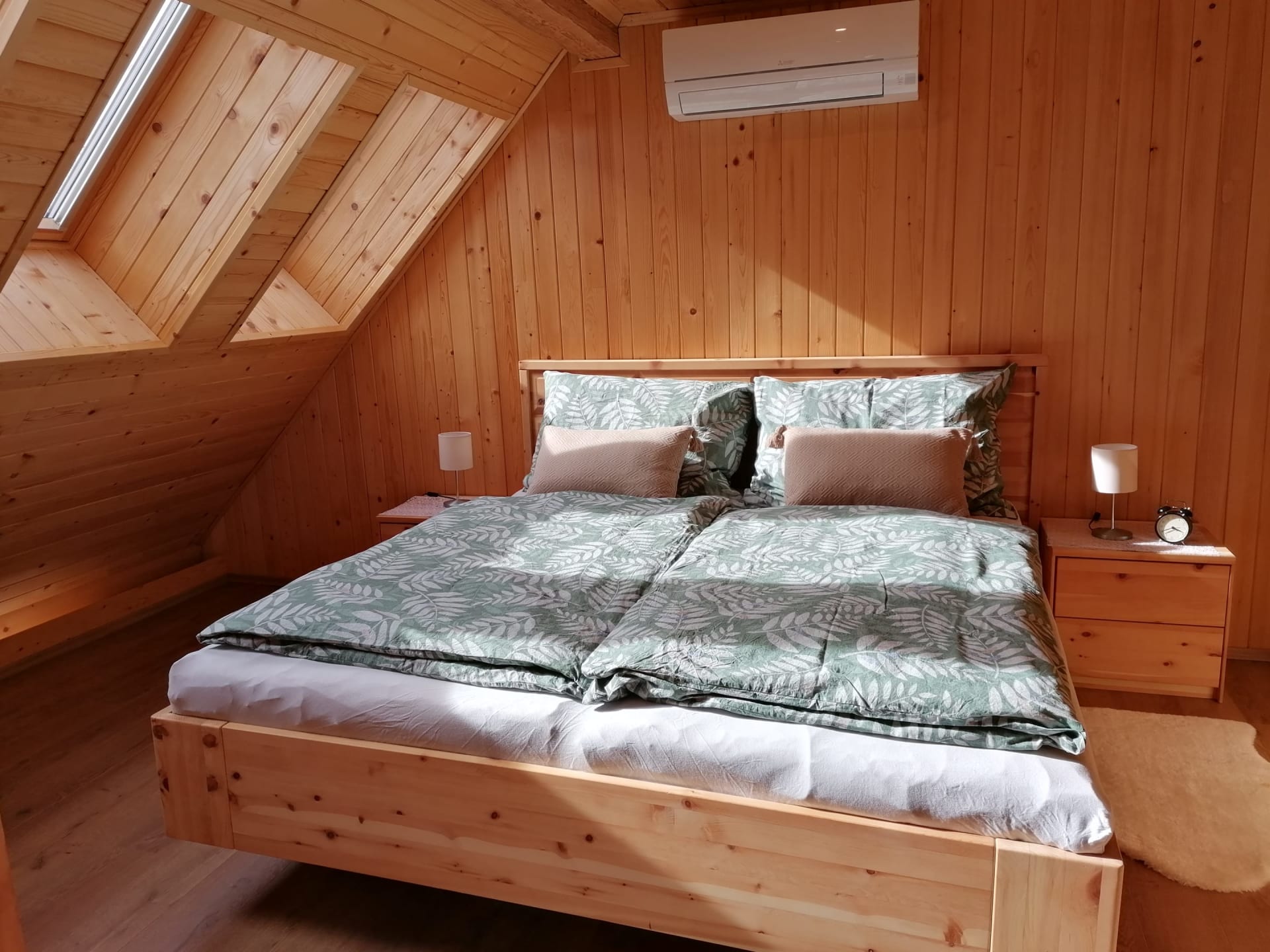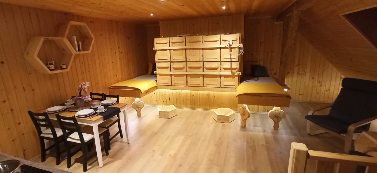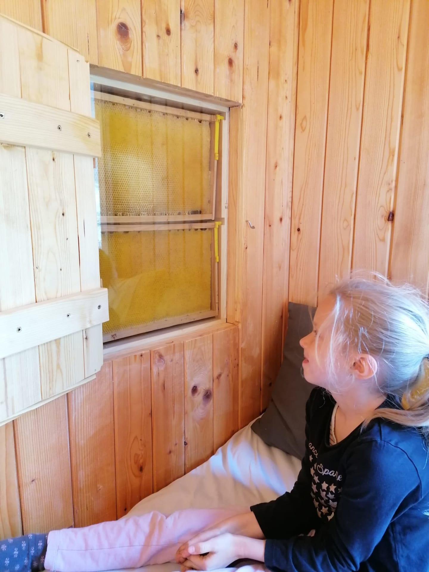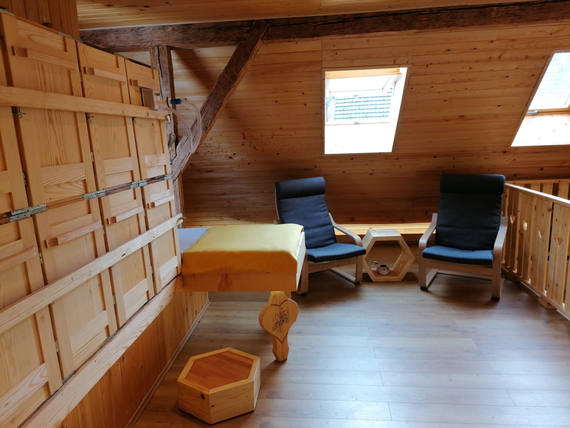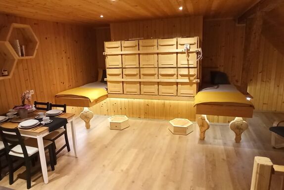 Das Chalet befindet sich im 2. Stock der ehemaligen Scheune, die mit viel Liebe umgebaut wurde. An der Vorderseite des Chalets befinden sich Bienenstöcke. Dadurch können die Gäste die Bienen beobachten, sie hören und riechen. Die Gäste können Bienenstockluft und Propolis inhalieren, die inkludierte Sauna lädt zur Entspannung ein und bei der Teebar können sich Gäste kostenlos bedienen.