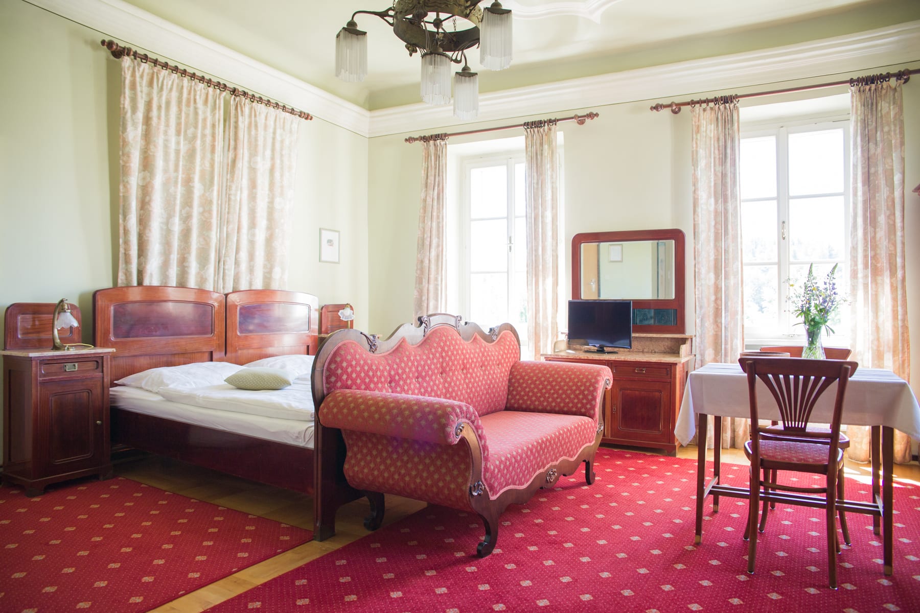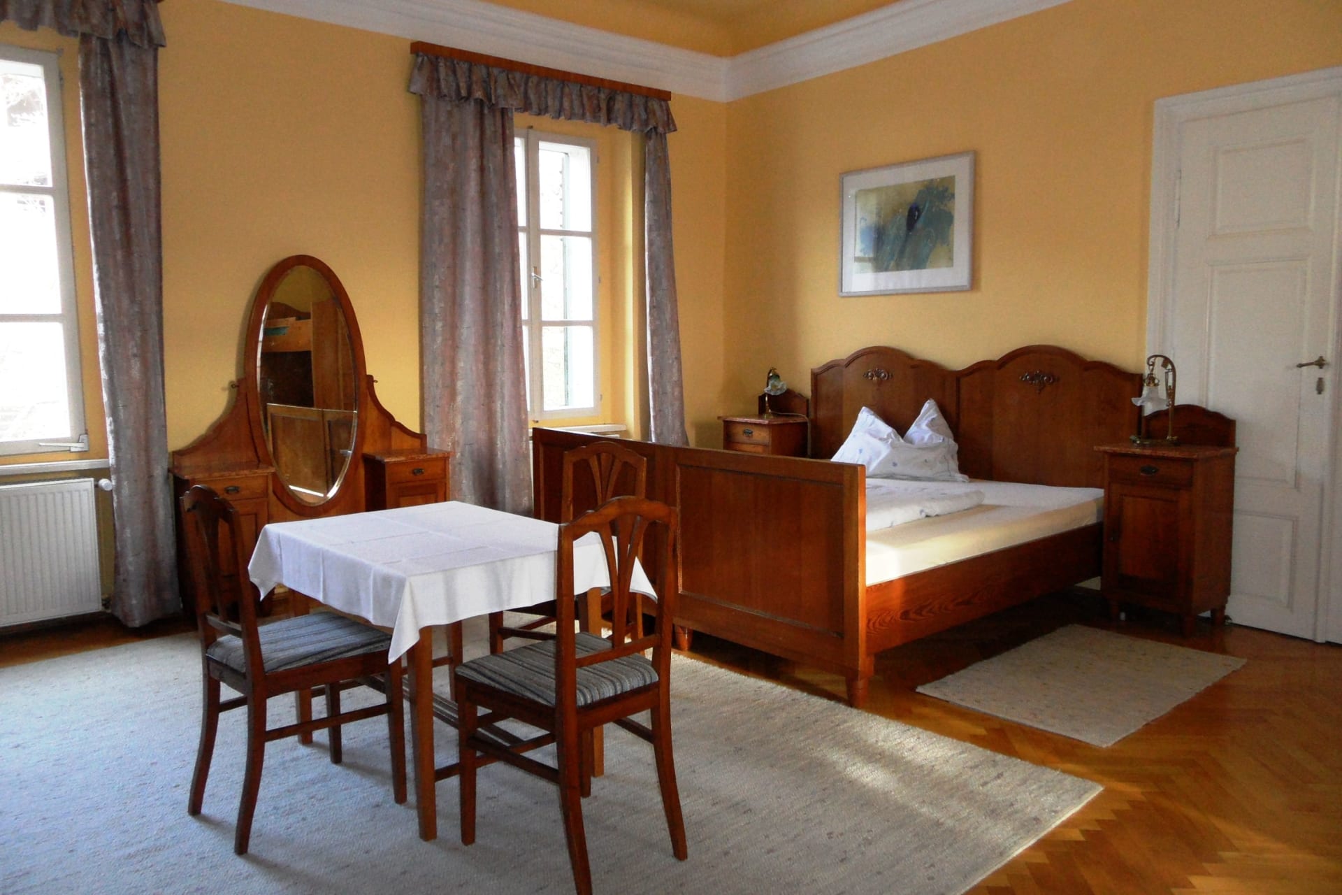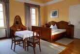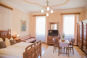 Das Korezimmer bietet Platz für 4 Personen, 1 Doppelbett und 1 Stockbett sind vorhanden. Unsere großen Zimmer (38-40m²) vereinen hohen Komfort und ein historisches Ambiente. Jedes Zimmer besticht durch seine Einzigartigkeit: stilvolle, antike Vollholzmöbel haben alle ihre eigenen Geschichten zu erzählen – teilweise sind noch originale Kachelöfen, spätbarocke Stuckspiegel und Tafelparkettböden erhalten. Jedes Zimmer mit eigenem Bad sowie TV. Gästeküche und TV-Raum vorhanden.
