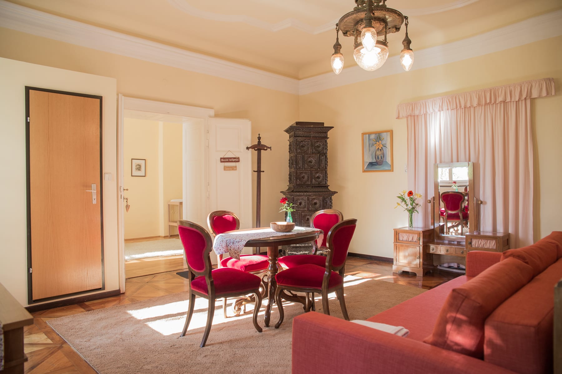 Die hohen Räume unserer Gästezimmer sind mit antiken Vollholzmöbeln ausgestattet, haben alte Kachelöfen und originalgetreue Lampen, Stuckaturen oder Tafelparkettböden und verzaubern mit ihrem einzigartigen Charme.