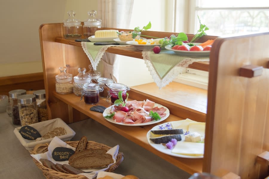 Zum Frühstück erwartet Sie ein reichhaltiges bäuerliches Buffet mit hauseigenen Produkten wie selbstgemachter Marmelade und Kuchen, Schinken- und Wurstwaren, Obst und Gemüse aus dem Garten sowie Eier, Topfen, Honig, Brot und Gebäck von nahegelegenen Bauernhöfen.