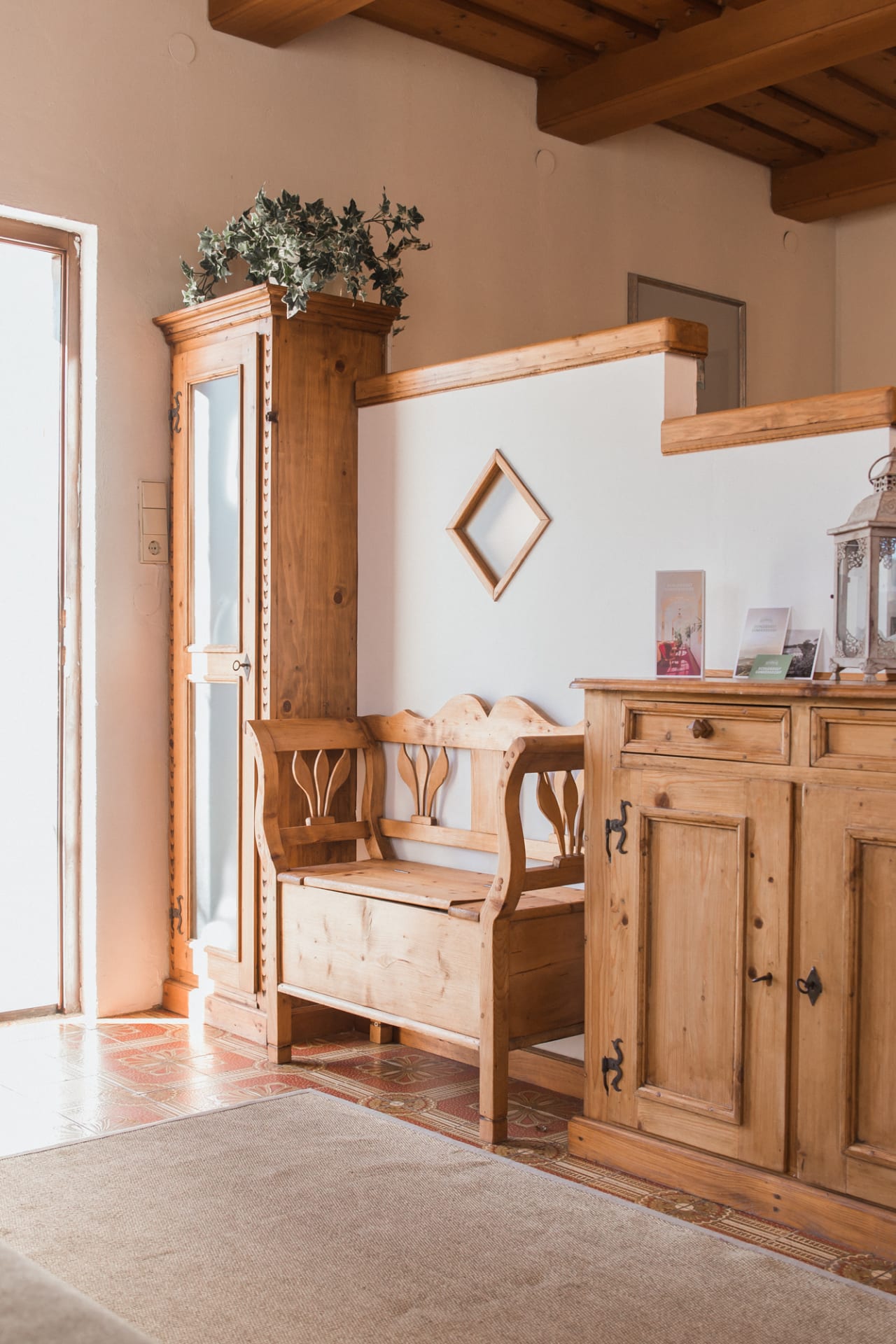 Vom Garten aus separater Eingang. Mit Vollholzmöbeln, gefertigt aus Altholz, eingerichtet.