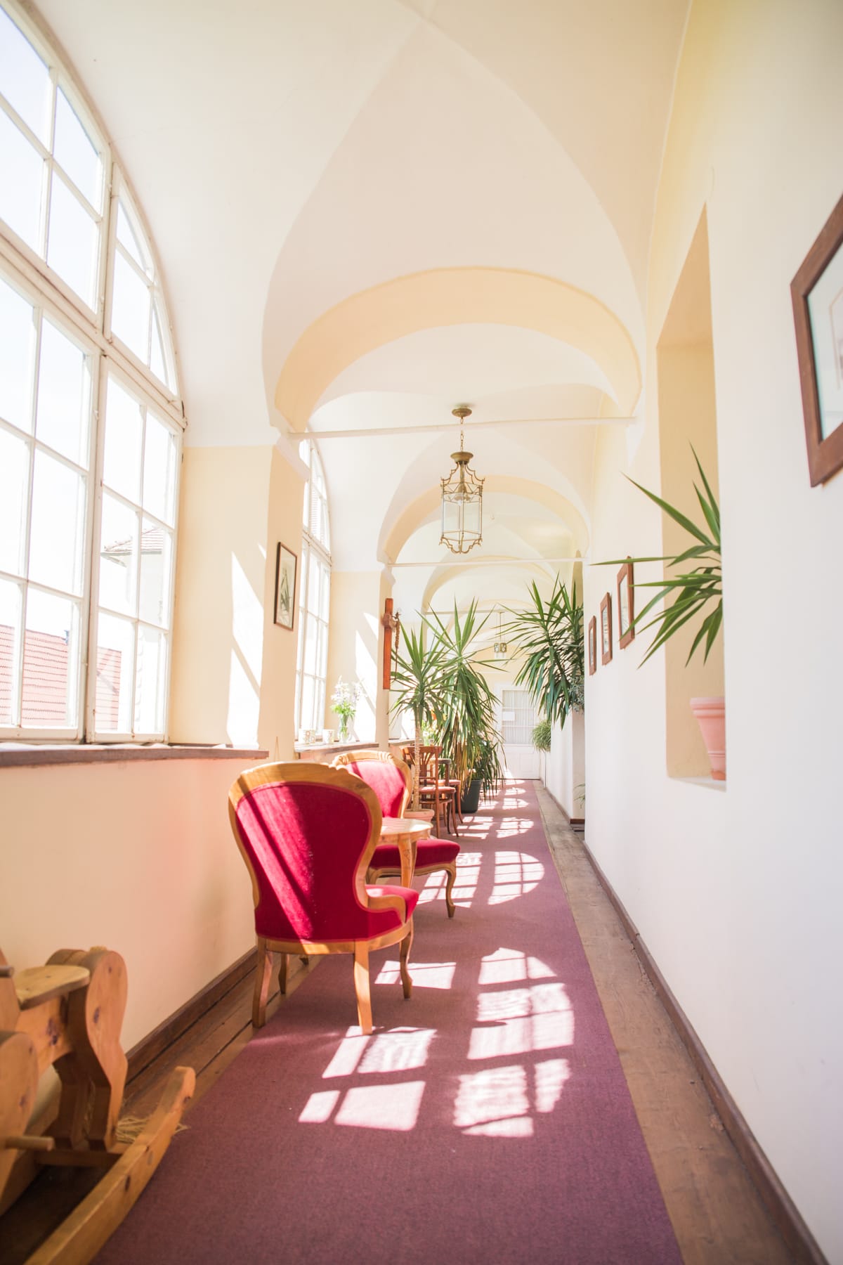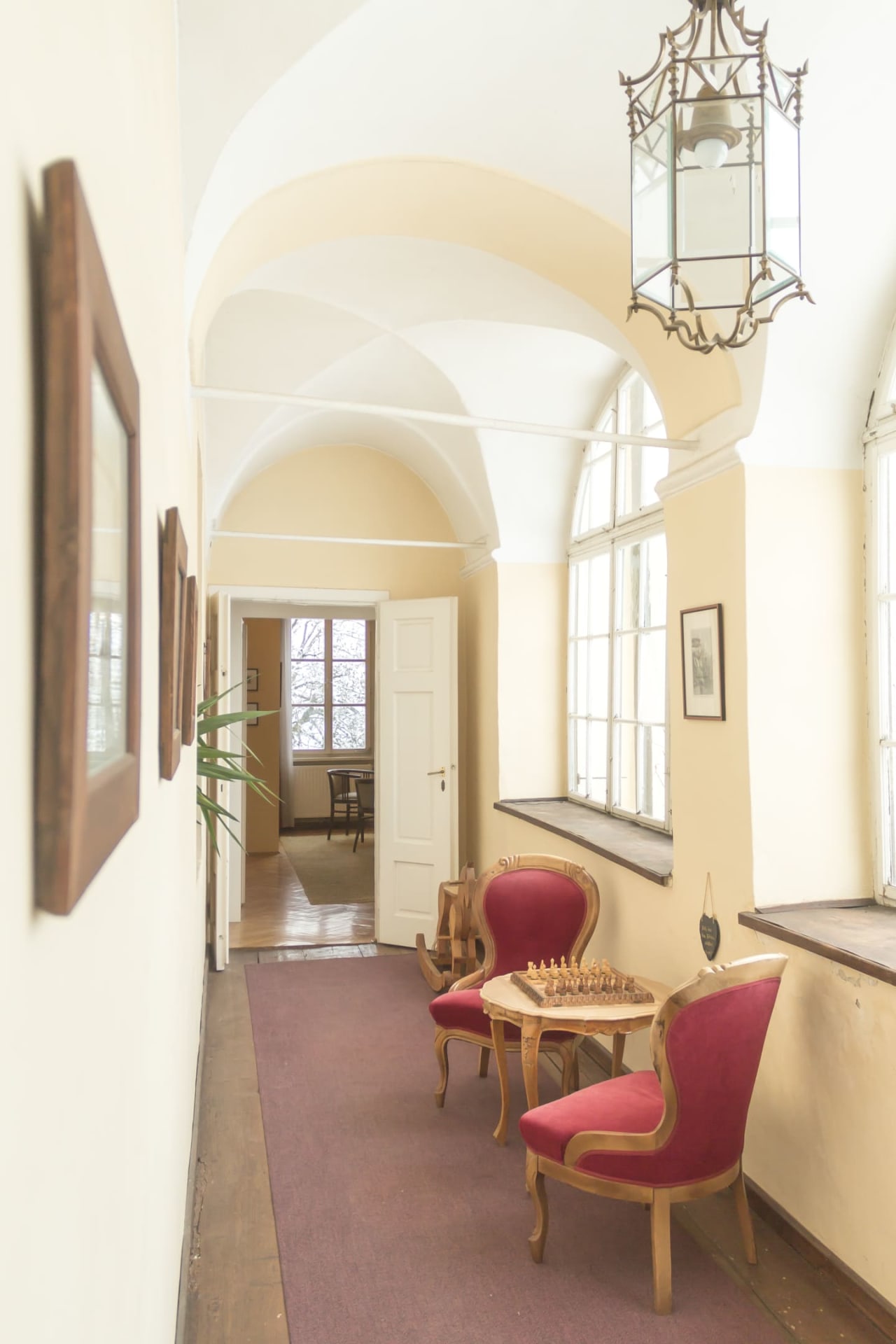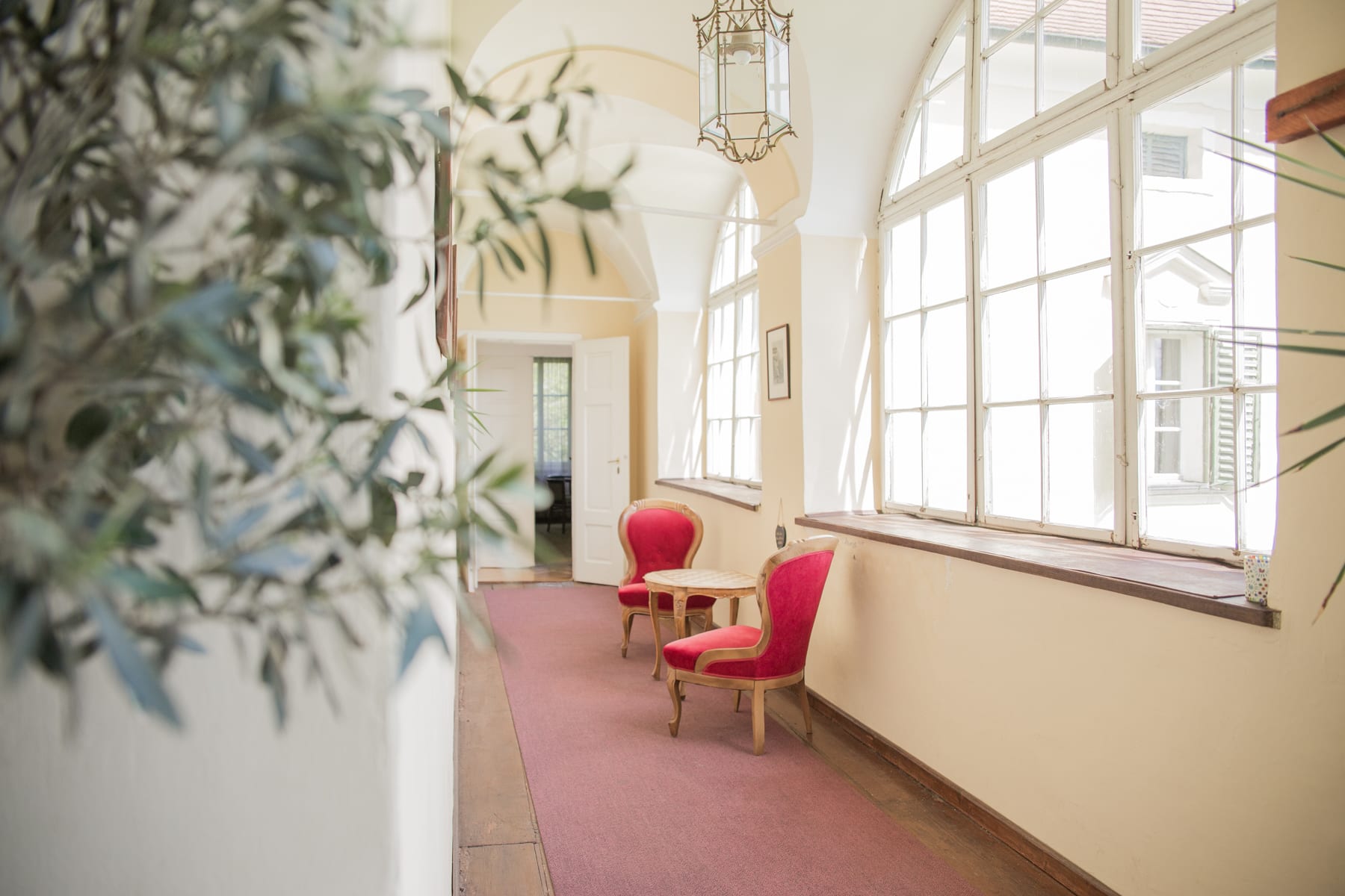 Die hohen Räume unserer Gästezimmer sind mit antiken Vollholzmöbeln ausgestattet, haben alte Kachelöfen und originalgetreue Lampen, Stuckaturen oder Tafelparkettböden und verzaubern mit ihrem einzigartigen Charme.
