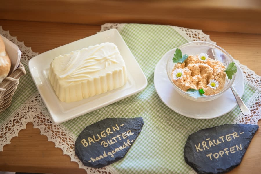 Zum Frühstück erwartet Sie ein reichhaltiges bäuerliches Buffet mit hauseigenen Produkten wie selbstgemachter Marmelade und Kuchen, Schinken- und Wurstwaren, Obst und Gemüse aus dem Garten sowie Eier, Topfen, Honig, Brot und Gebäck von nahegelegenen Bauernhöfen.
