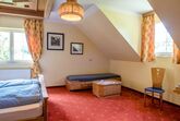 Eingerichtet mit hellen Vollholzmöbel wirkt das Zimmer angenehm und großzügig. Das extra Kinderzimmer lässt auch den Eltern Ihre Privatsphäre. Ausgestattet mit Fön Bademantel und Kühlschrank sowie Kabel-TV erhält es die 4 Blumen. Dieses Familienzimmer wird mit Frühstück angeboten.