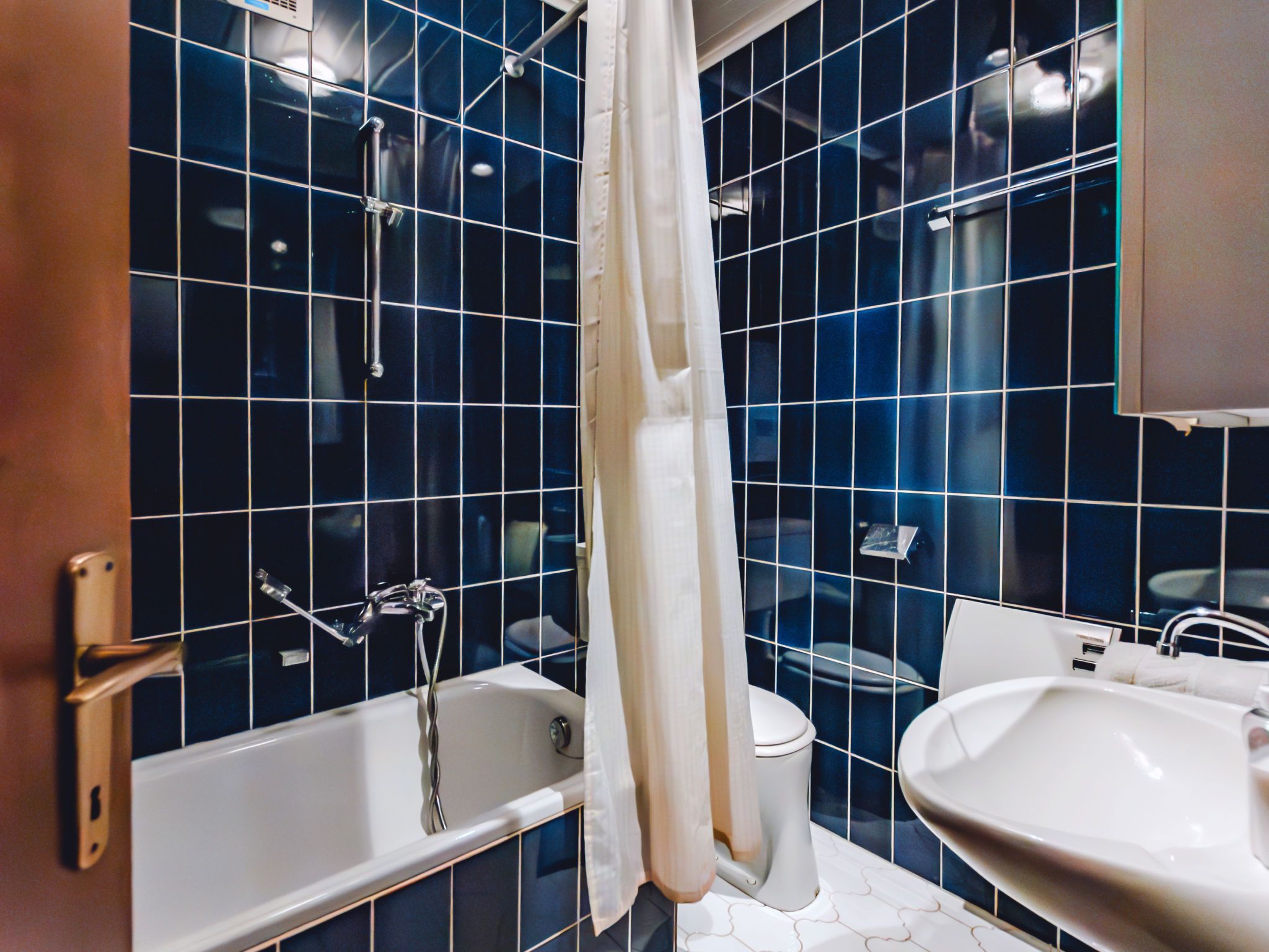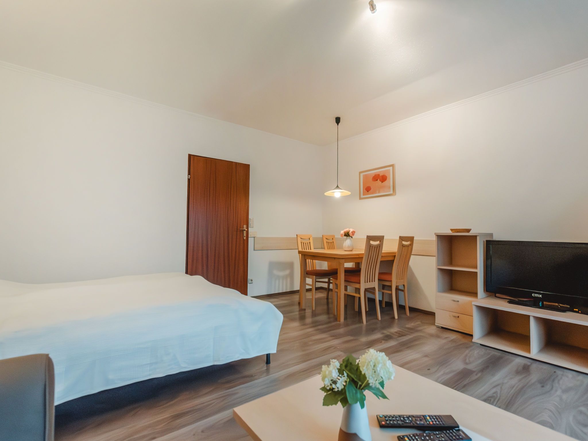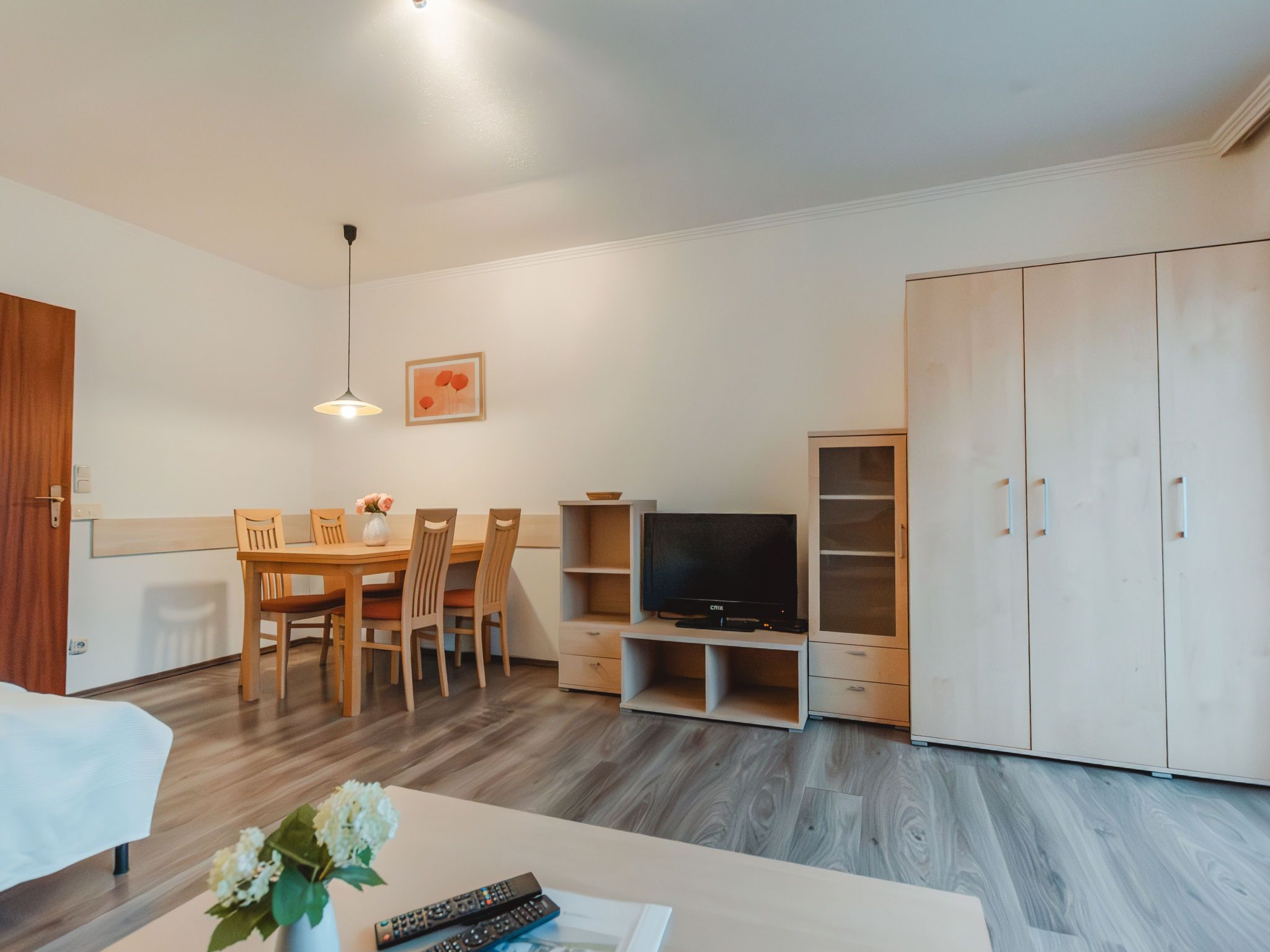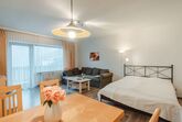 1-Zimmer-Wohnung 36 m2. Geräumig und hell, einfach und zweckmässig eingerichtet: Eingang. Wohn-/Schlafzimmer mit 1 Diwanbett, 1 Doppelbett, Esstisch und Sat-TV (Flachbildschirm), E-Heizung. Ausgang zum Balkon. Kleine Küche (2 Kochplatten, Toaster, Wasserkocher, Mikrowelle, elektrische Kaffeemaschine). Bad/WC. Parkettboden. Kleiner Balkon. Balkonmöbel. Sehr schöne Sicht auf die Berge. Zur Verfügung: Internet (WLAN, gratis). 1 Haustier/Hund erlaubt. 50403-000513-2023