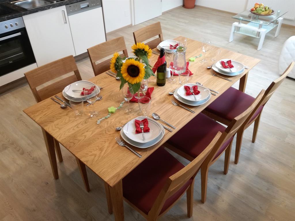 Das Appartement Zur Wagnerei besteht aus 2 Doppelbettzimmer mit je einer Couch, 1 Wohnküche mit einem Tisch für 8 Personen, 1 Badezimmer mit einem Waschtisch, Dusche und WC sowie einem Handtuchtrockner.