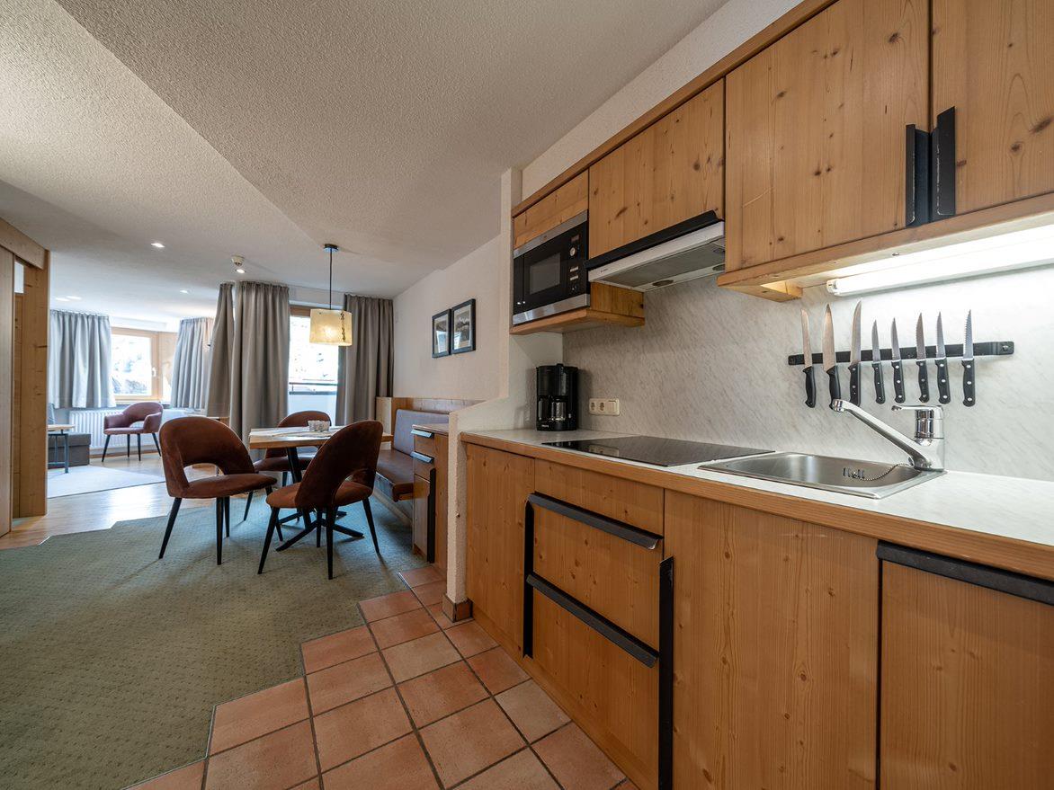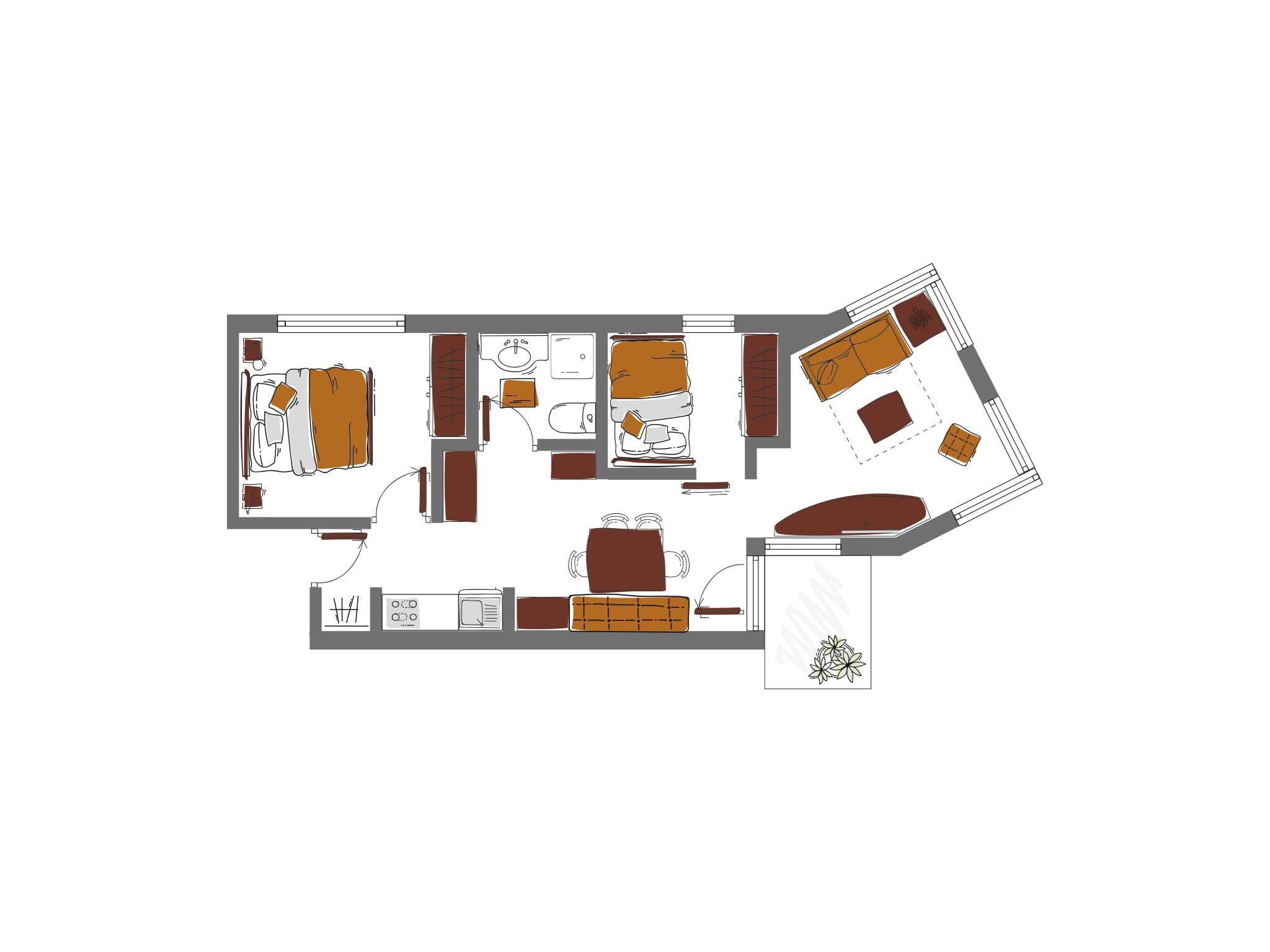Appartement für bis zu 4 Personen mit ca. 58 m²: 1 x Doppelzimmer, 1 x Zimmer mit Einzelbett, Wohnraum mit Schlafsofa, Balkon, Flat-TV, Safe, Telefon, komplett ausgestatte Küche (4-Platten-Herd, Kühlschrank, Geschirrspüler, Kaffeemaschine, Wasserkocher, Sodastream, Toaster, Mikrowelle, Geschirr, Besteck, Kochgeschirr) und 1 Badezimmer mit Dusche/WC.
