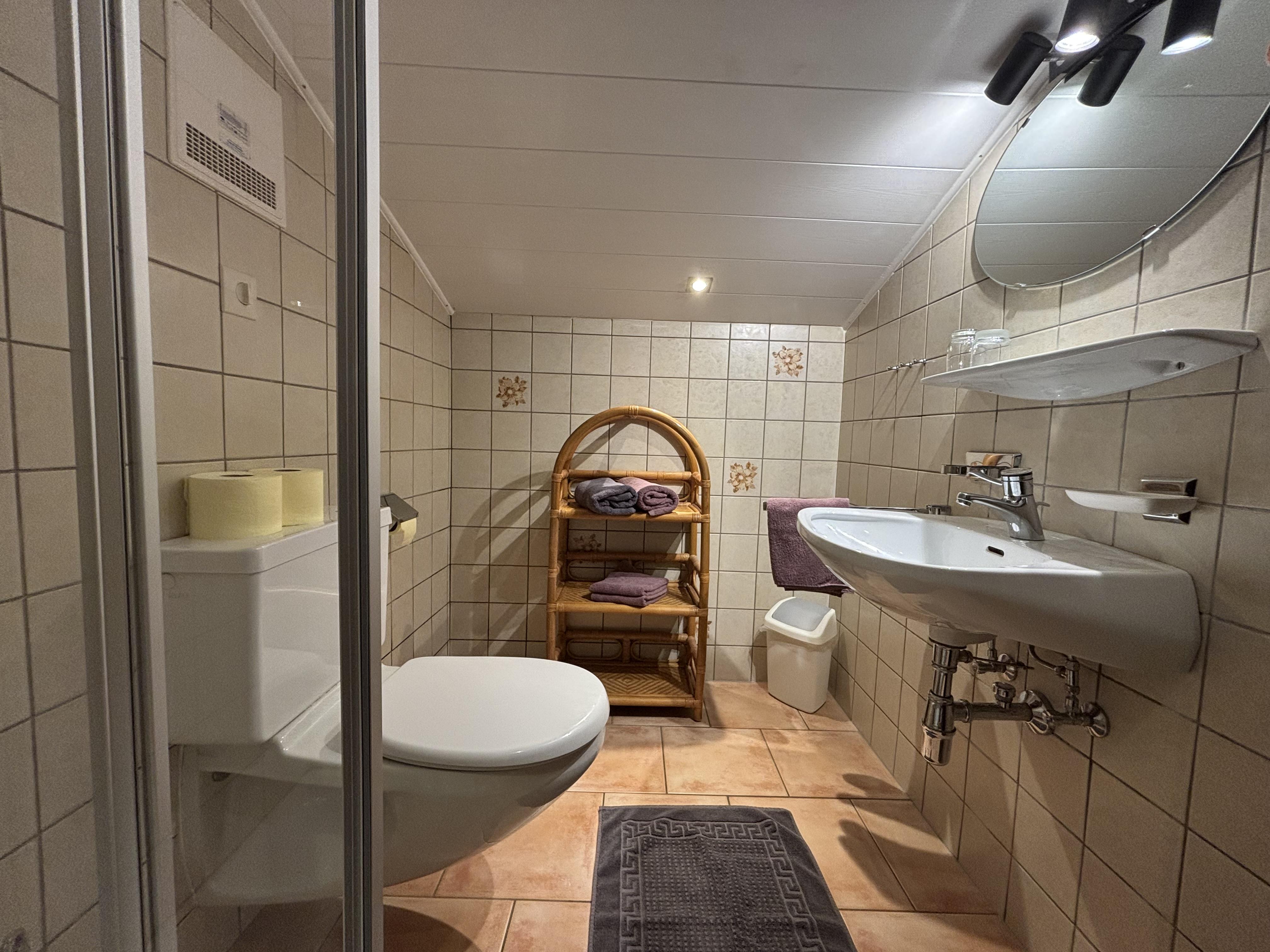 Ferienwohnung mit 1 Doppel- und 1 Dreibettzimmer, Spiegel und Ablage, BAD mit Dusche/WC, Wohn-Küche mit Ausziehcouch, große Eßecke, Geschirr-spüler, Mikrowelle, E-Herd mit Backofen, Kühlschrank, Kabel TV, Radio, W-LAN, Balkon,eigene Terrasse.
