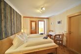 Mit Vollholzmöbeln eingerichtete Familieneinheit bestehend aus einem Doppelzimmer und einem Zweibettzimmer mit Verbindungstür. Beide Zimmer mit Du/WC und großem Balkon einmal Richtung Osten und einmal Richtung Süden.