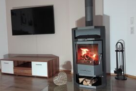 Wohnzimmer mit Ausziehcouch, Kaminofen und Flachbild SAT-TV