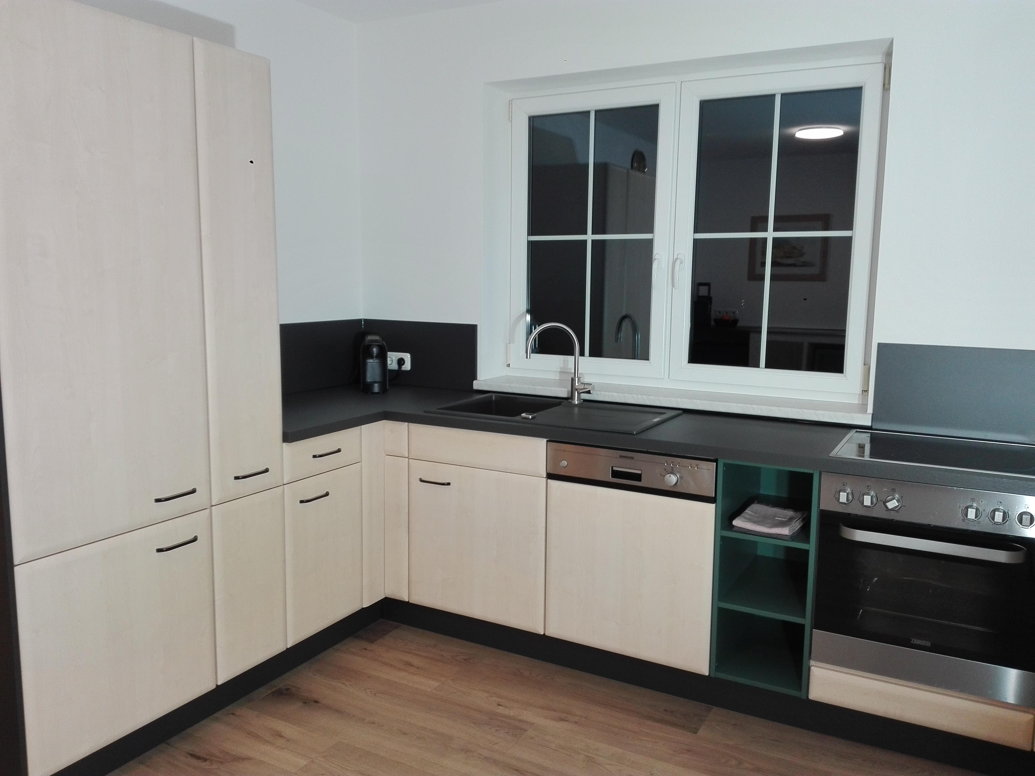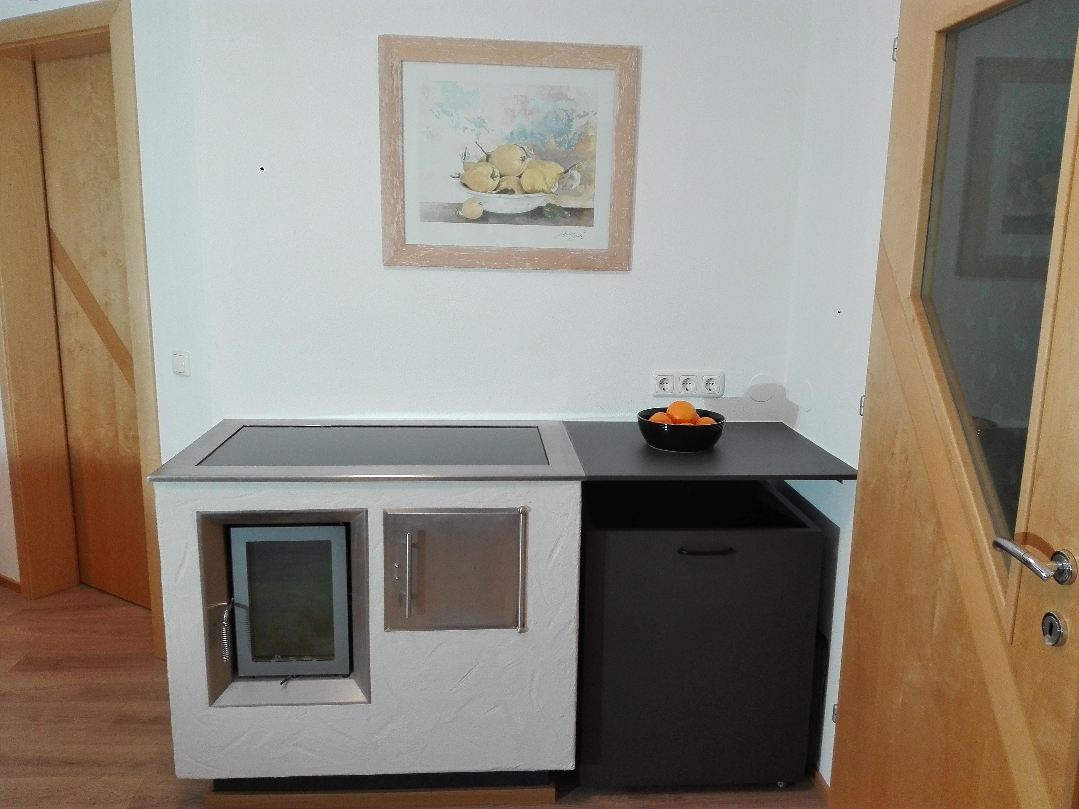 Küche mit E-Herd, Kühlschrank, Geschirrspüler, Backofen, Kaffeemaschine und Holzherd