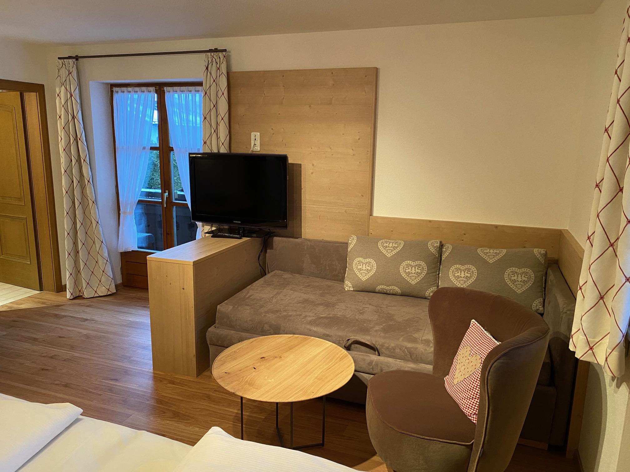 Das Apartment Hohes Schloss befindet sich im ersten Obergeschoss mit sonnigem Westbalkon. Kombinierter Wohn-Schlaf-Raum mit bequemen Doppelbett, Schlafsofa, Esstisch, TV. Durch einen Rundbogen abgetrennte Küche. Bad mit Fenster, Dusche, WC, Waschbecken und Fön.