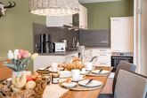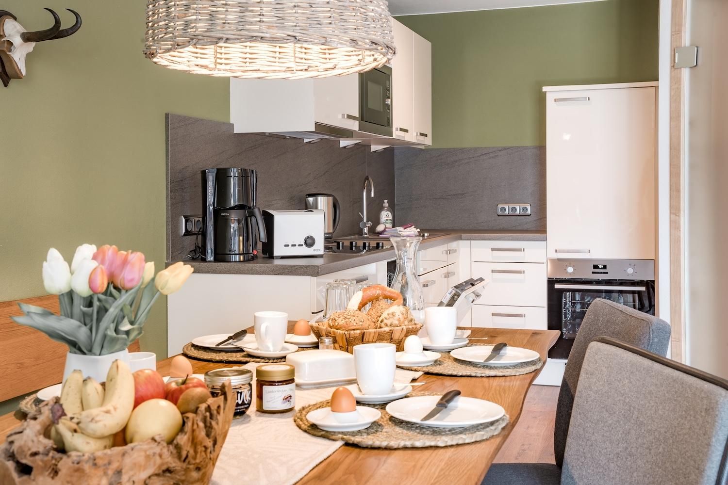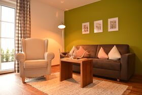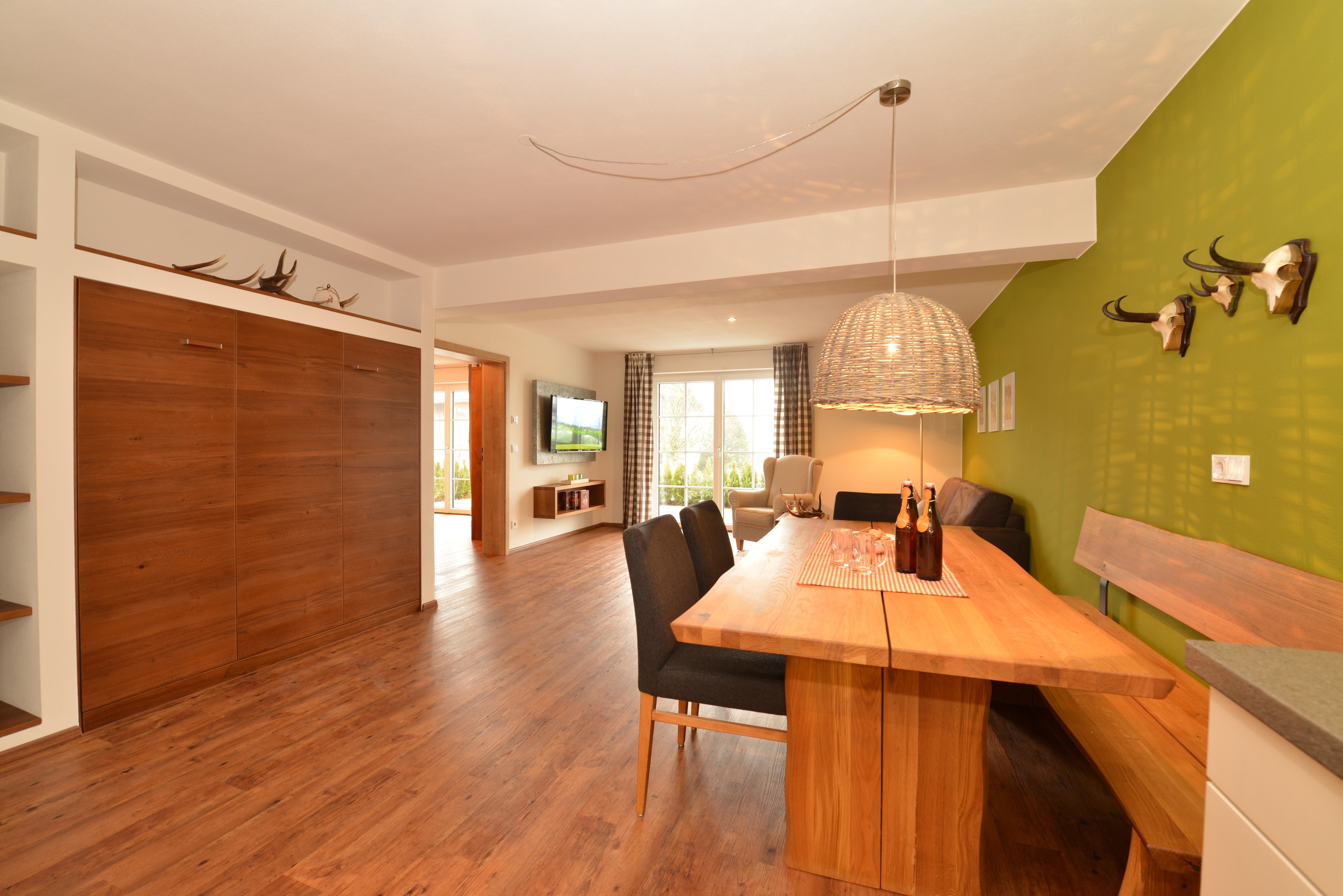 Das Appartement 202 (barrierefrei), 94 qm, im modernen Landhausstil ausgestattet, mit Designböden, liegt im EG mit Süd-Ost-Terrasse und freiem Blick auf die Oberallgäuer Bergwelt. Wohnzimmer mit Sitzecke, Flachbild-TV, gemütliche Essecke und komplett ausgestattete Küche mit allem Komfort. 2 Schlafzimmer mit Doppelbetten, 2 x Bad mit DU/WC. WLAN. Belegung mit 6 Personen möglich.