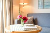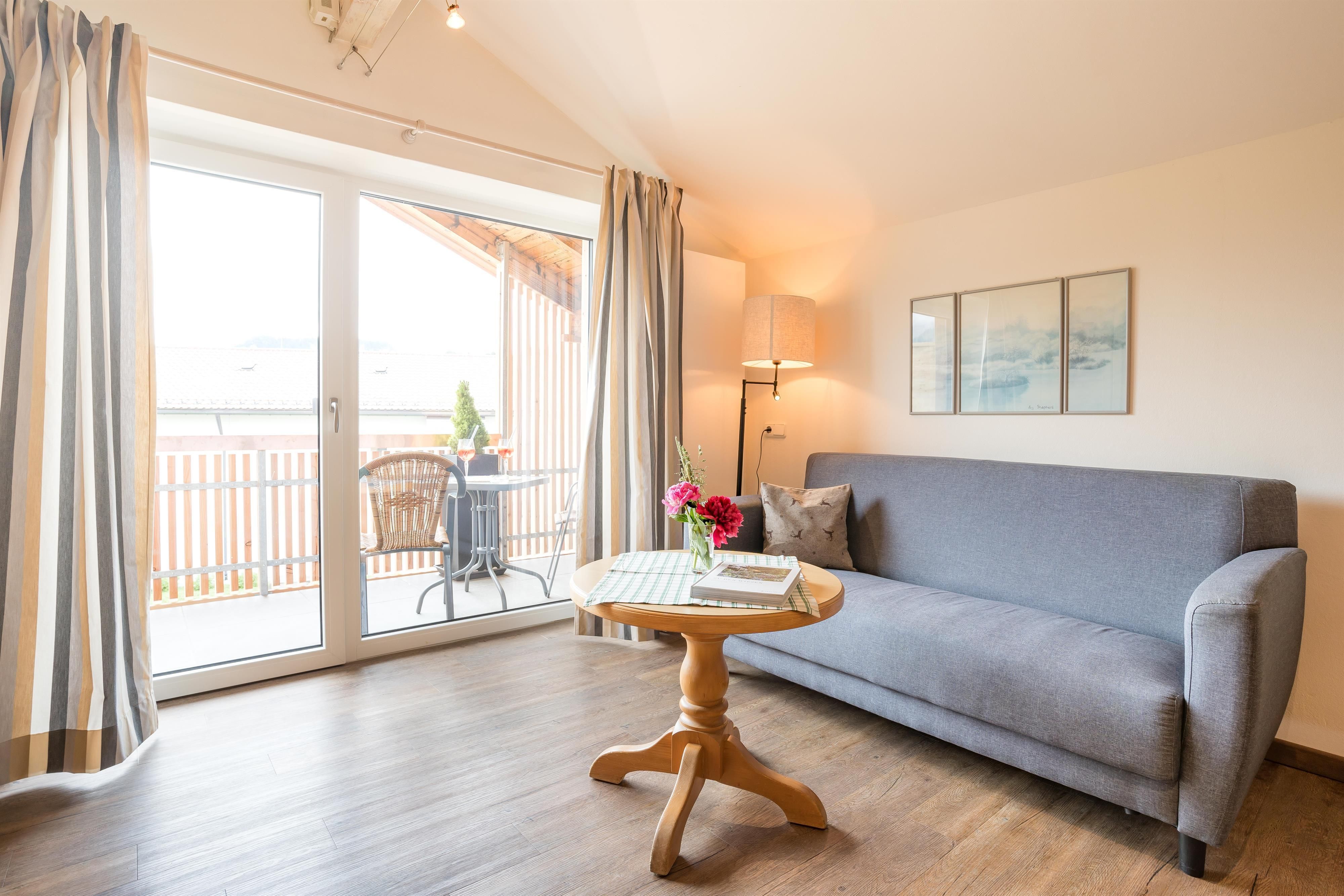 Das Appartement 07 im 2.OG, 41 qm, mit Südbalkon und freiem Blick in die Oberallgäuer Bergwelt, ist im modernen Landhausstil eingerichtet, der Wohnbereich mit Sitzecke, Flachbild-TV, gemütlicher Essecke und komplett ausgestatteter Küche. Der Schlafbereich hat ein hochwertiges Schrankbett mit großer Liegefläche ohne Fußende. Bad mit DU/WC, WLAN.