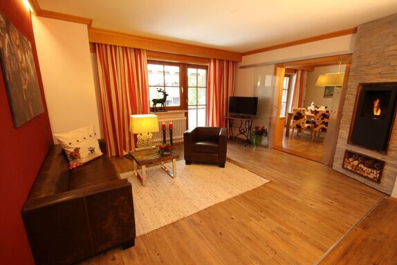 Das exklusive 4-Zi-Appartement, 98qm, im modernen Landhausstil ausgestattet, Designboden, befindet sich im 1.OG mit freiem Blick auf die Berge! Der offene Kamin im Wohnzimmer, das separate Esszimmer für 6 Pers. eine komplett ausgestattete Küche mit allem Komfort und 2 separate Schlafzimmer mit je Dusche/WC, lassen keine Wünsche offen. Das App. kann mit 6 Pers. belegt werden. Haustiere sind in dieser Wohnung nicht erlaubt.